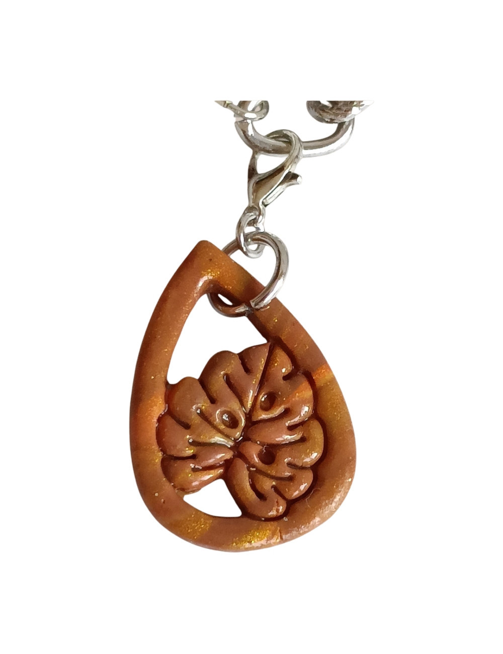 Accessoires : Porte-clés en pâte polymère Fimo, écharpe décorative.Couleurs : Beige, bleu, multicolore, orange, blanc.Matériaux : Pâte polymère Le porte-clés présente des pendentifs colorés, incluant des fleurs aux teintes bleues, multicolores et brunes. géométriques en tons orange et blanc , ajoutant une touche décorative.Couleurs des charmes.forme de feuilles marron Forme fleurs bleu Forme feuilles multicolore Pas laisser à la portée des enfants