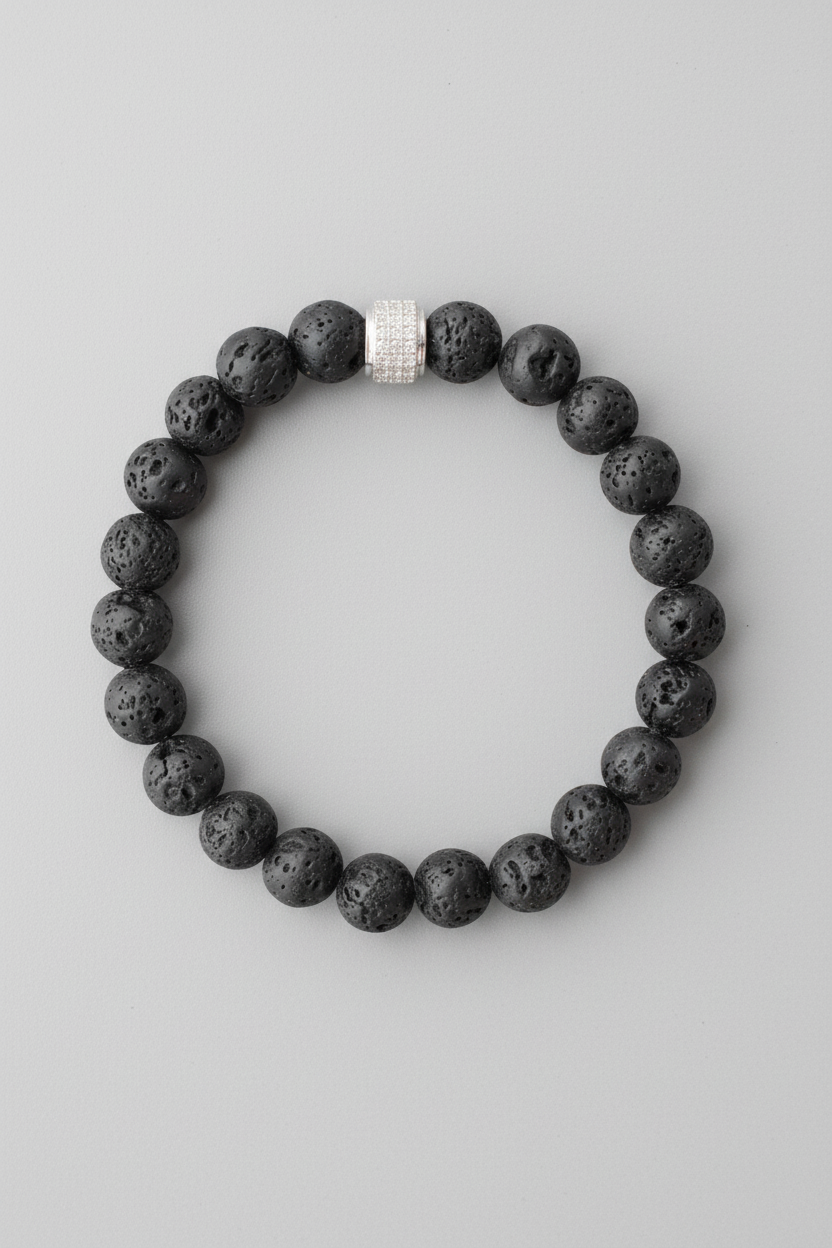J’ai imaginé ce bracelet en perles de lave comme un hommage à Achille : héros forgé par les éléments, entre puissance brute et éclat sacré. La lave, noire et ancestrale, évoque la force des volcans endormis, une énergie terrienne, contenue, indomptable. En son cœur, une perle en plaqué or blanc sertie de zircons capte la lumière comme la promesse d’un destin mythique. Ce bijou se porte comme un talisman de force intérieure, un rappel que même les invincibles ont leurs mystères.