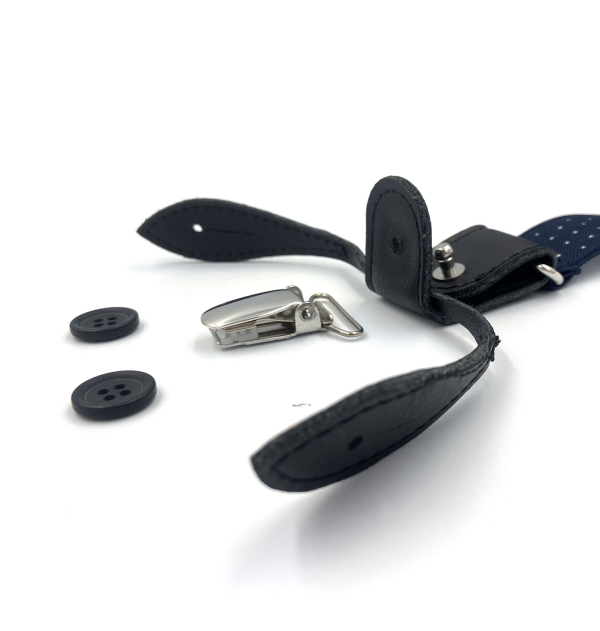 Bretelles bleu marine fines vegan hybrides à pinces ou à boutons finition en cuir de raisin noires à pois fabriquées en France.