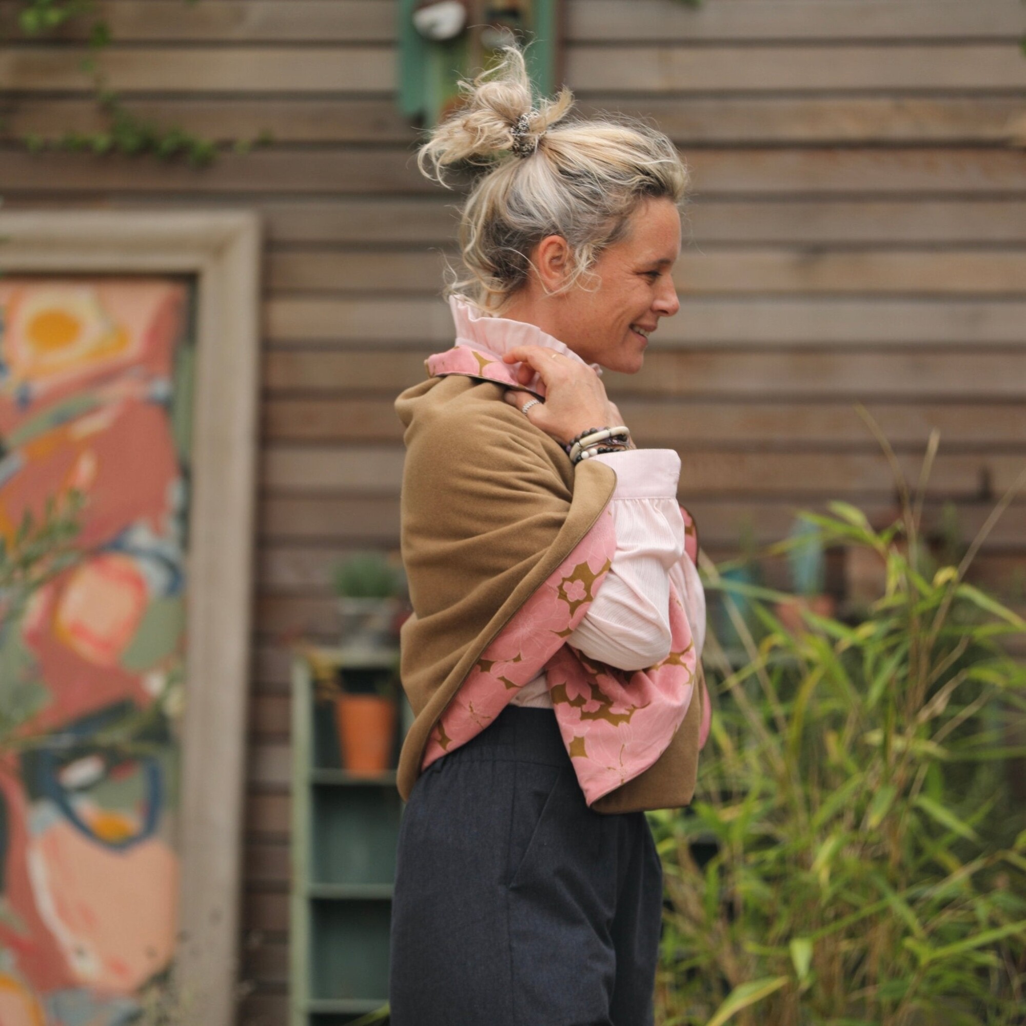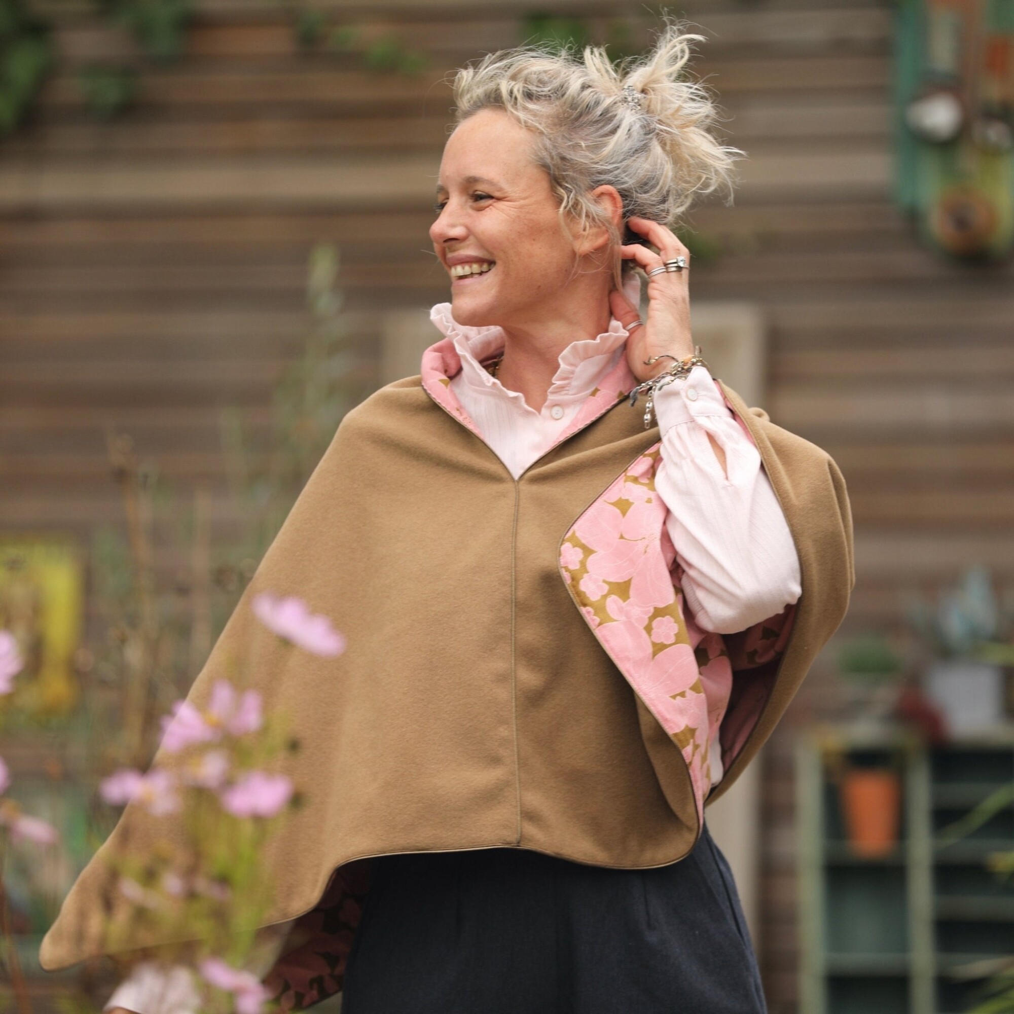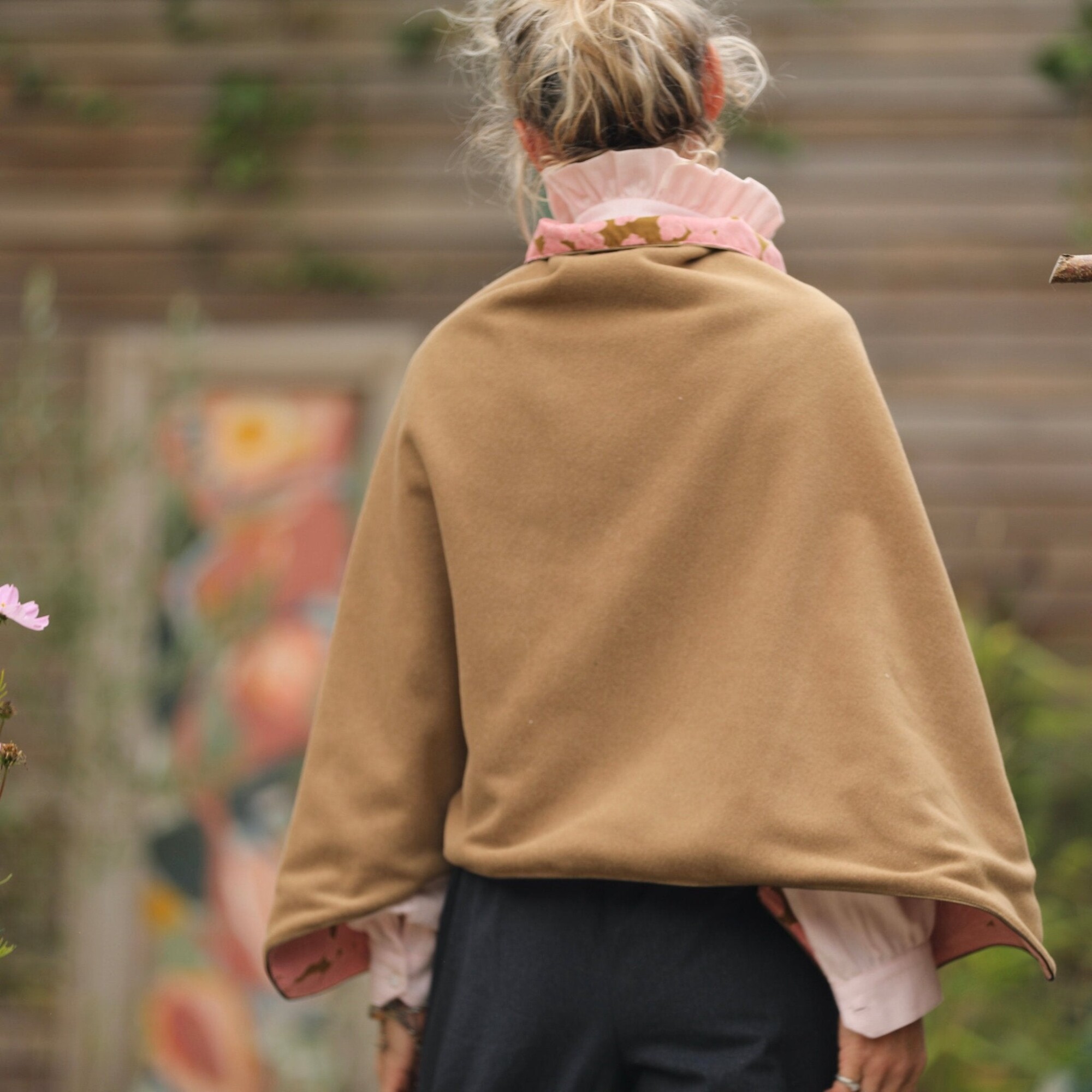 Cape courte Eugénie - lainage camel/velours milleraies fleuri rose