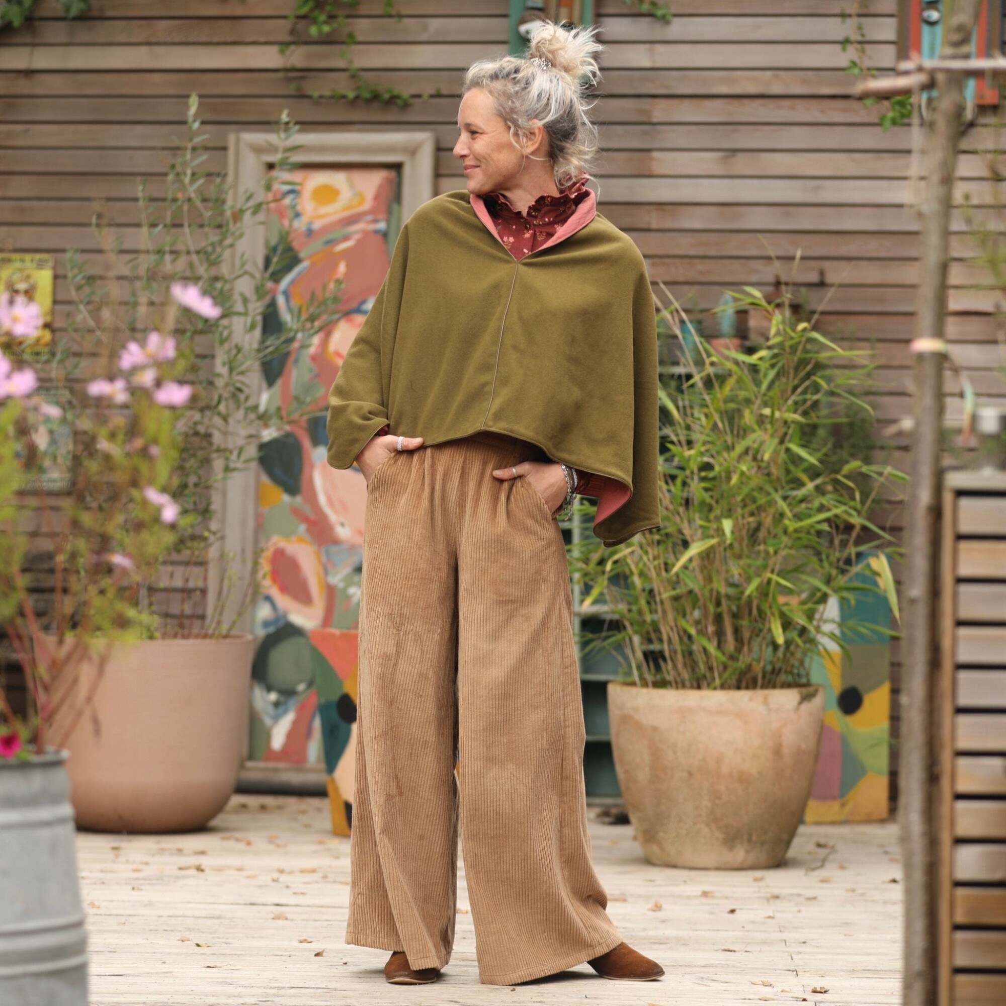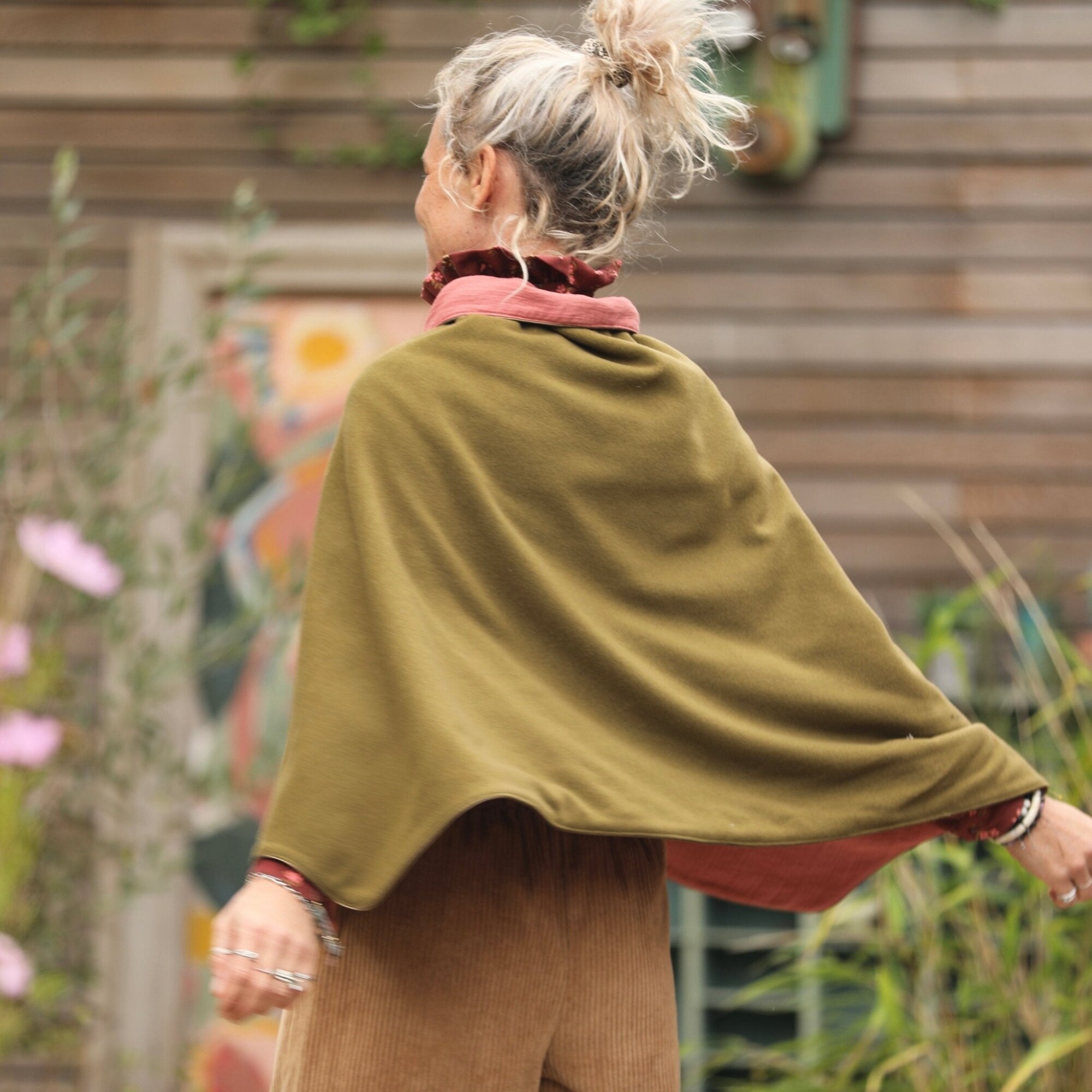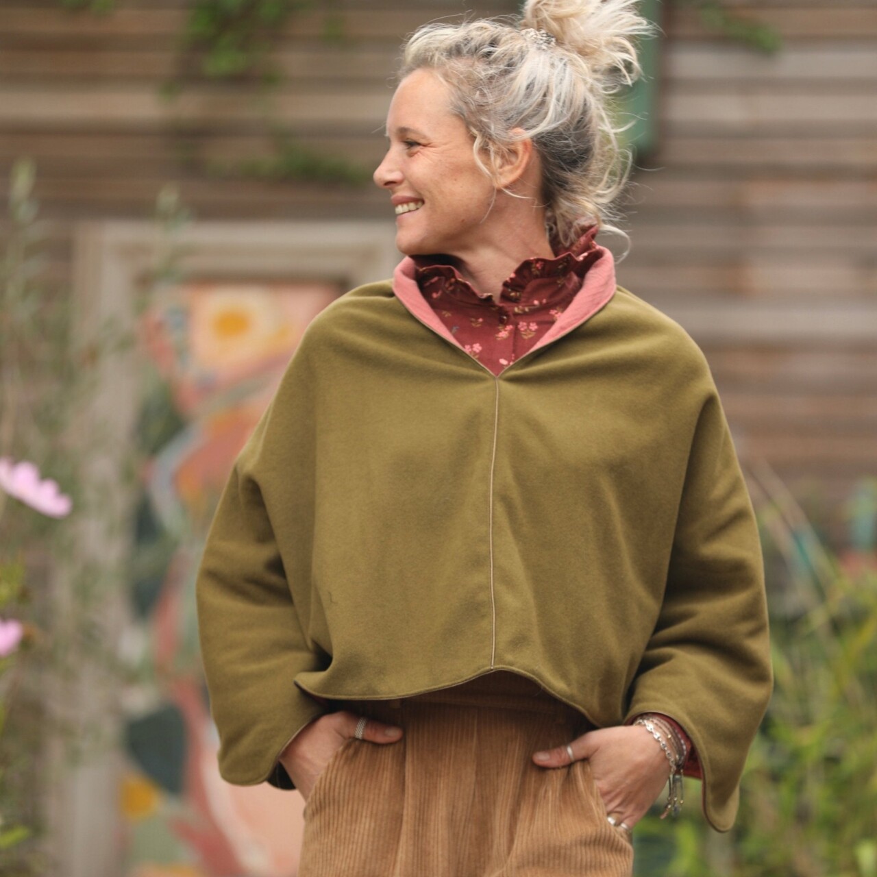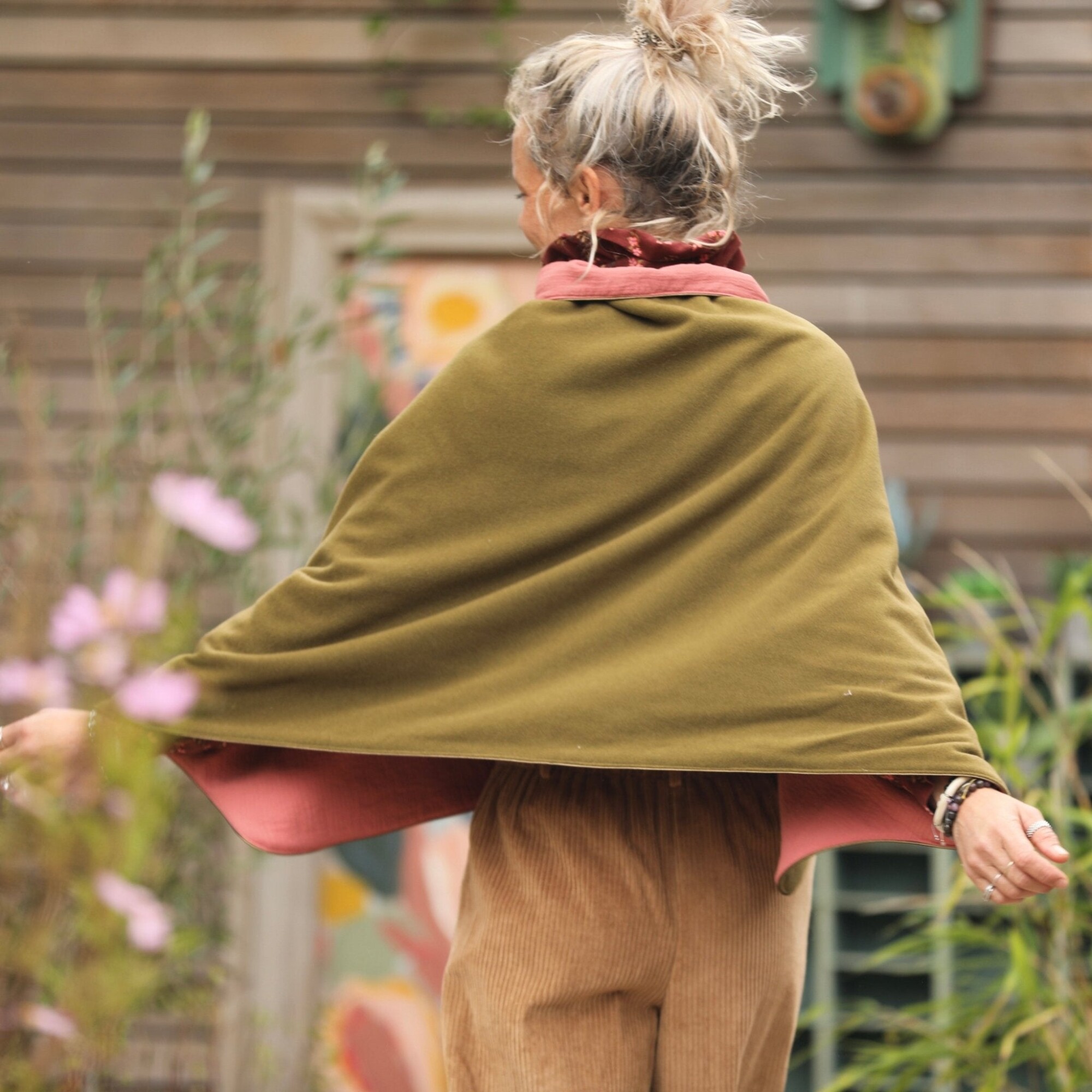 Cape courte Eugénie - lainage kiwi/piqué de coton rose boisé