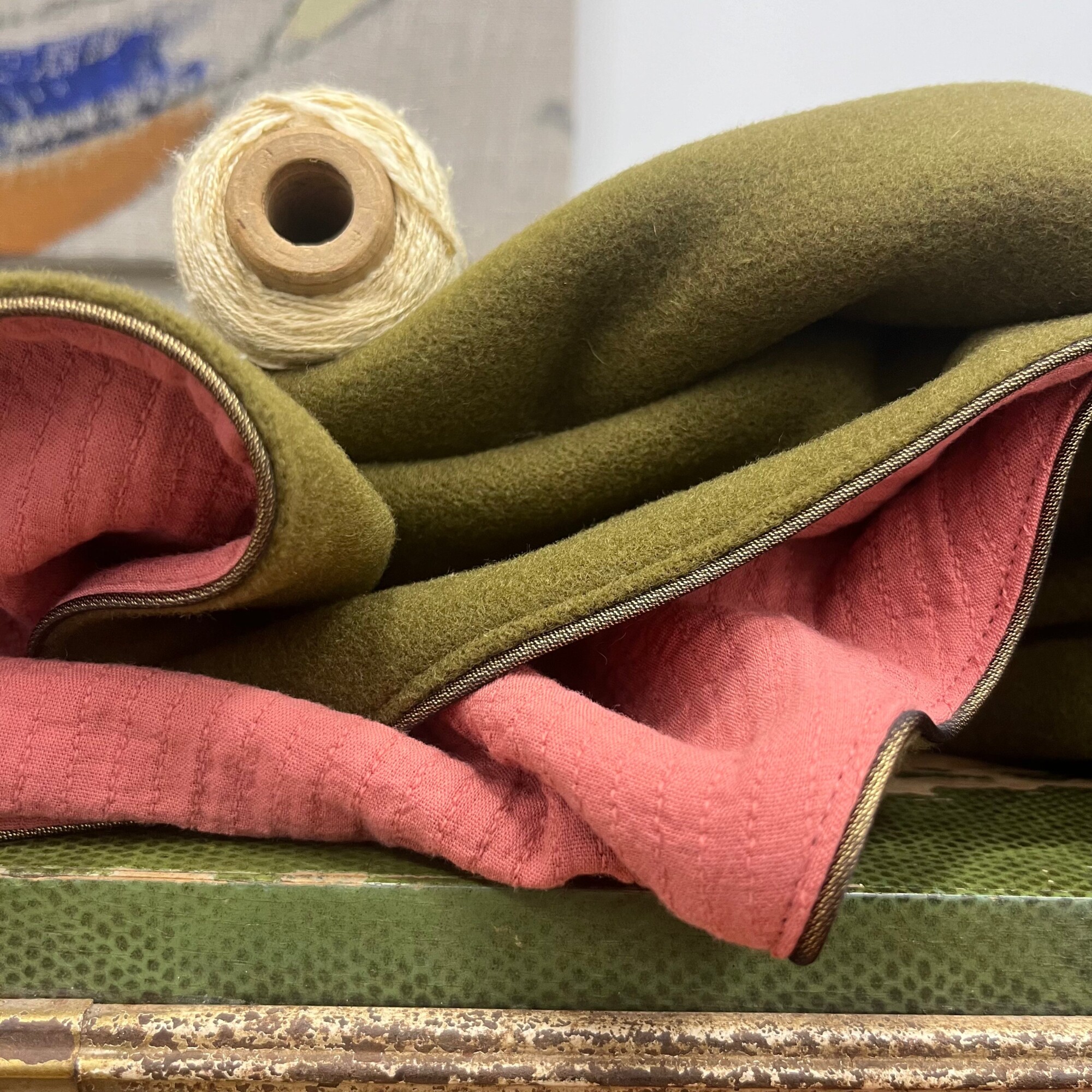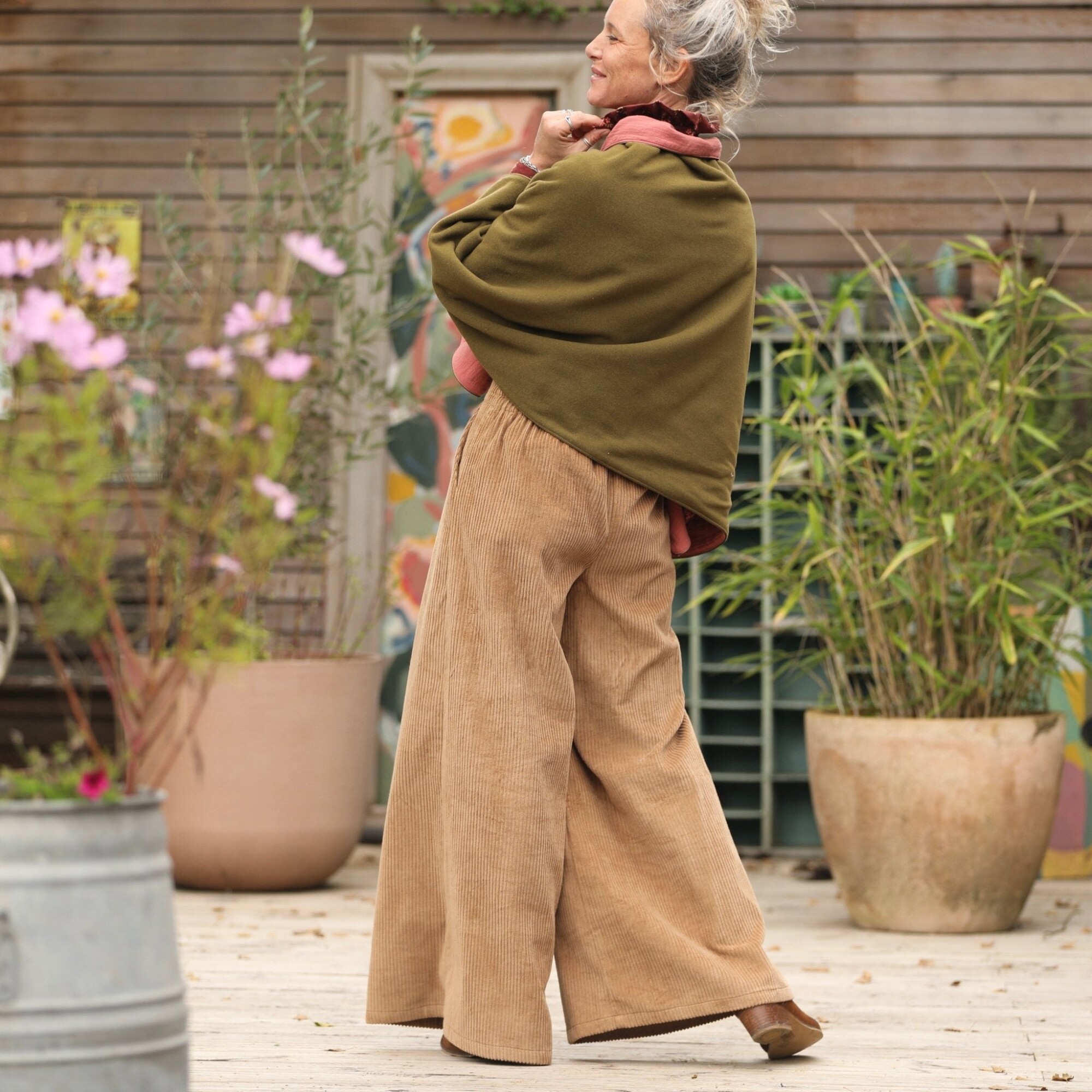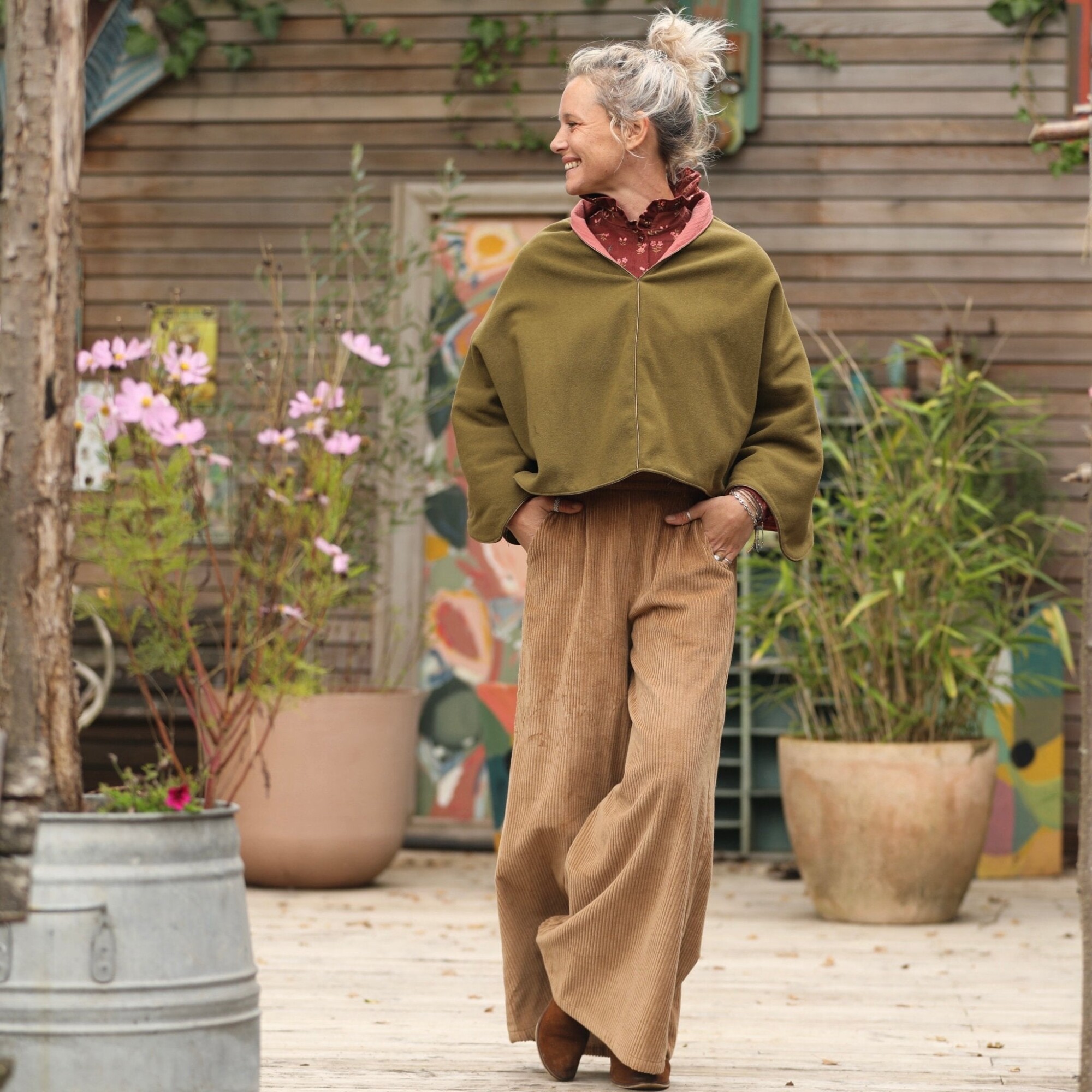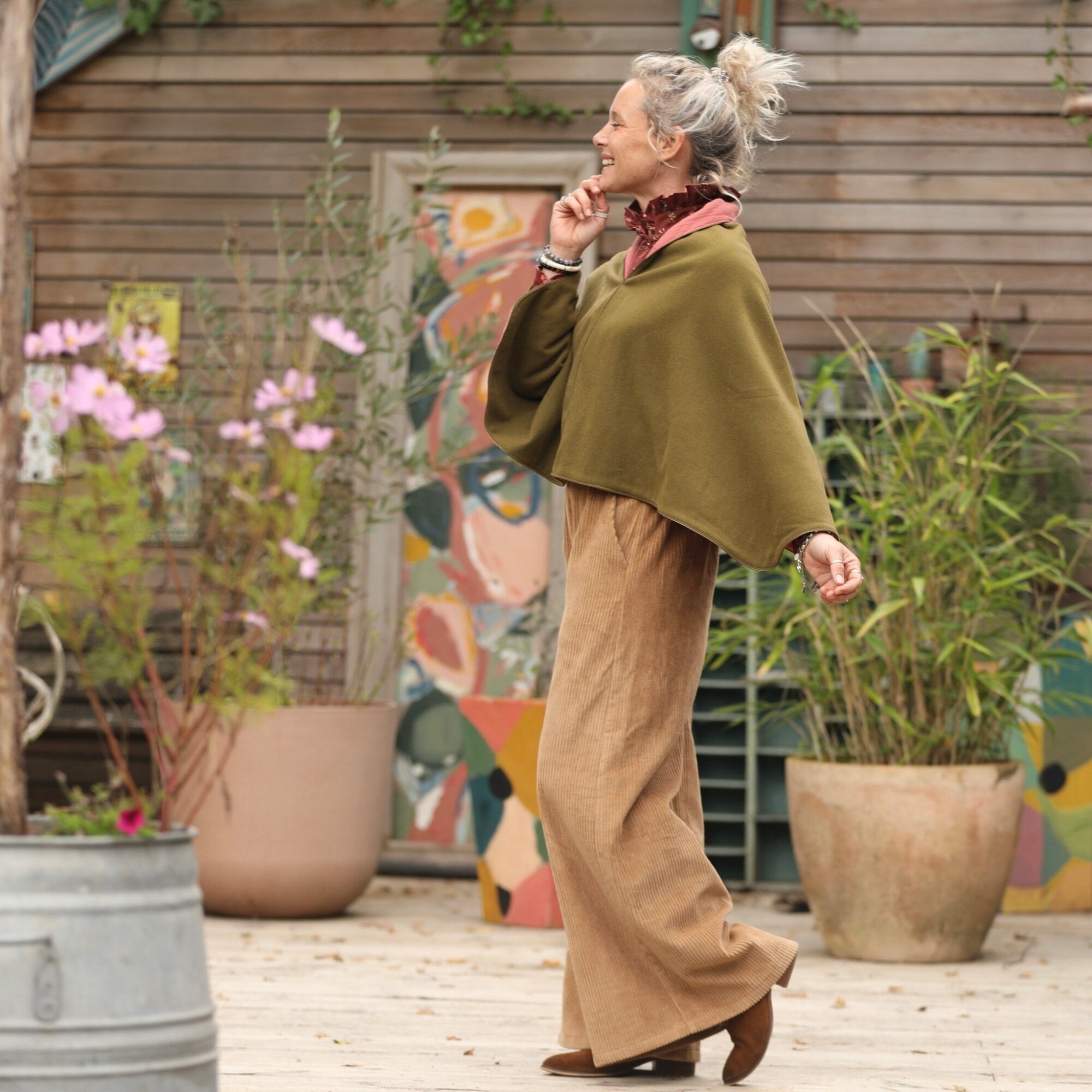 Cape courte Eugénie - lainage kiwi/piqué de coton rose boisé