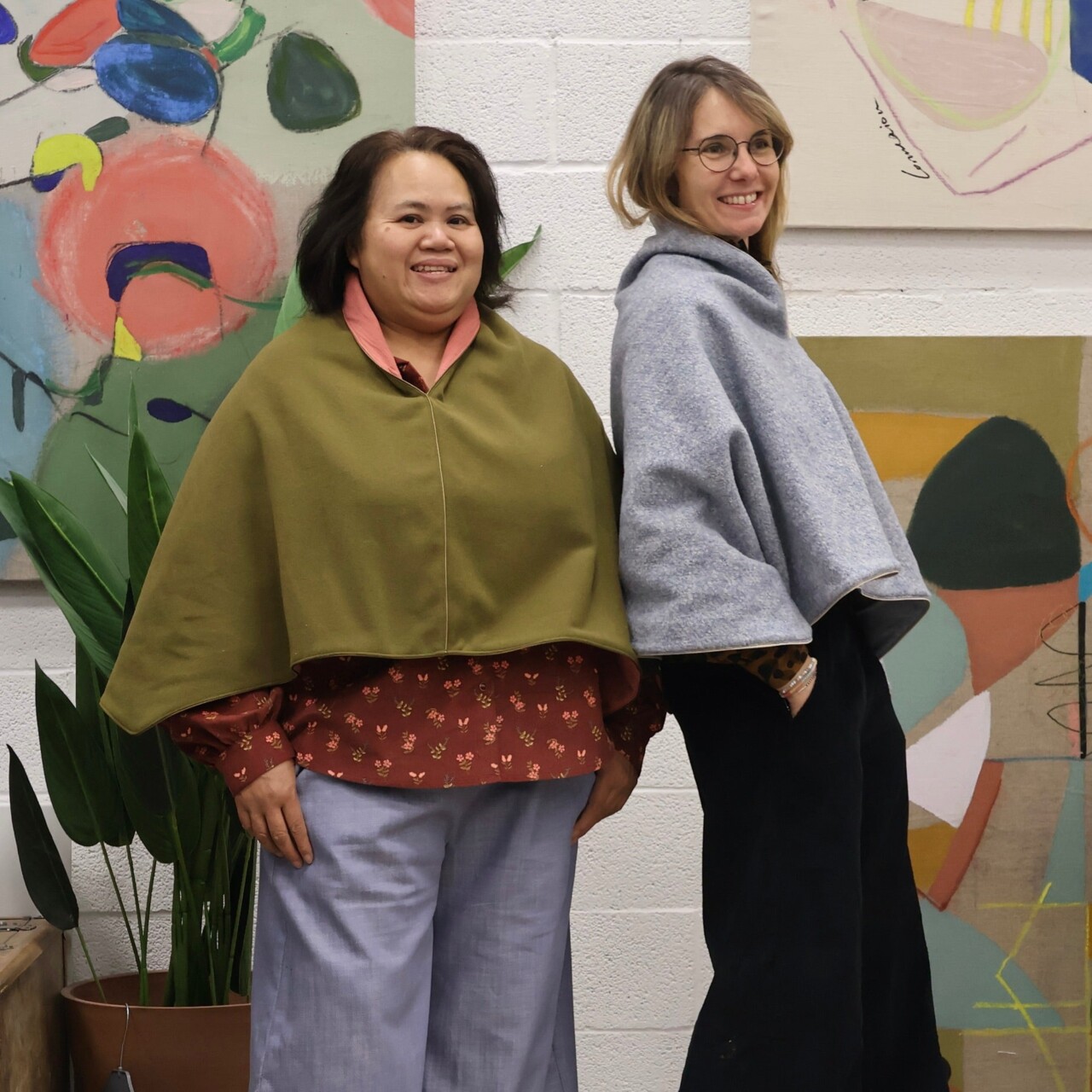 Eugénie est une cape courte à la coupe simple, conçue pour être portée par-dessus un vêtement. Elle présente une ouverture en V et un col que l'on peut retourner pour révéler sa belle doublure.