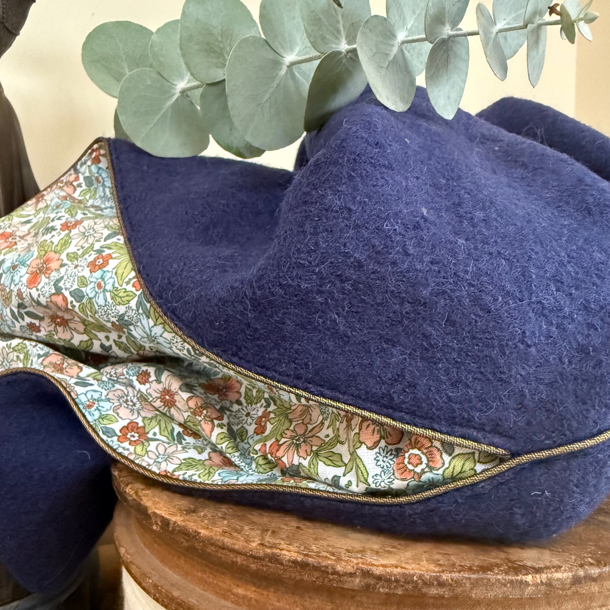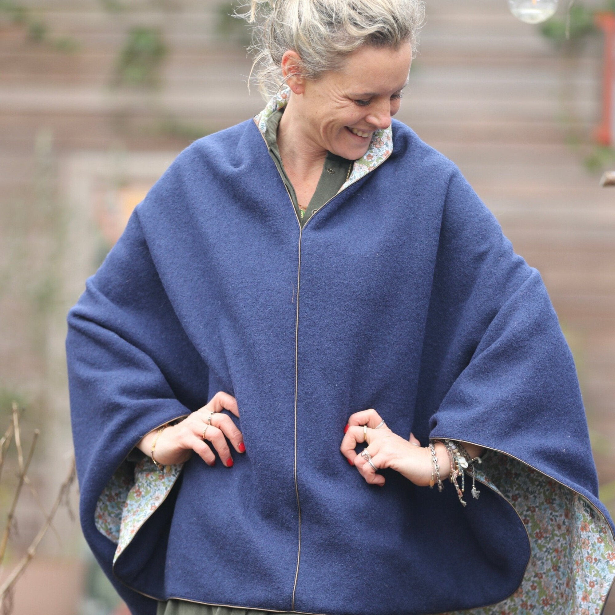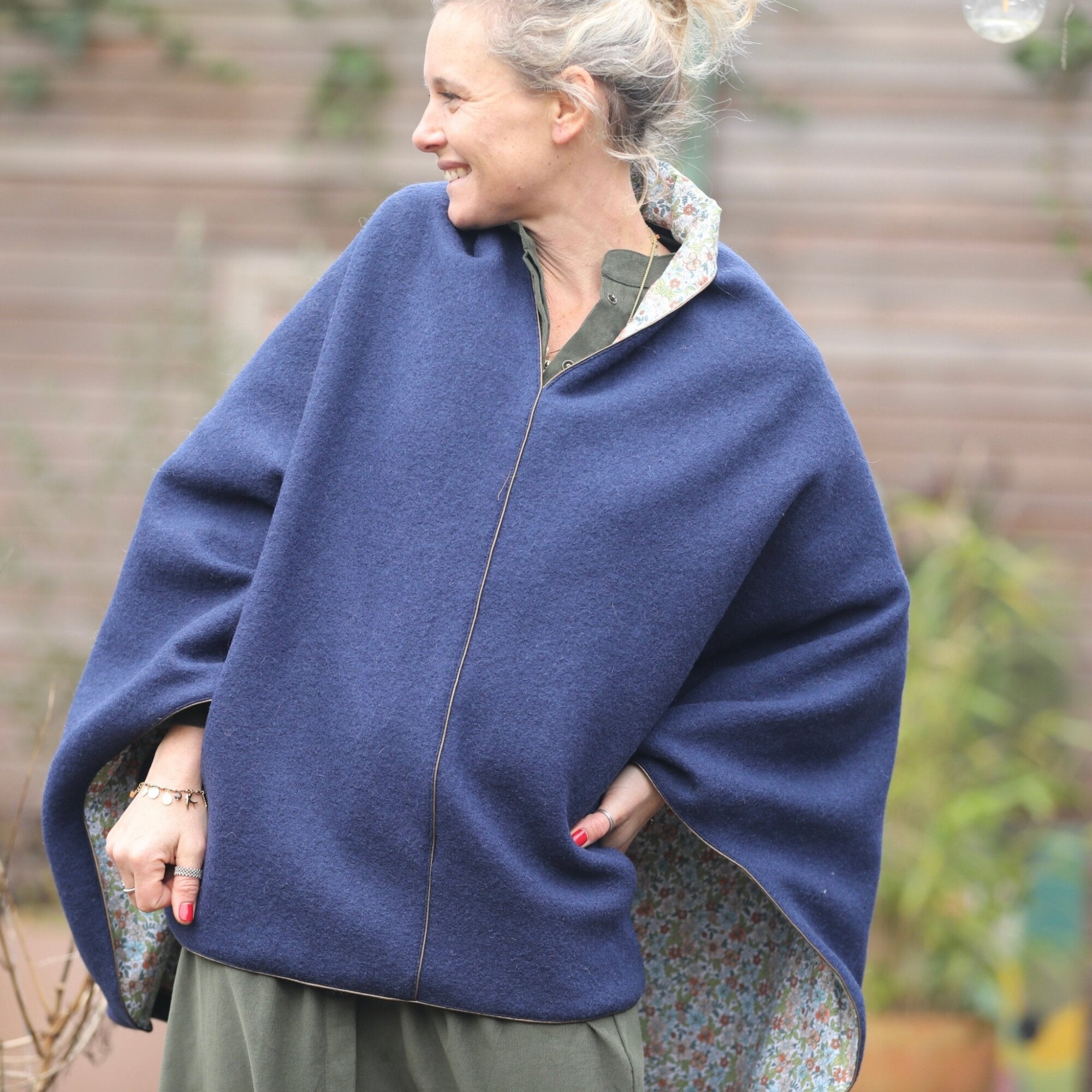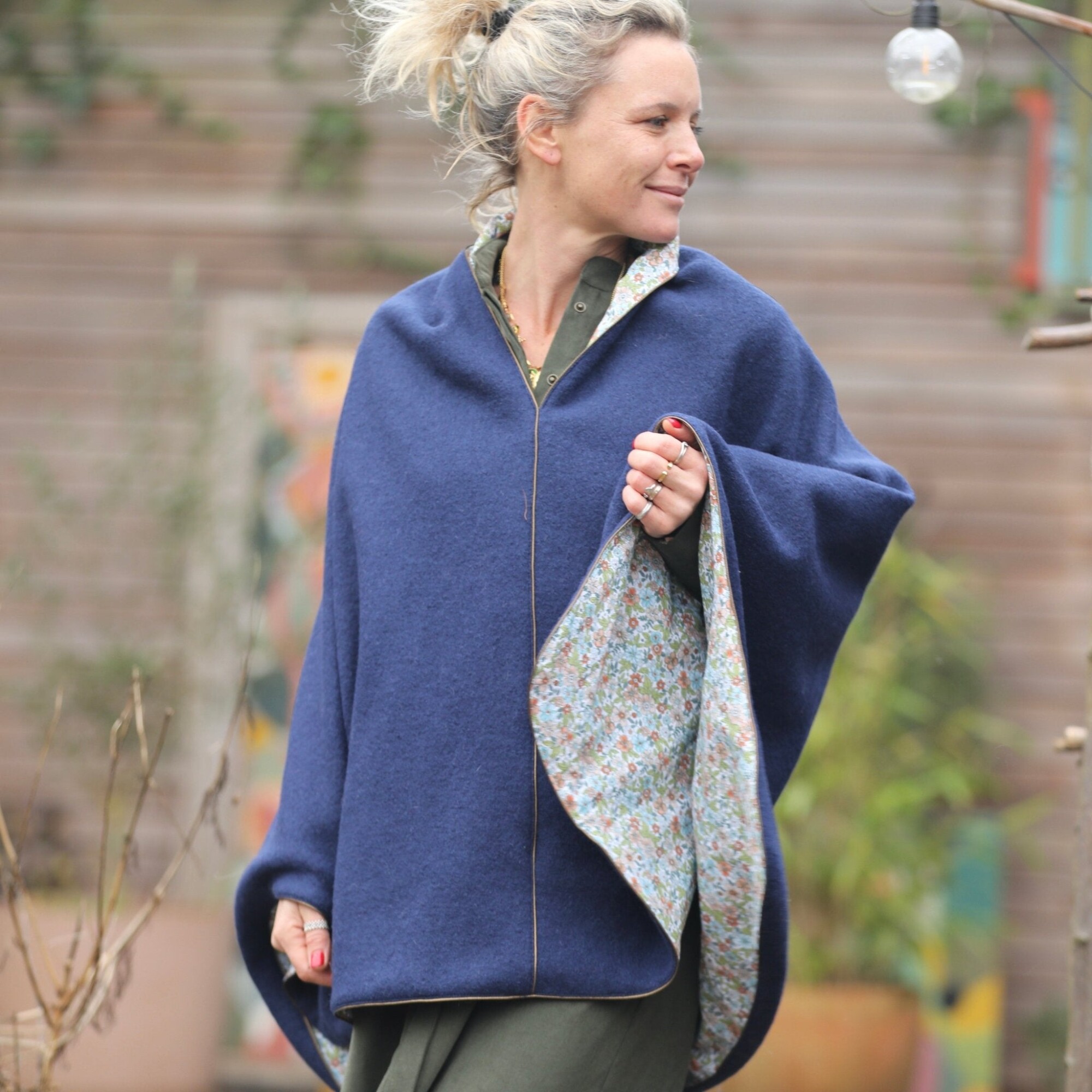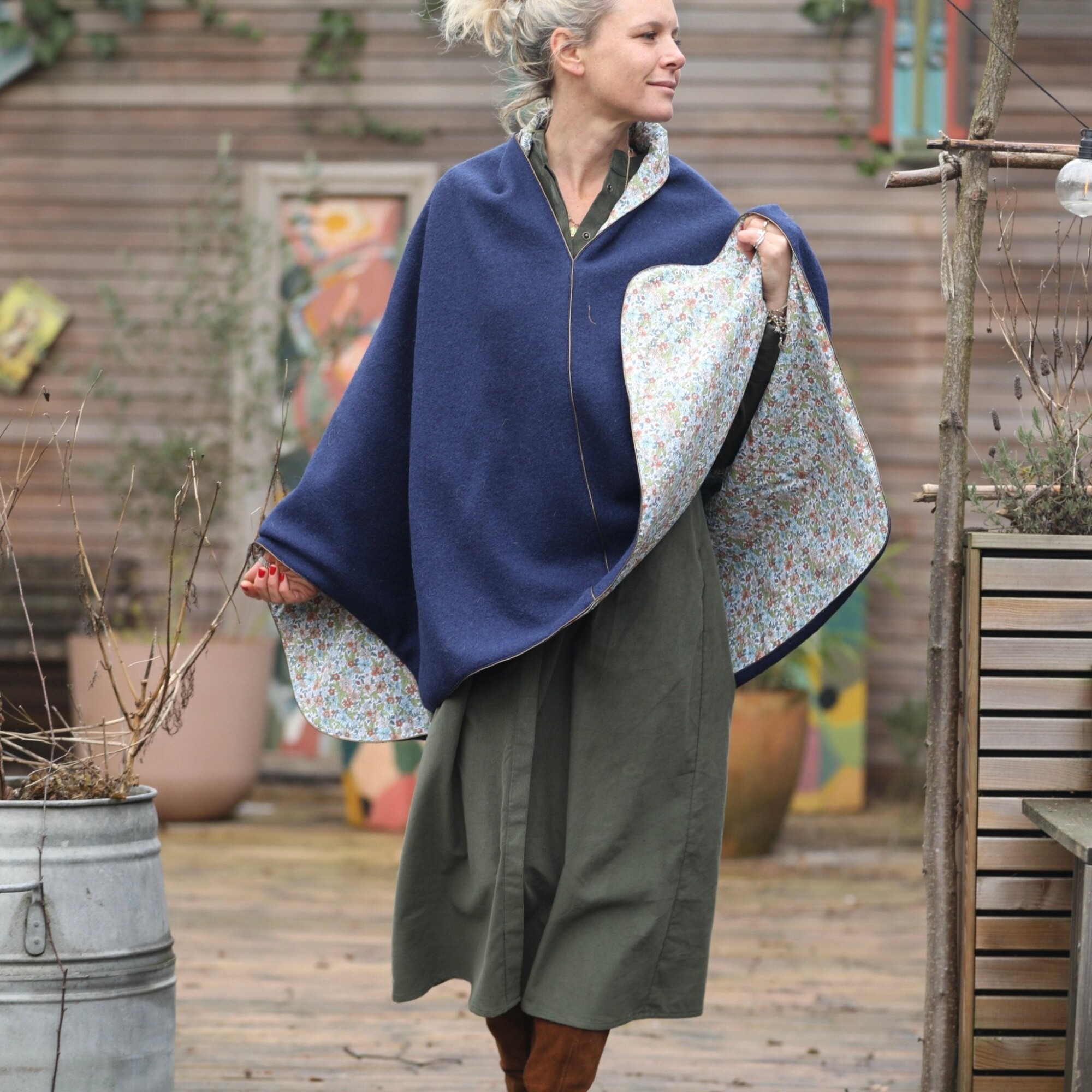 Cape midi Eugénie - laine bouillie bleu indigo / fleurs de printemps