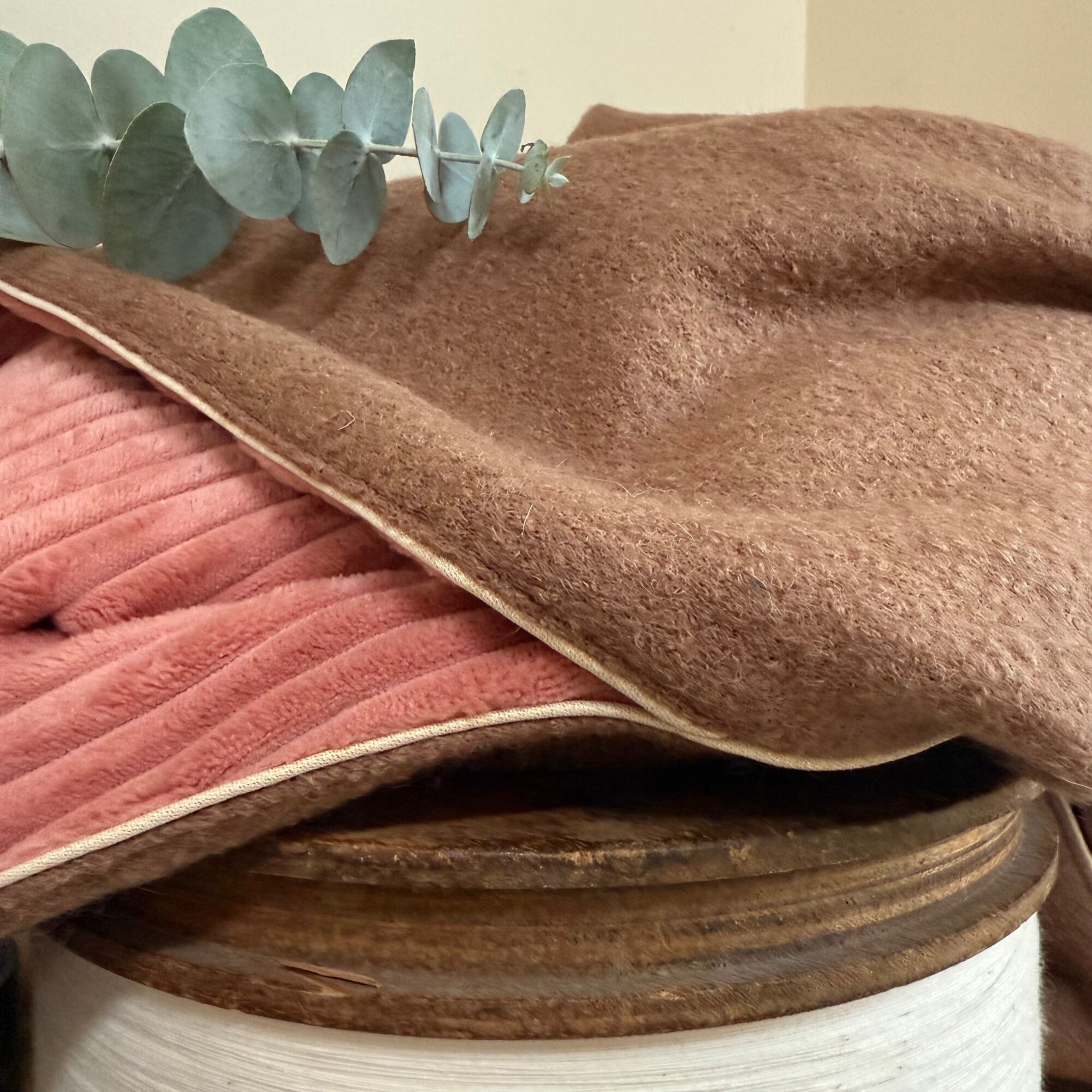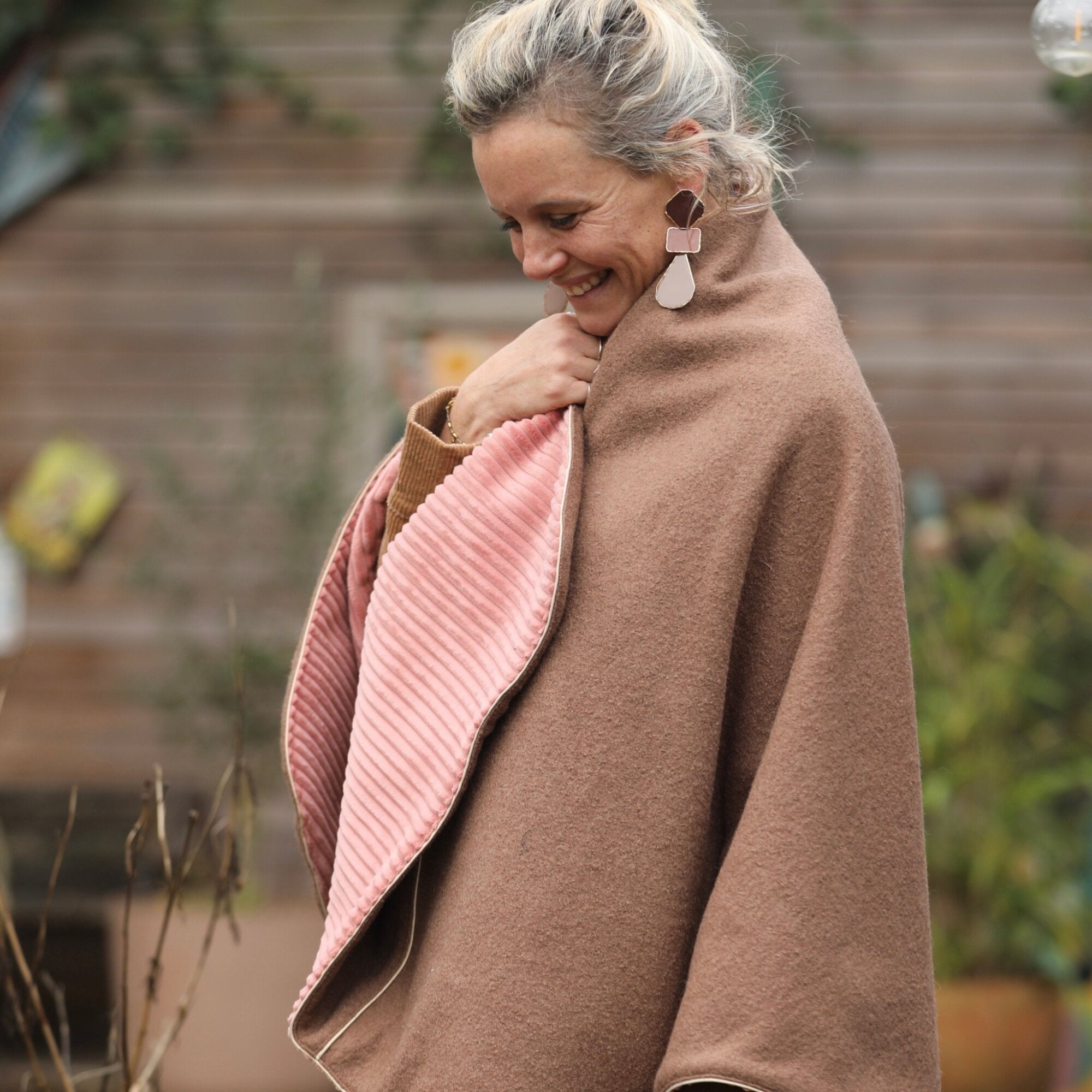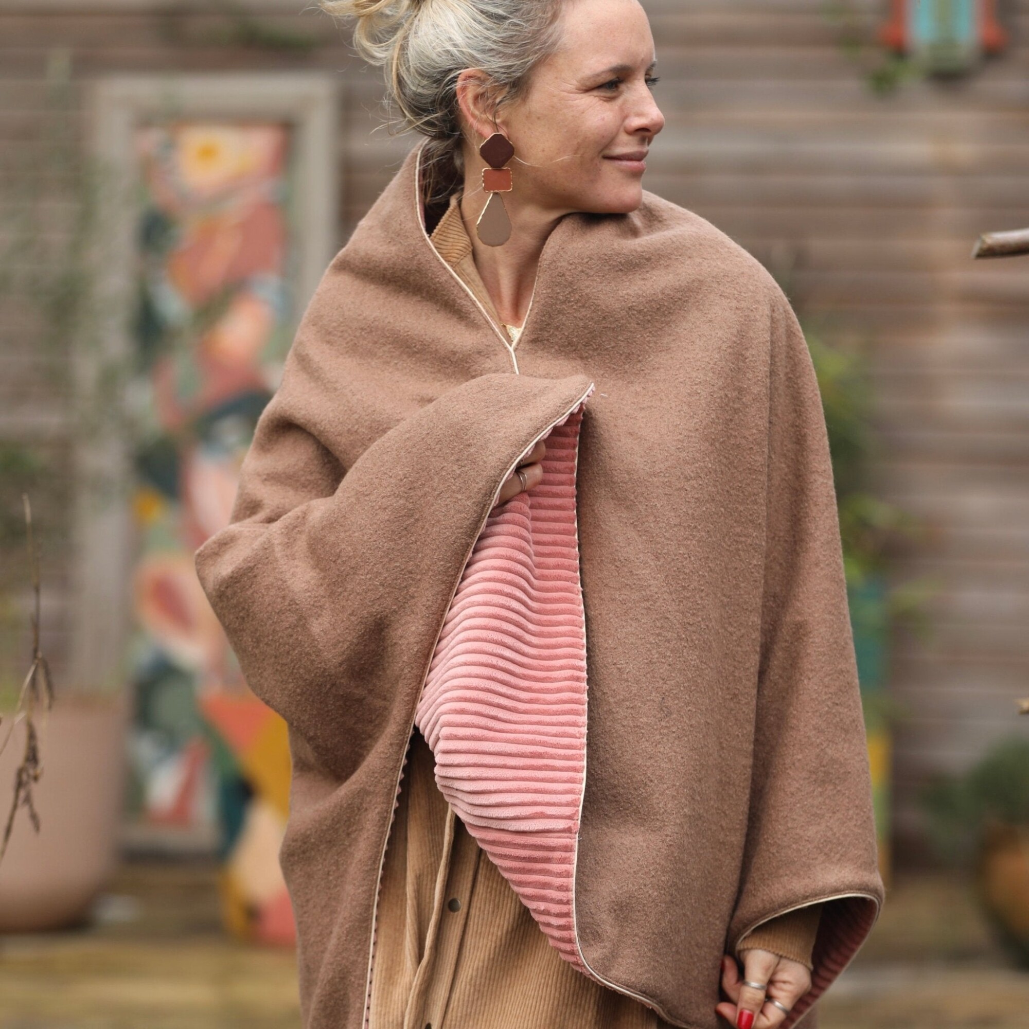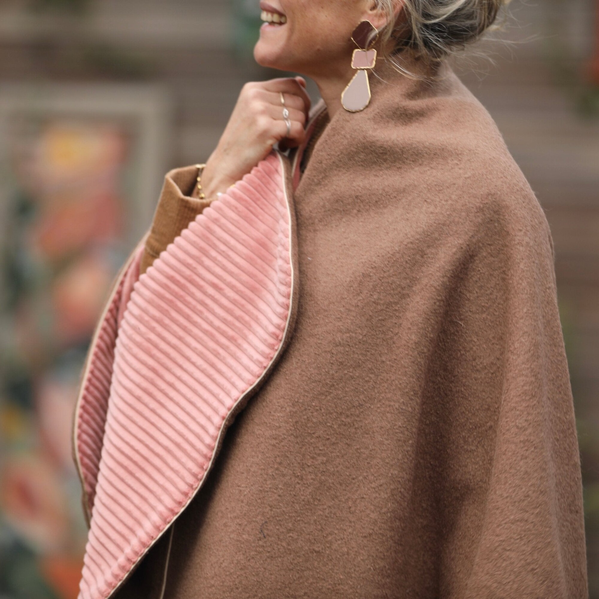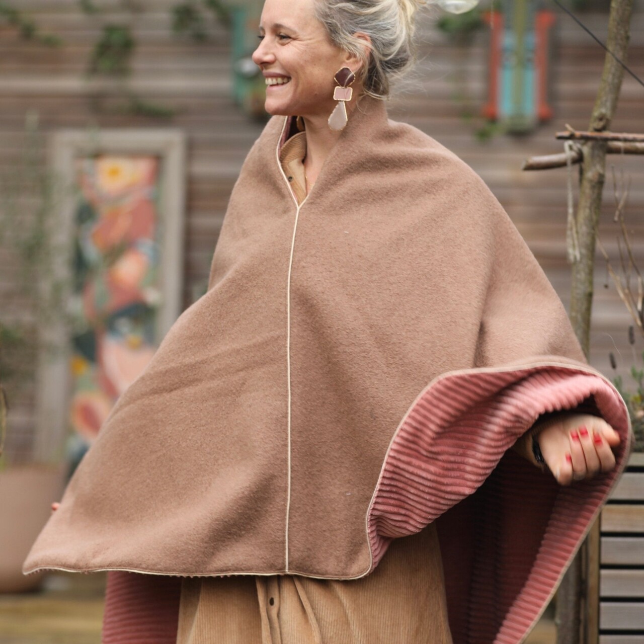 Cape midi Eugénie - laine bouillie camel / velours grosse côtes bois de rose