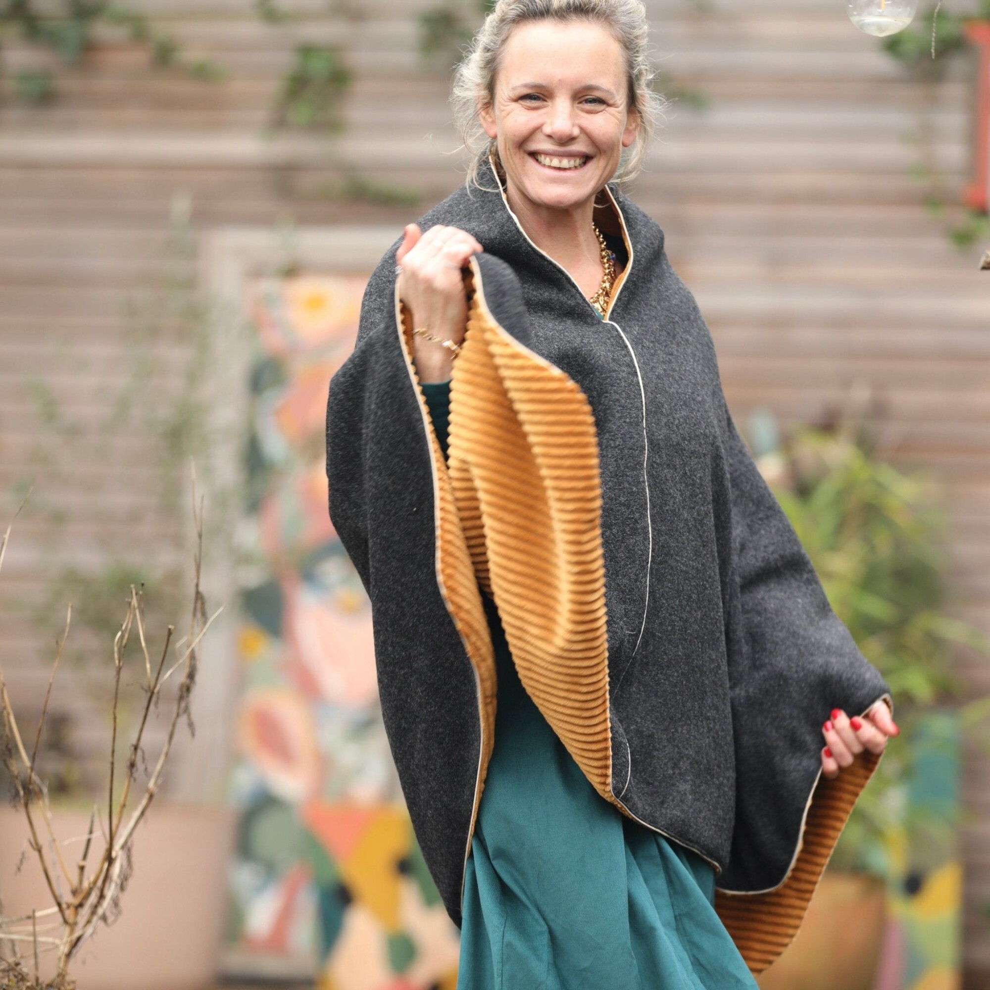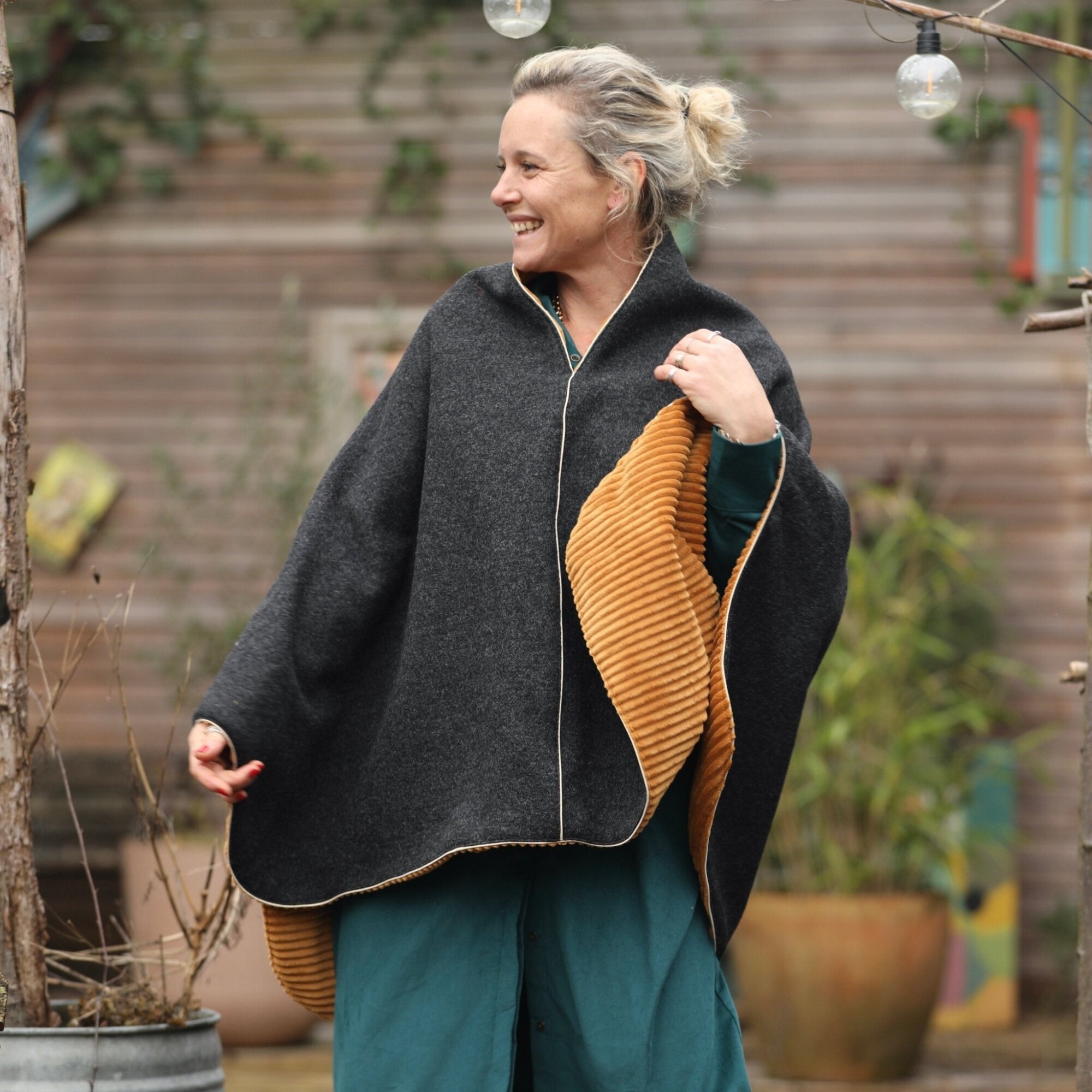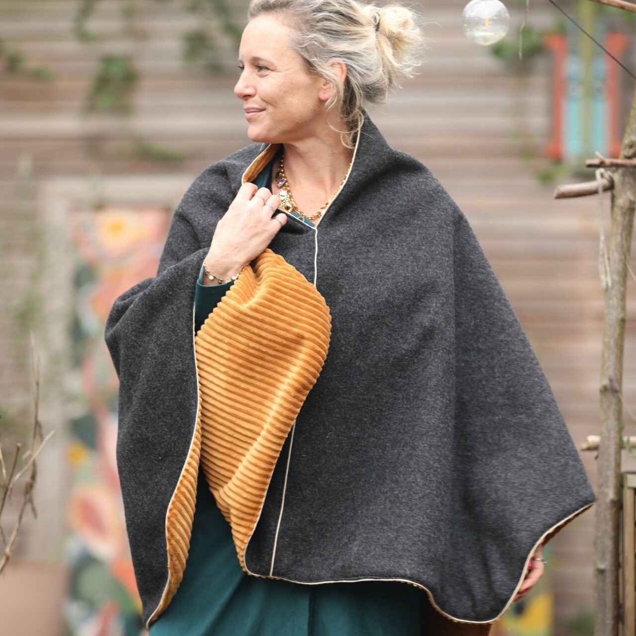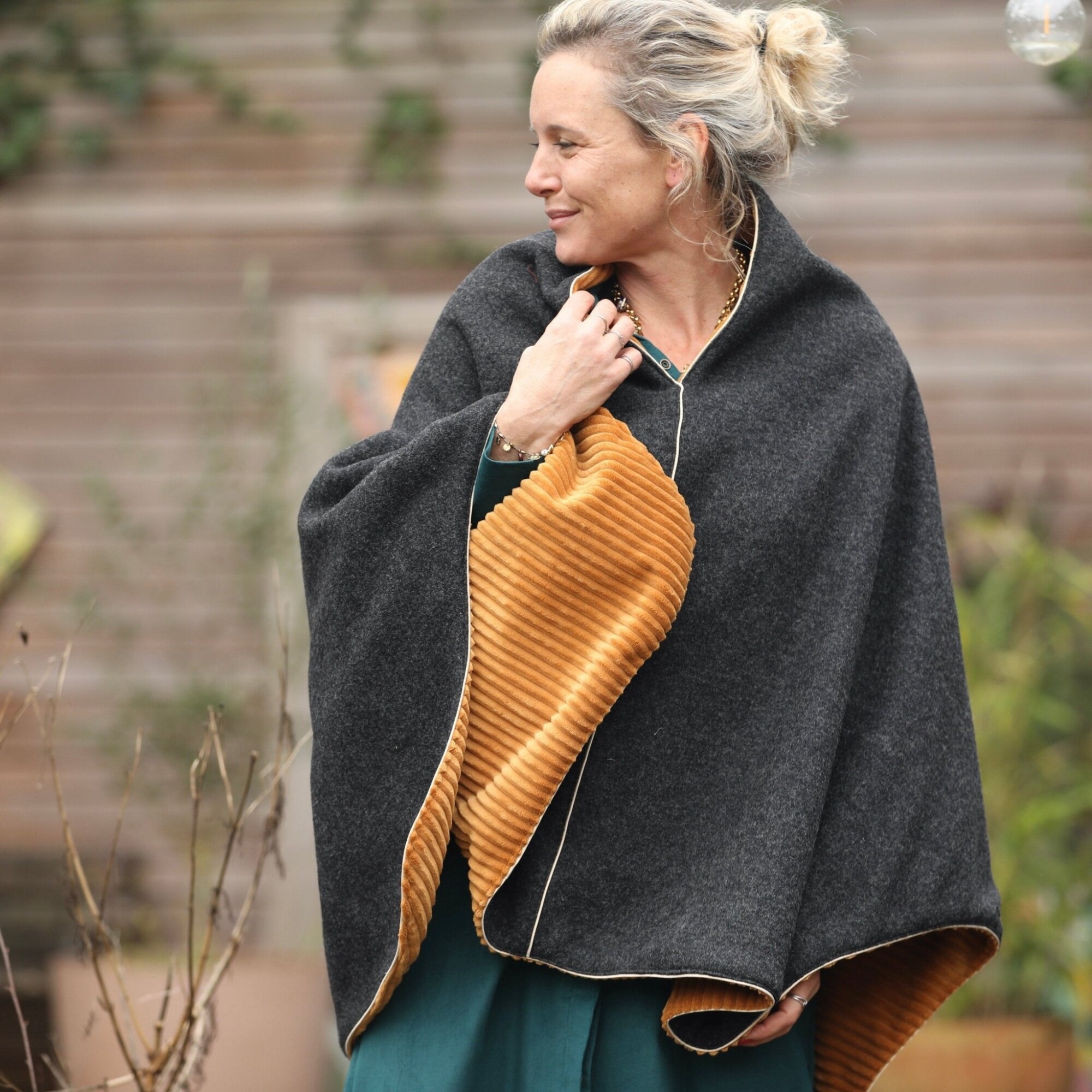 Cape midi Eugénie - laine bouillie gris anthracite / velours grosse côtes ocre
