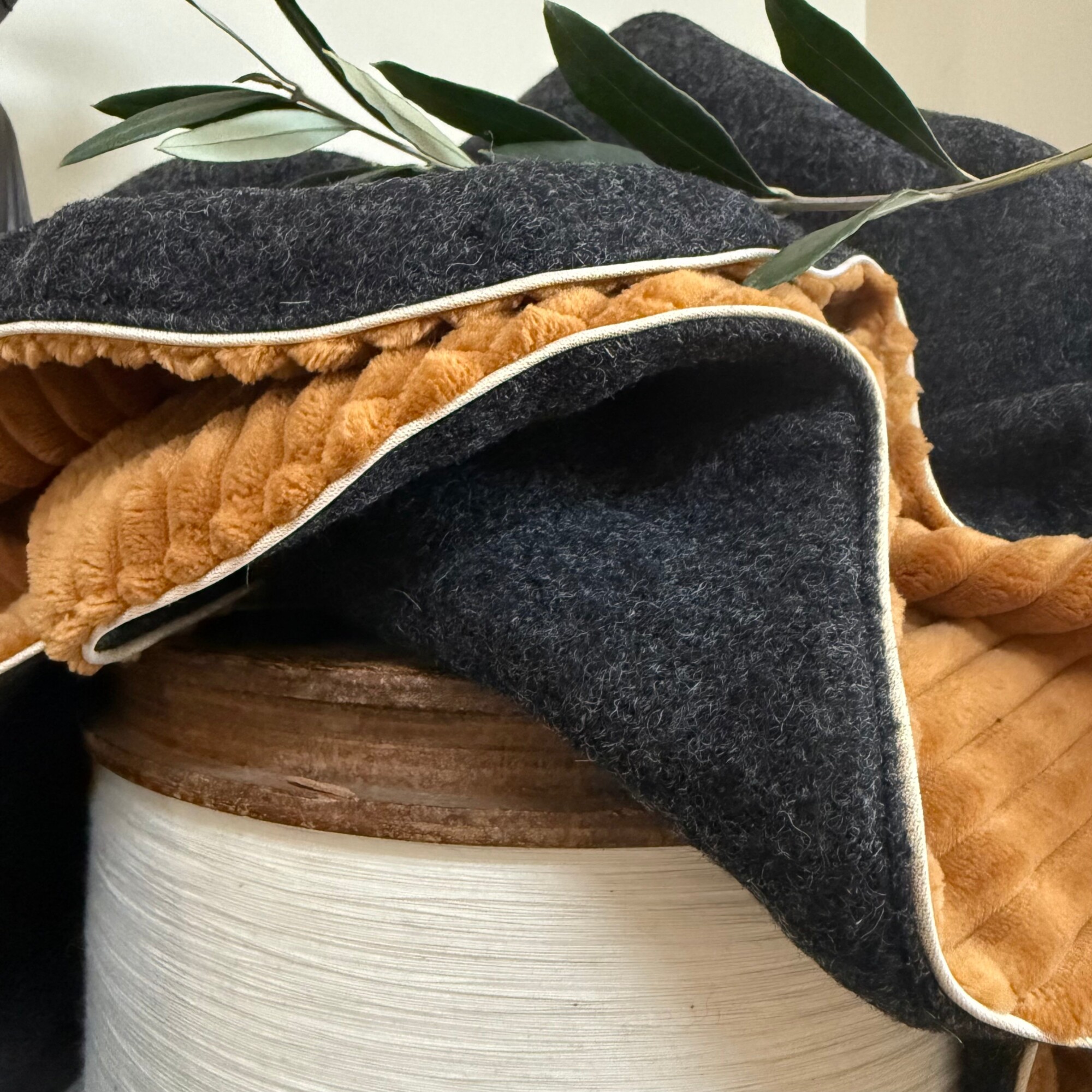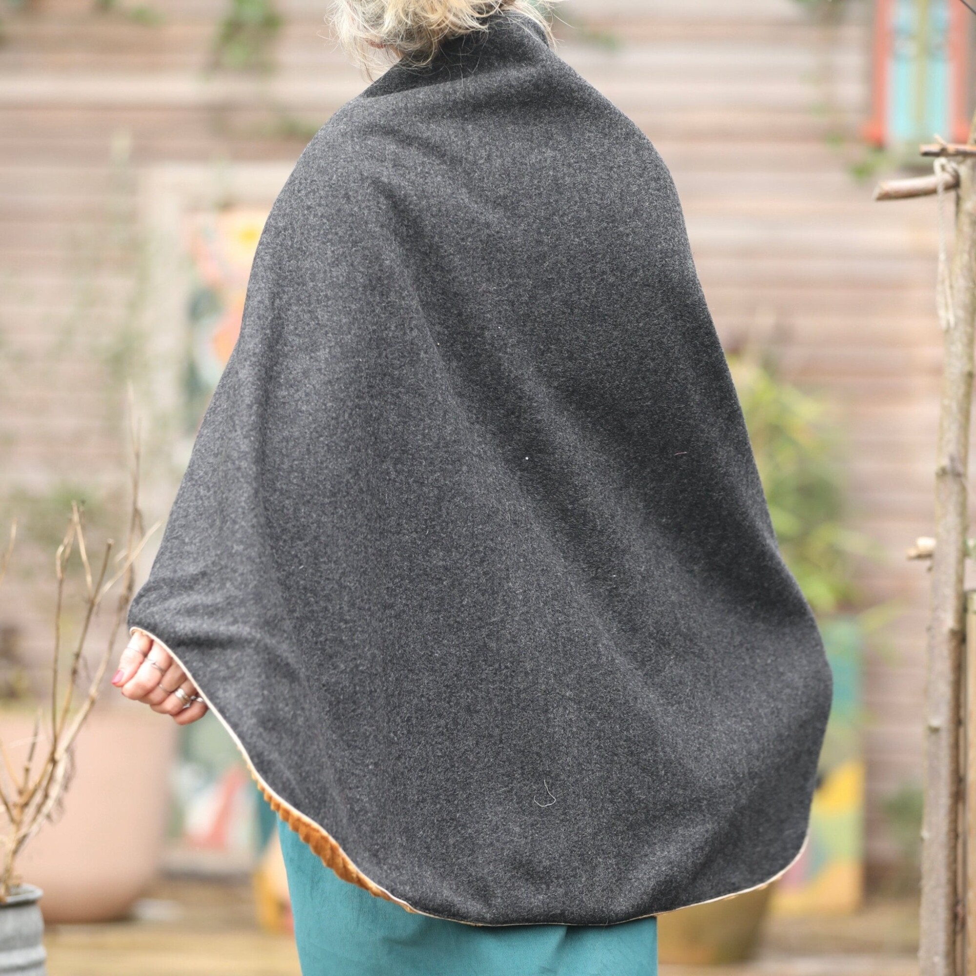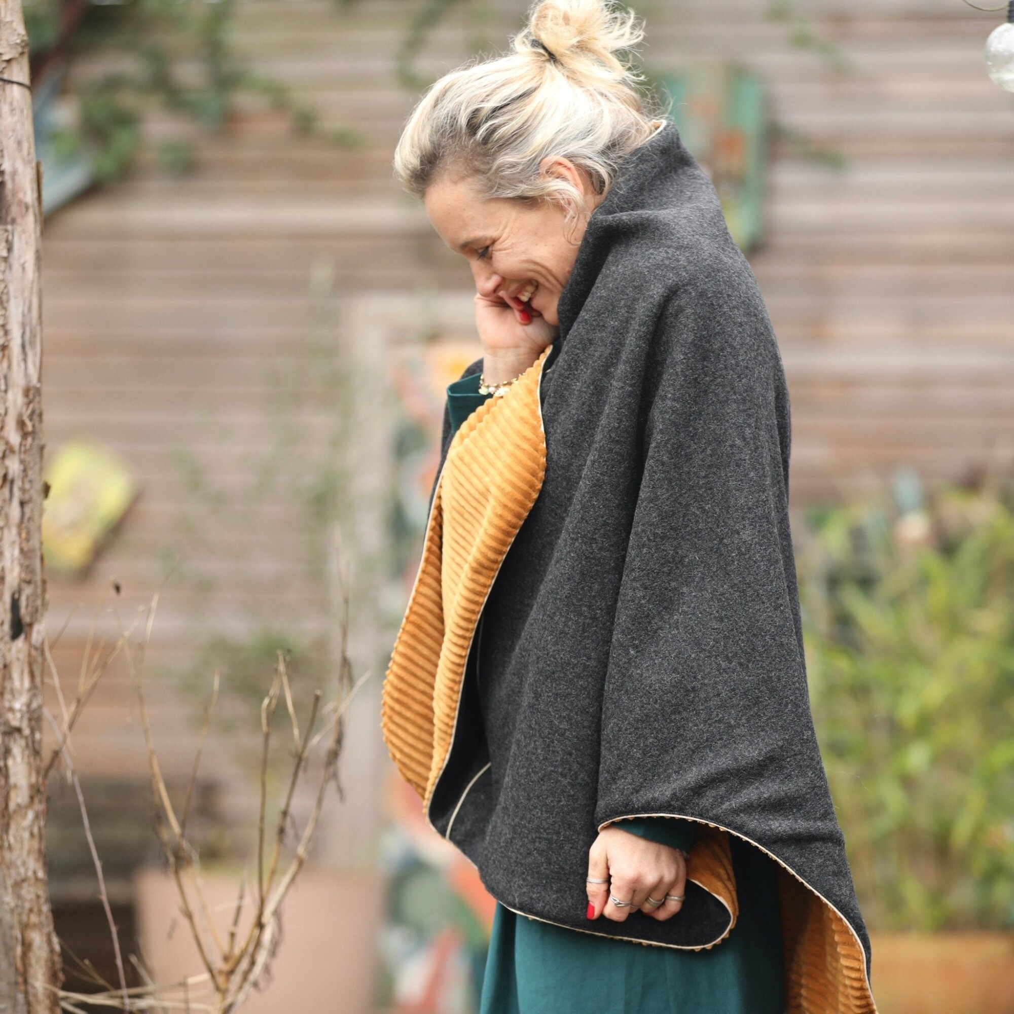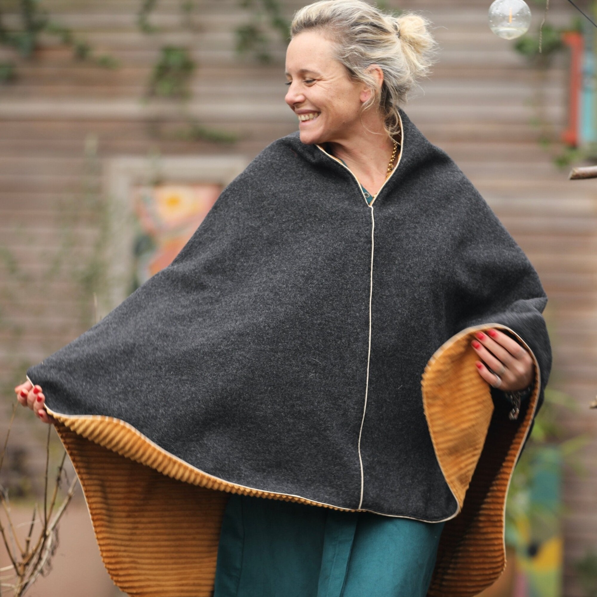 Cape midi Eugénie - laine bouillie gris anthracite / velours grosse côtes ocre