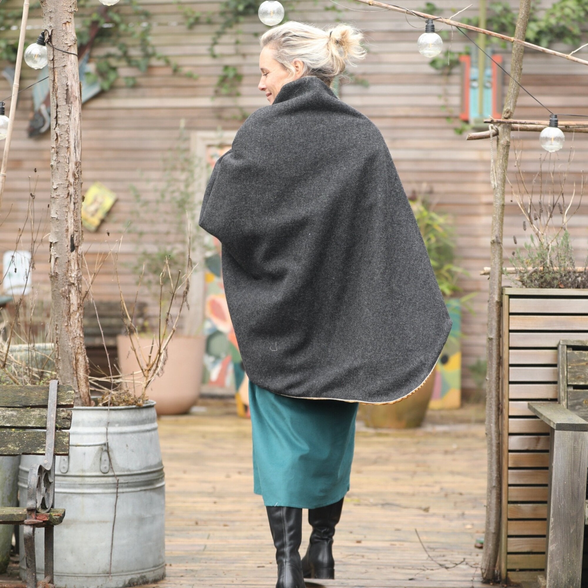 Eugénie est une cape mi-longue à la coupe simple, conçue pour être portée par-dessus un vêtement. Elle présente une ouverture en V et un col que l'on peut retourner pour révéler sa belle doublure.