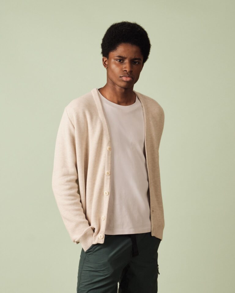 Entièrement fabriqué en France, dans notre atelier, le cardigan Agop est la version plus douce et plus confortable du gilet Youri Printemps. Comme vous pouvez le voir, on découvre des alvéoles sur toute la pièce qui lui donne sa singularité. Et le fait de tricoter ce fil comme ceci, le résultat est plus doux, et surtout plus léger.