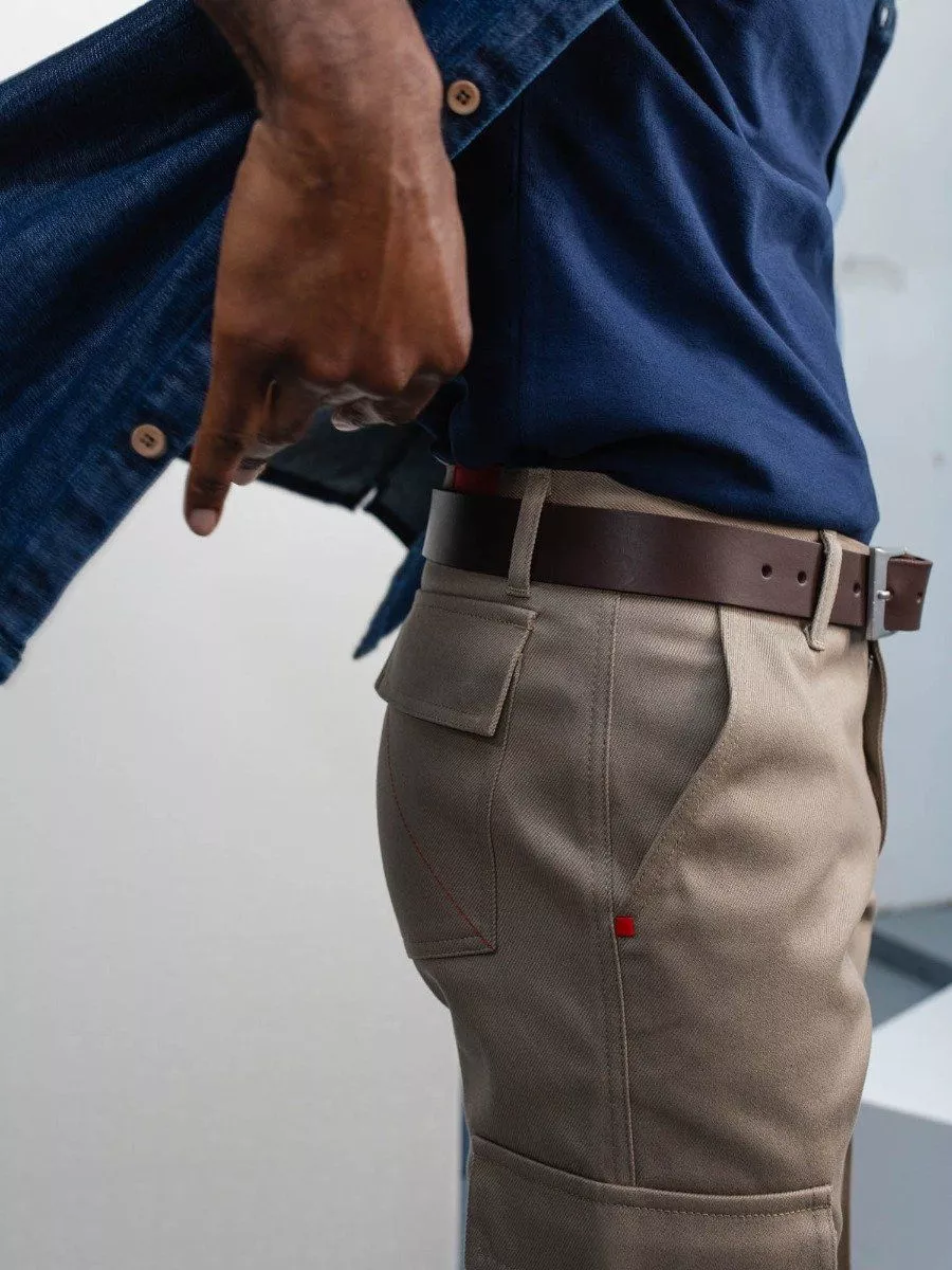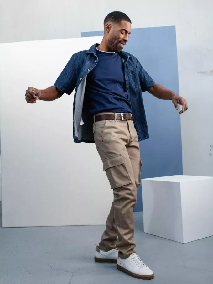LE PANTALON CARGO BEIGE HOMME Alliez praticité et style intemporel avec notre pantalon cargo beige homme 111N. Toujours fabriqué au maximum en France, il est conçu en 100 % coton bio et reste ultra-fonctionnel grâce à ses poches cargo à soufflet sur les côtés et ses poches arrière à rabats.