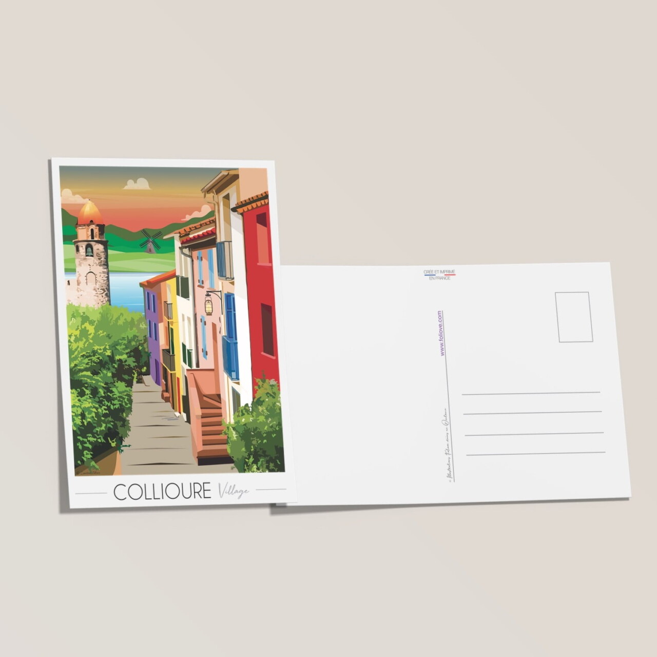 Carte Postale de Collioure village d’après une illustration originale, dessinée depuis nos ateliers d’Occitanie et imprimée sur du papier 350g/m² couché mat, avec pelliculage brillant de protection.