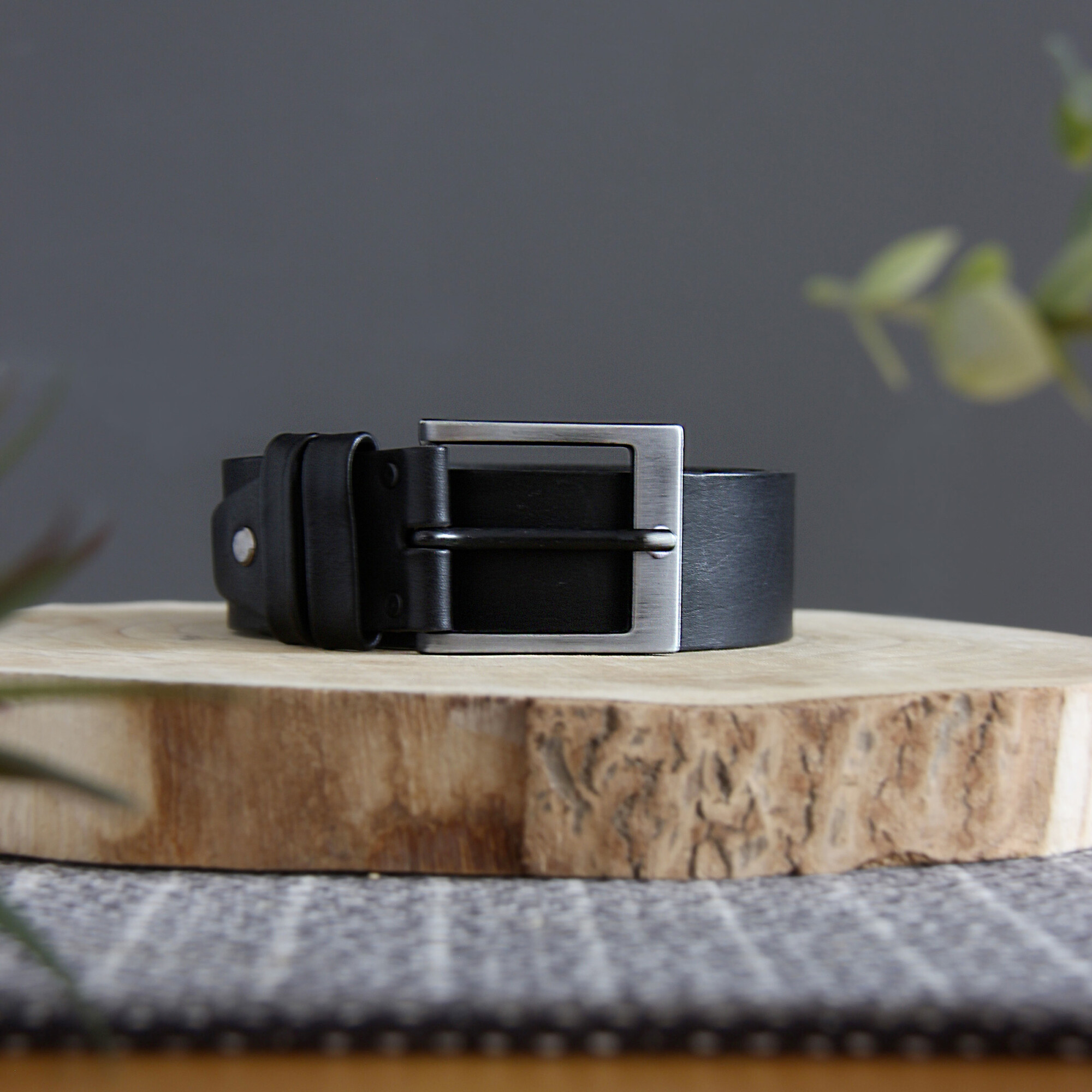 Ceinture casual homme en cuir noir, fabriquée en France. Son cuir se patine avec le temps pour un caractère unique. Cuir de veau pleine fleur noir d'origine Italie. Tannage végétal. Coupe bord franc sans couture. Teinture de tranche ton sur ton. Boucle en métal argenté foncé. Largeur 4 cm. Dimensions boucle 5,5 x 5 cm. Longueur réglable par vis. 7 trous. Livrée dans son pochon en coton biologique. Fabriquée artisanalement en France, dans le Tarn. Emballage certifié FSC et PEFC, réemployable et recyclable. La taille d'une ceinture correspond à la mesure de votre tour de taille. Nettoyez avec un chiffon doux, appliquez une crème pour nourrir le cuir et un cirage pour protéger la couleur.