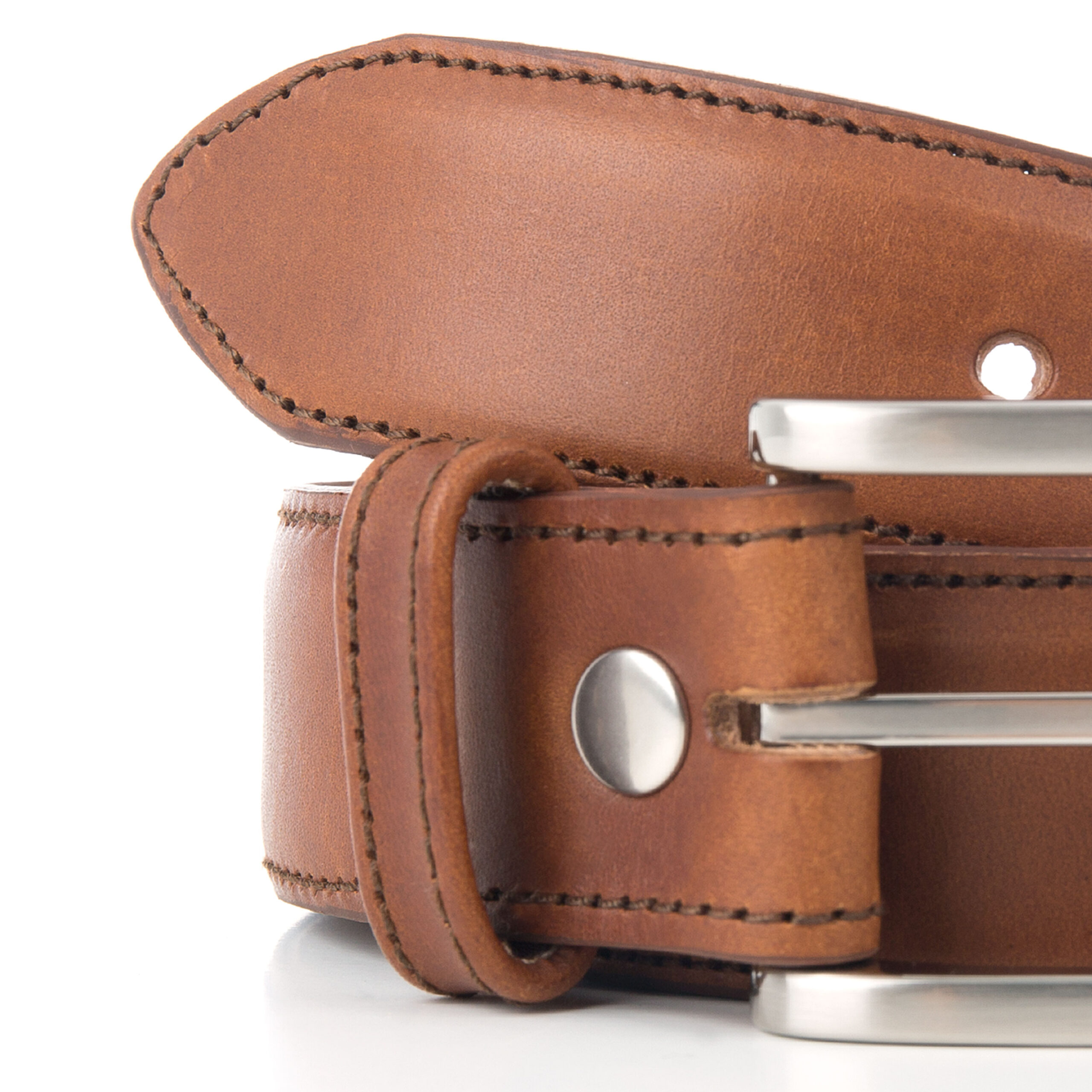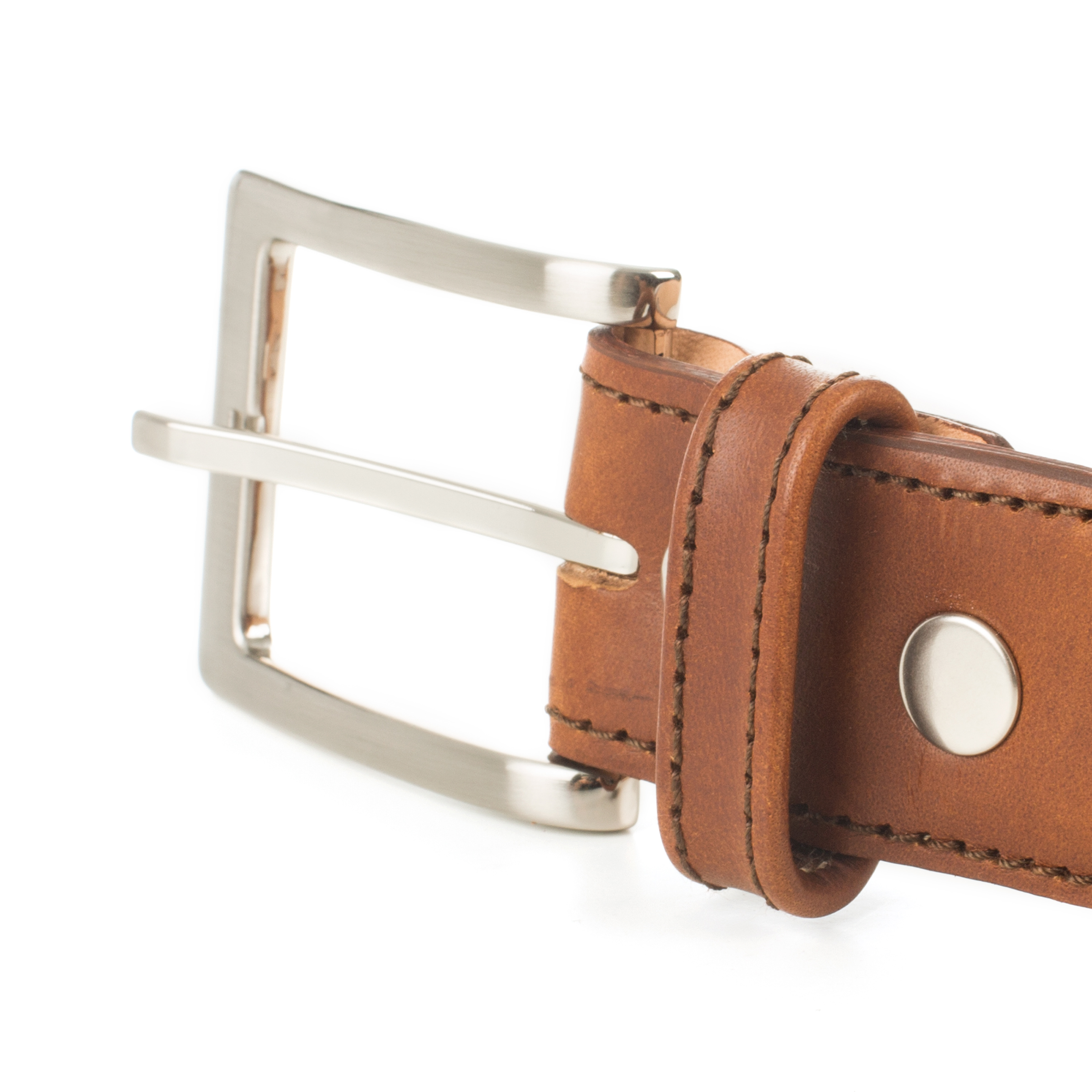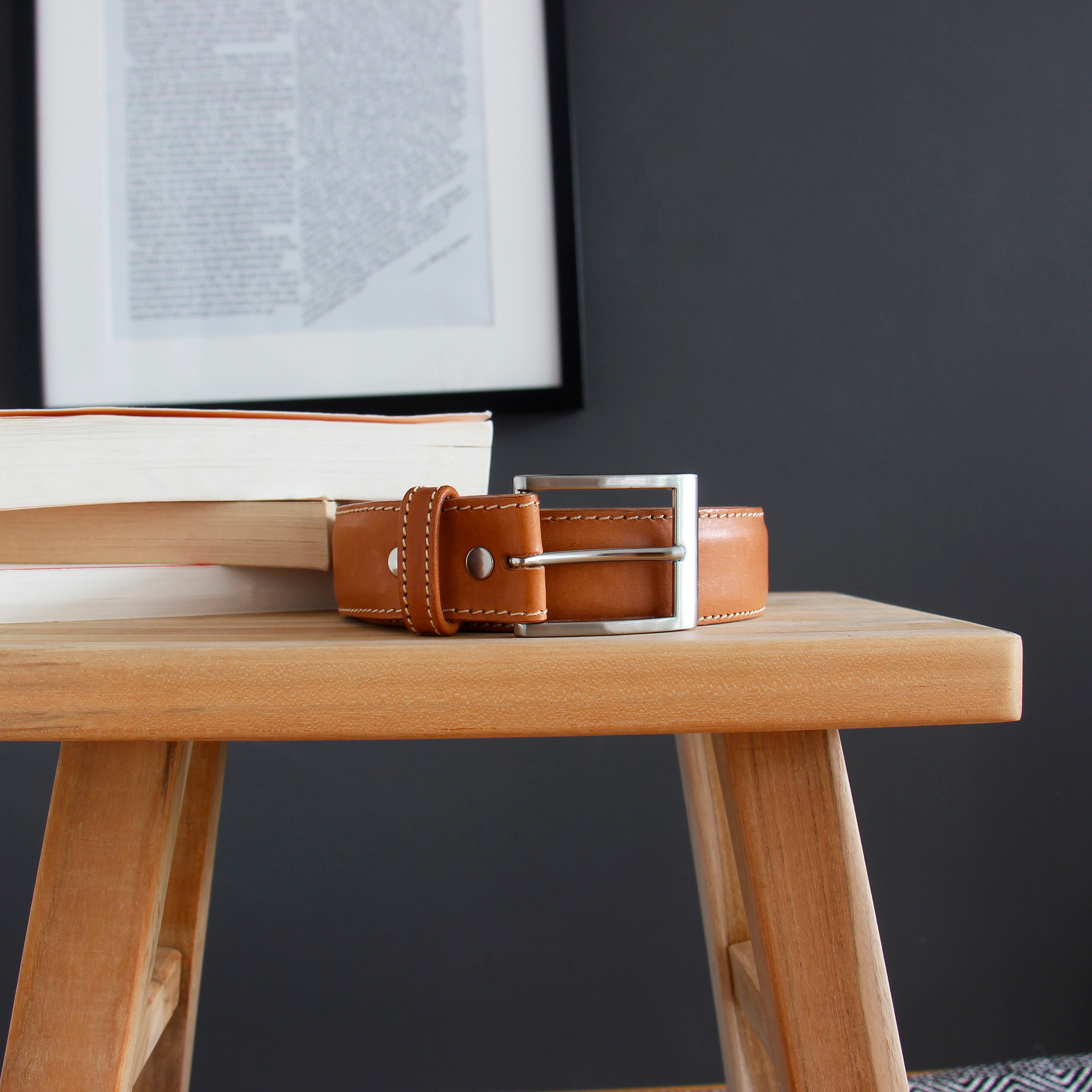 Ceinture homme en cuir marron cognac. Cuir de veau pleine fleur d'origine Italie et doublure cuir végétal naturel. Largeur ceinture : 3,5cm. . Boucle en métal brossé argent de dimensions : 5,5cm x 4,5cm. Porté ajustable grâce à ses 7 trous.