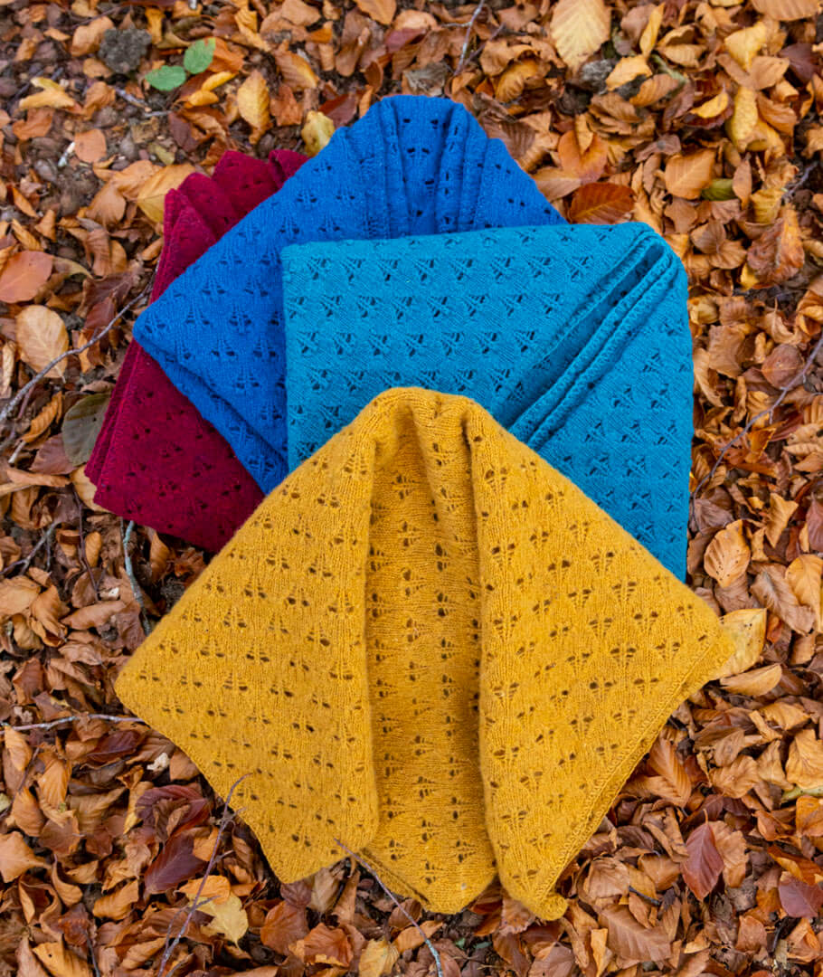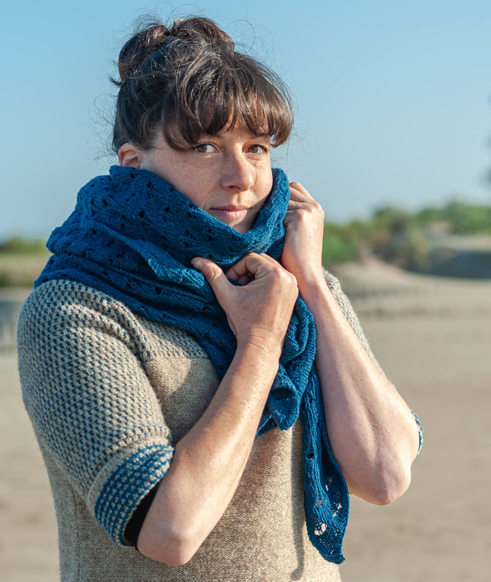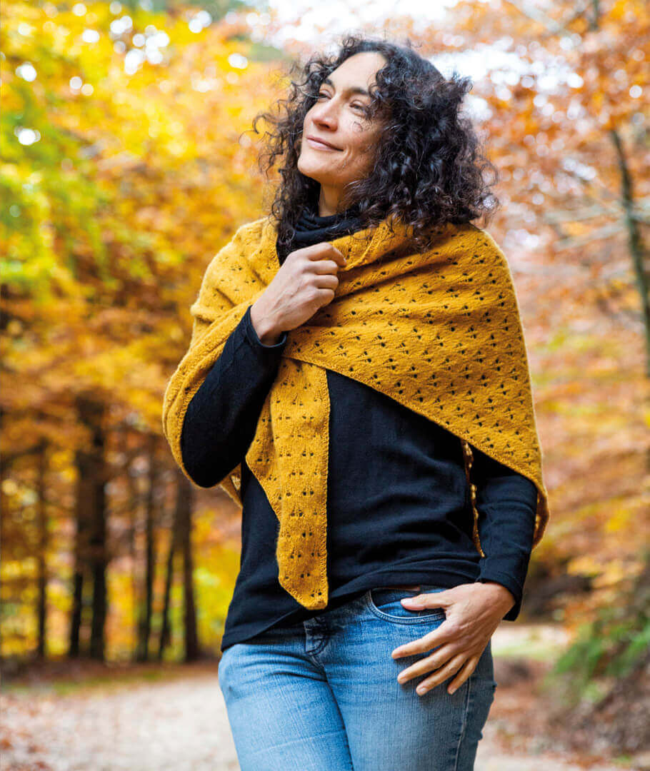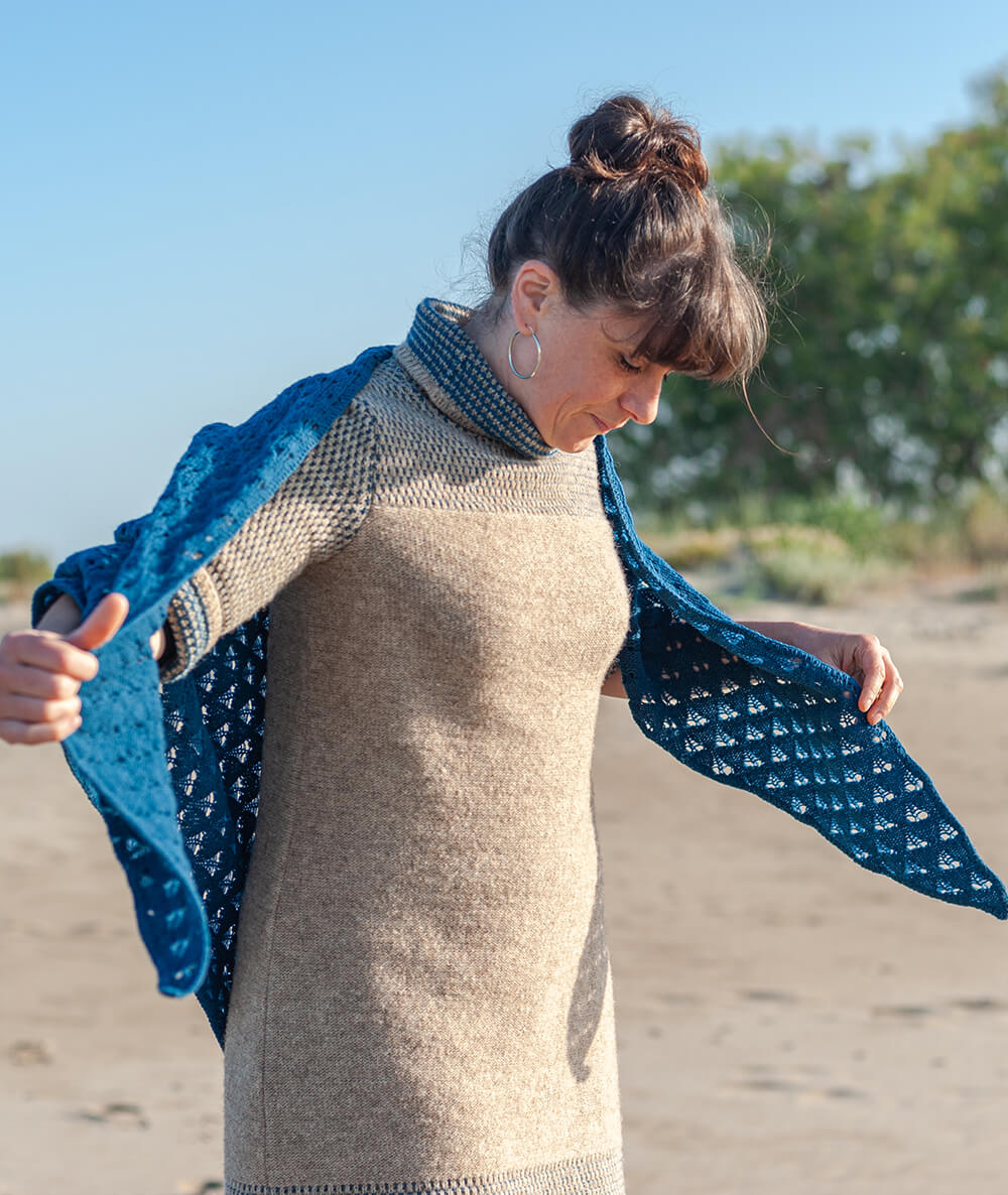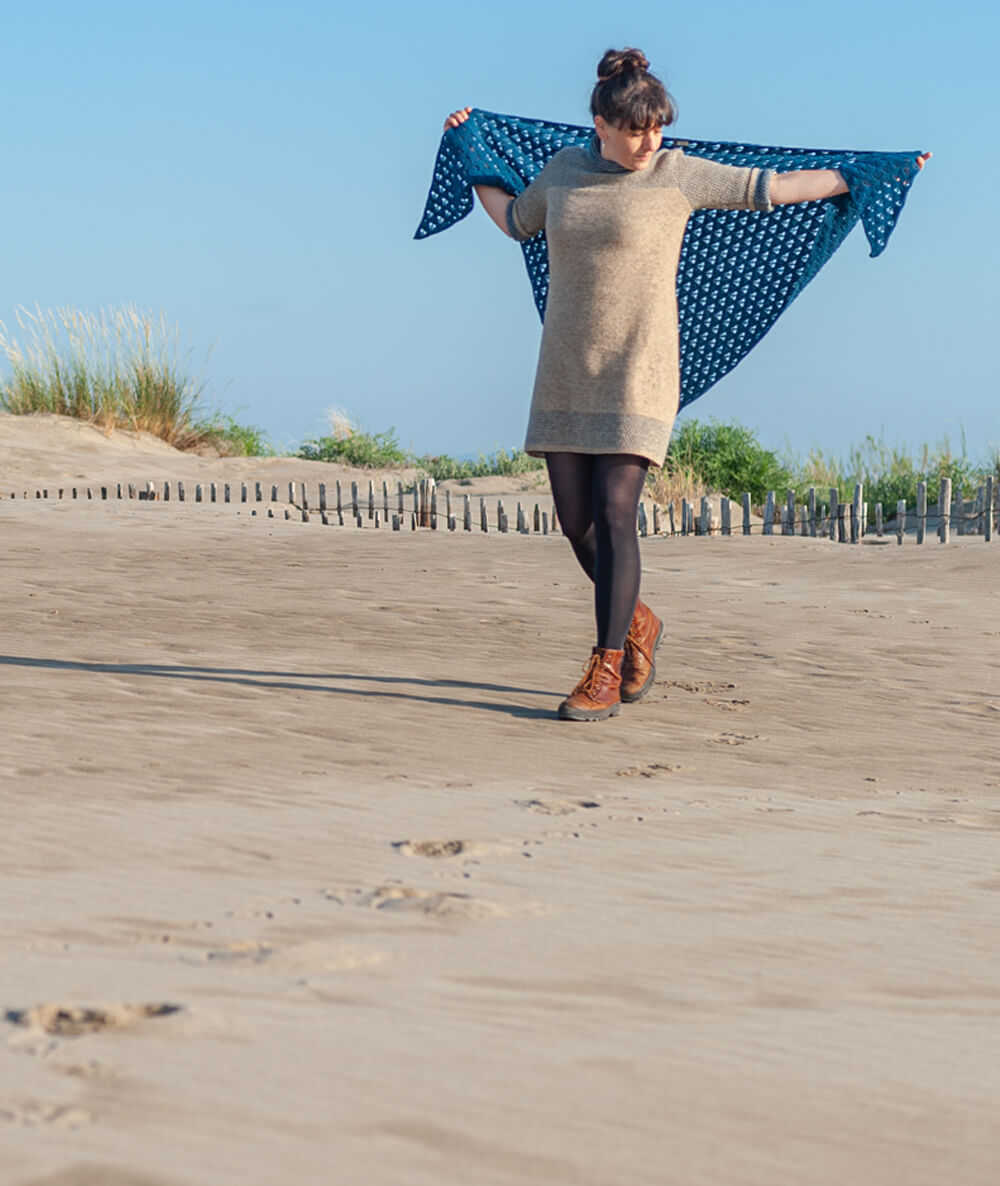 100 % laine, maille ajourée souple. Taille unique: de forme triangulaire en 180 × 90 cm. Disponible en Indigo (teinture végétale), Grenade et Jaune. Fabriqué à Valence, Rhône-Alpes.