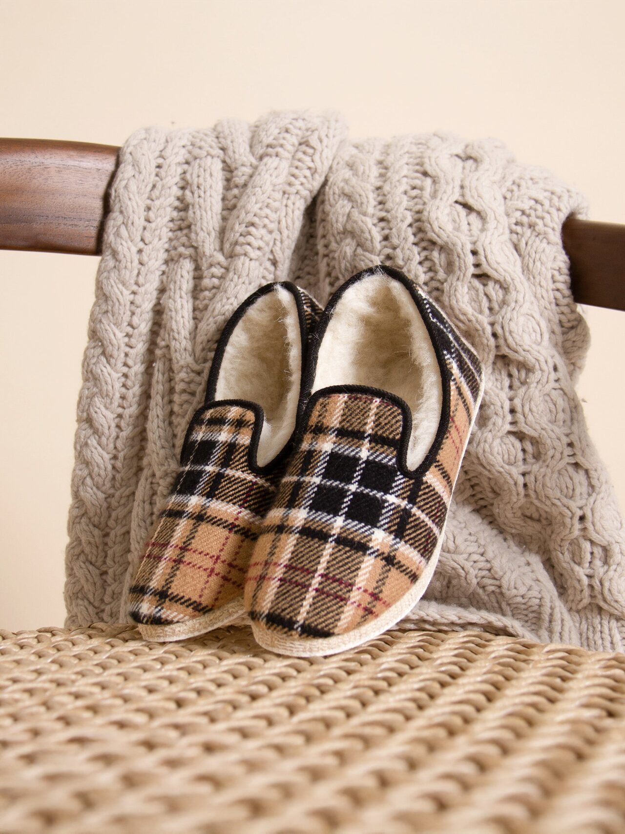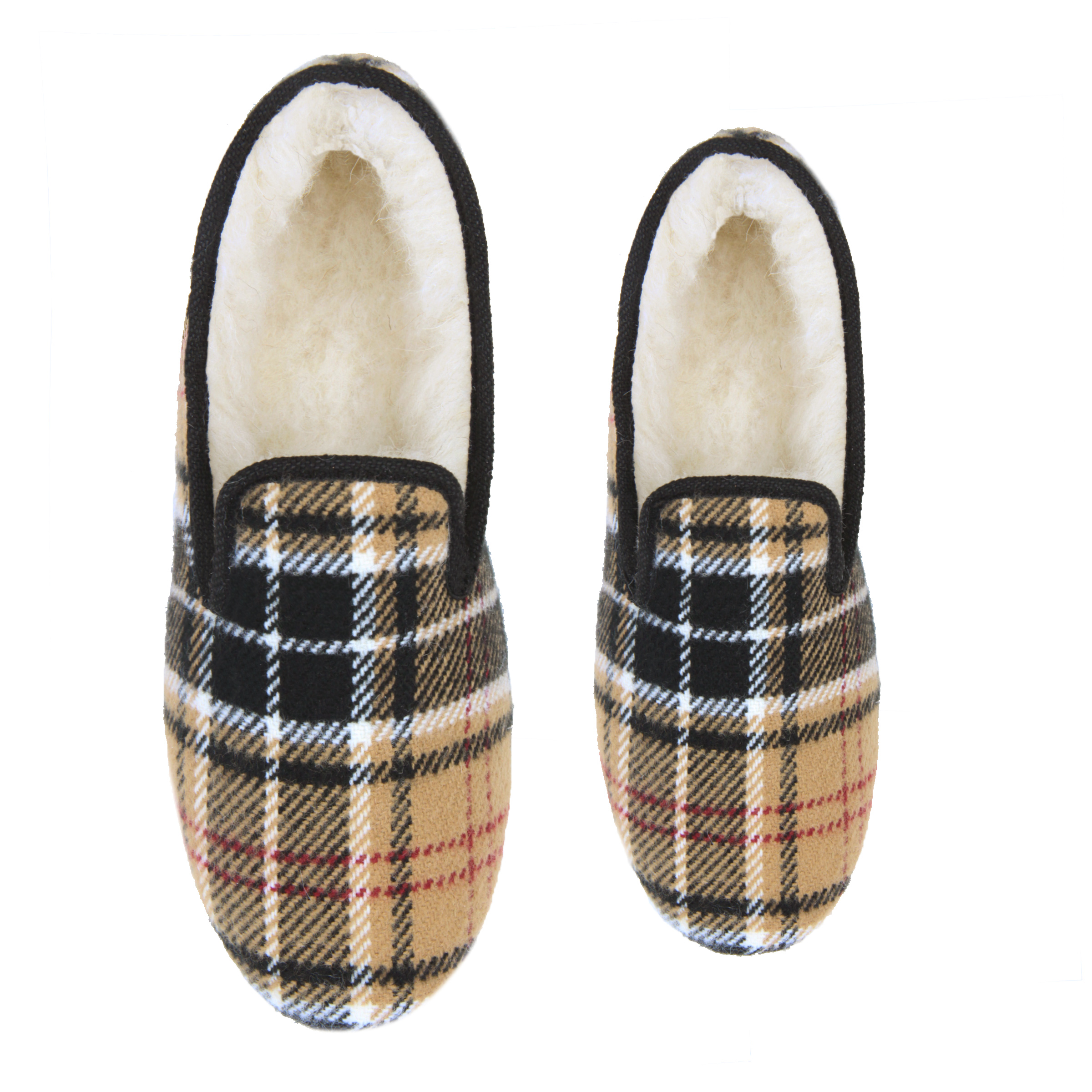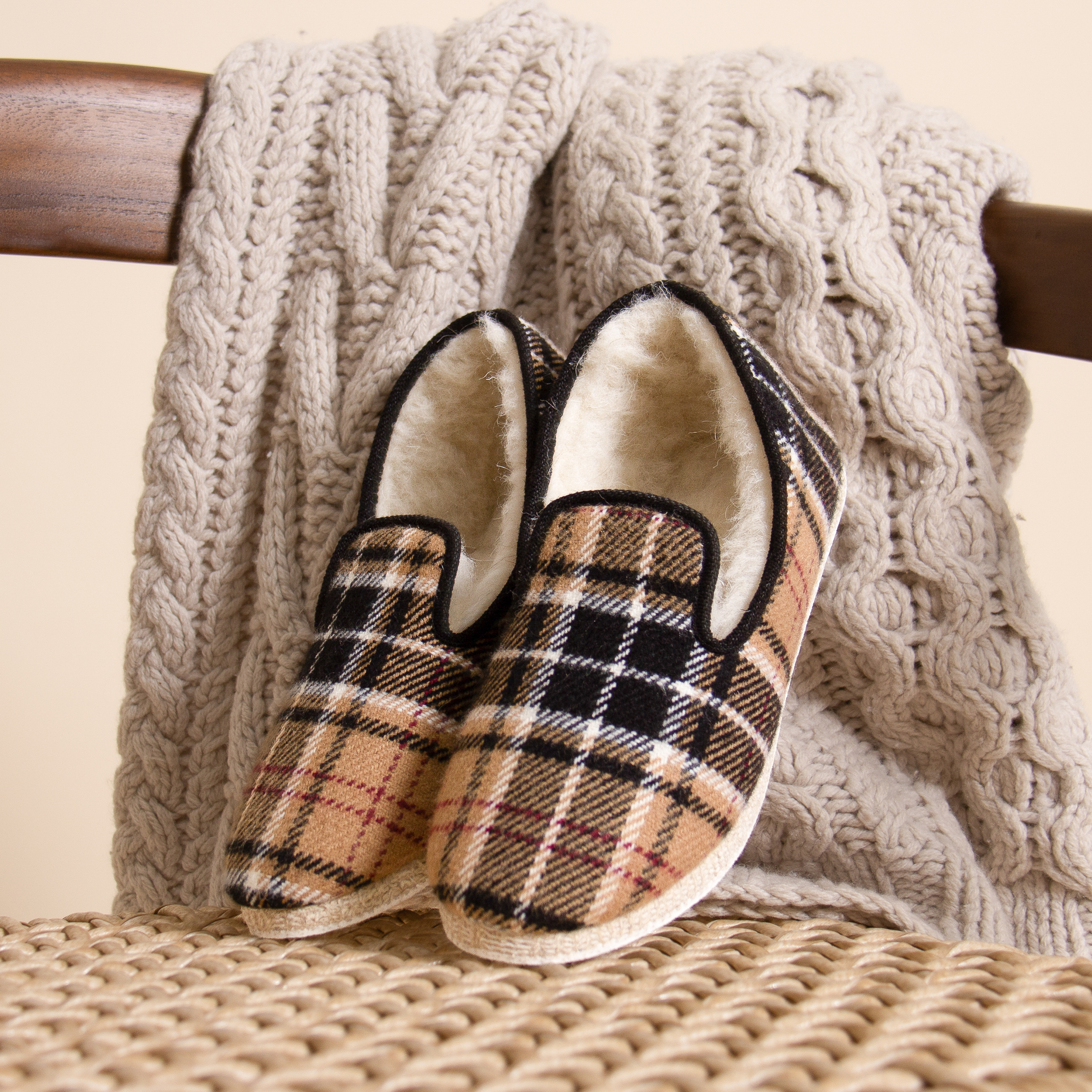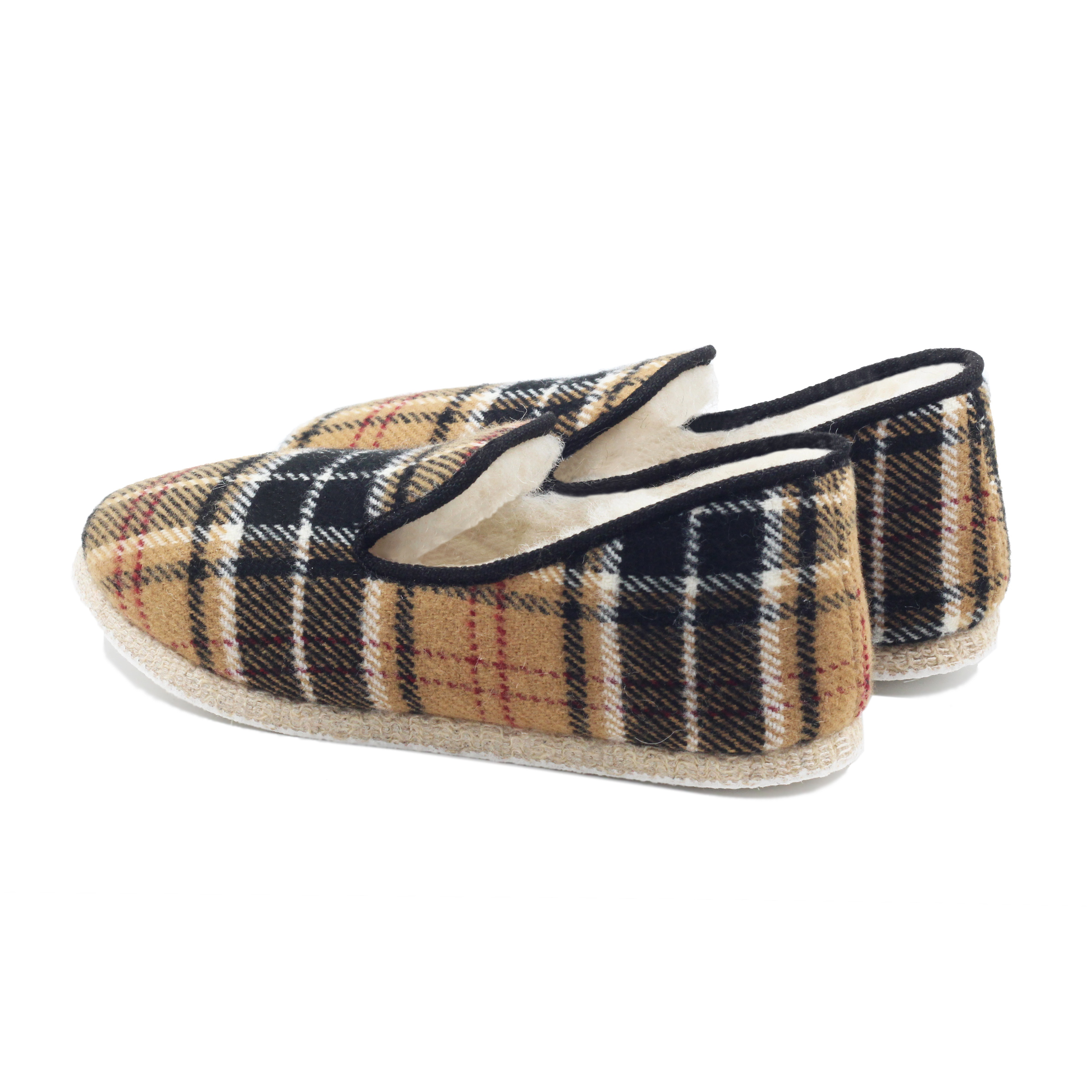 Charentaises en laine et coton écossais beige, fabriquées en France à La Rochefoucauld, en Charente. Aussi appelées pantoufles charentaises ou chaussons charentais, ces charentaises perpétuent une tradition ancestrale française apparue au XVIIe siècle. Doublure 100 % laine naturelle, tige coton. Semelle extérieure en feutre de laine contrecollé. Confectionnées selon la méthode traditionnelle du cousu retourné dans un atelier artisanal partenaire à La Rochefoucauld, berceau historique du chausson. Laine naturelle thermorégulatrice. Semelle feutre souple et silencieuse. Emballage certifié FSC et PEFC, réemployable et recyclable. Unisexe. Nos charentaises taillent petit, prenez la pointure supérieure. Si ce modèle vous serre, sachez que la laine prendra rapidement la forme de vos pieds. La laine se brosse à sec, évitez le lavage en machine. En cas de tache, épongez localement à l'eau tiède.