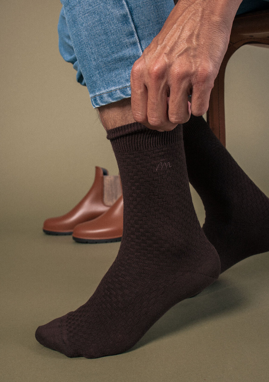 Le coffret de chaussettes unies ALVEOLE aux coloris intemporels seront les essentiels incontournables de votre vestiaire. Coffret 3 paires 3 coloris : marine, marron, anthracite Chaussettes gaufrées Coton biologique certifié GOTS Fil européen testé sans substances toxiques pour le corps et l'environnement Broderie M Jauge 14 46g la paire Certifiées Origine France Garantie Réalisées par une Entreprise du Patrimoine Vivant Fabriquées en France Emballages et packagings éco-conçus Conseils d'entretien : Nous vous conseillons de laver vos chaussettes en lavage délicat à 30°C et de ne pas les placer dans un sèche-linge.