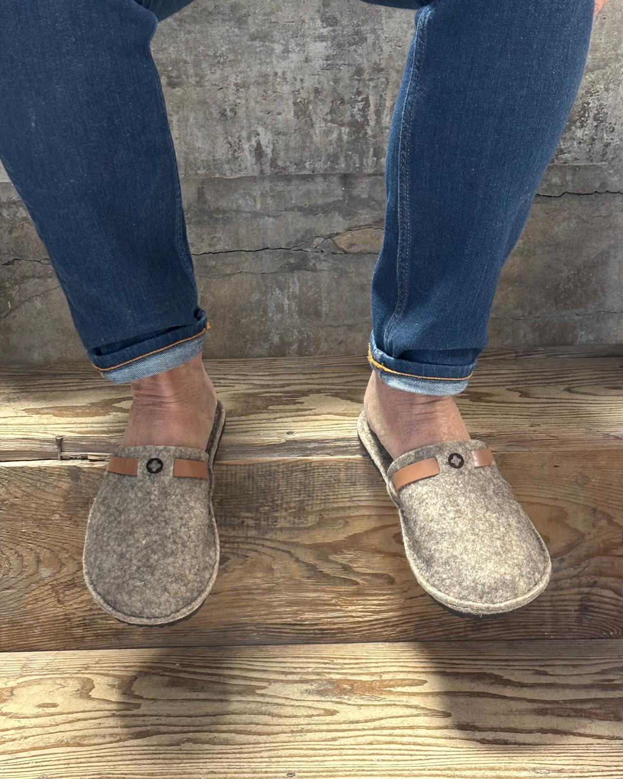 Chaussons artisanaux fabriqués à la main en Isère.Le dessus et la semelle intérieure en laine grise produite artisanalement procure un aspect et un confort unique.La semelle en caoutchouc micro cellulaire permet une utilisation en extérieur.Chaussons unisexes