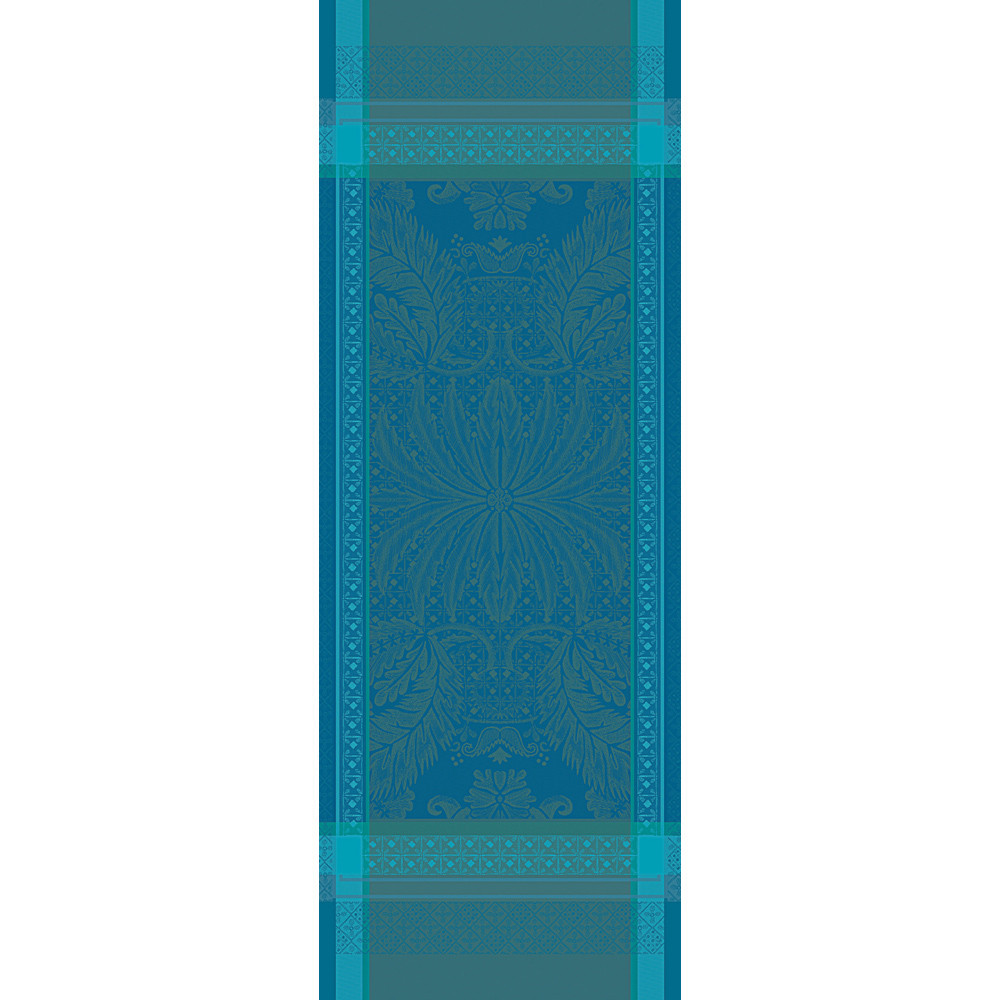 Fabriqué en France par GARNIER THIEBAUT, ce chemin de table fait partie de la collection ISAPHIRE émeraude. De jolis motifs ornementaux qui s'entrecroisent, dans divers tons de bleu. Il se compose de 100% coton damassé jacquard.