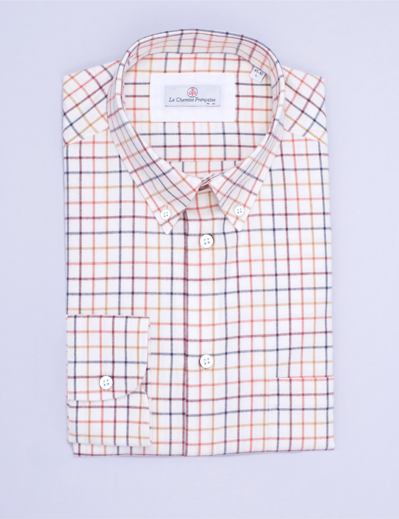 Pensée pour la mi-saison, cette chemise en flanelle légère 100 % coton conjugue douceur et chaleur maîtrisée. Son carreau multicolore sur fond ivoire signe un style intemporel, facile à associer sous une veste, un blouson ou un pull. Détails de la chemise :Flanelle légère 100 % coton, toucher doux (brossage)Motif carreaux anglais multicolore, fond ivoireCol boutonnéPoignets simples rondsCoutures anglaises rabattues et 7 points par cmBoutons en nacre naturelle renforcés Confectionnée en France, à Chalon-sur-Saône en Bourgogne, par nos Artisanes-Couturières. Choix de la coupe :Coupe Droite : silhouettes avec de l’embonpoint Coupe Ajustée : silhouettes athlétiques ou légèrement enrobées Le mannequin mesure 1m88 et porte une taille M, coupe droite.Supplément de 20 euros à partir de la taille 3XL. Refabrication possible même en cas d'épuisement des tailles.