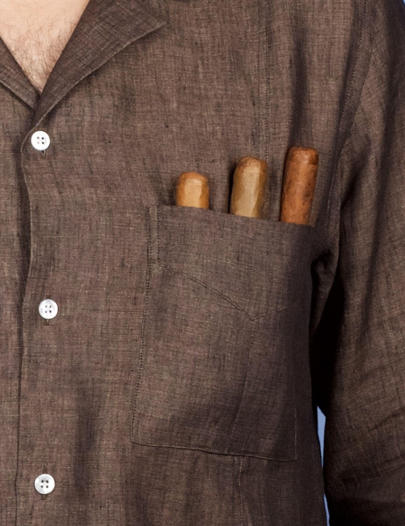Comme un souffle d’évasion, la Chemise Aficionado naît de la rencontre entre l’élégance française et l’âme chaleureuse de la guayabera. Fruit d’une collaboration exclusive avec le pianiste et expert en cigares Paul Montag, elle est taillée dans un lin normand d’exception et se distingue par un pli poitrine raffiné. Détails de la chemise : Col cubain Poche poitrine avec compartiment à cigares caché Deux poches à soufflet Pli poitrine raffiné Patte de manche « capucin » Coutures anglaises rabattues et 7 points par cm Fentes latérales Boutons en nacre naturelle renforcés Confectionnée en France, à Chalon-sur-Saône en Bourgogne, par nos Artisanes-Couturières. Le mannequin mesure 1m88 et porte une taille M.