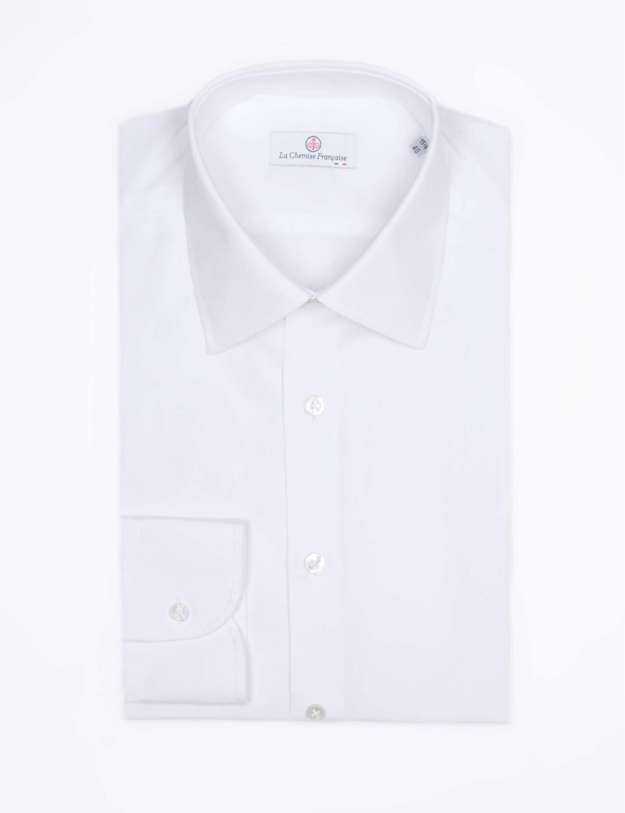 Épure du vestiaire dans son blanc lumineux, cette chemise en popeline 100 % coton double retors associe tenue nette et douceur soyeuse. Le double retors — deux fils torsadés avant tissage — offre un fil plus régulier, plus résistant et durable. Le col français dessine une ligne précise sous la veste, tandis que les coutures anglaises rabattues (7 points/cm) et les boutons en nacre naturelle signent des finitions haut de gamme. Confectionnée en France, à Chalon-sur-Saône en Bourgogne, par nos Artisanes-Couturières. Choix de la coupe : Coupe Cintrée : silhouettes fines Coupe Ajustée : silhouettes athlétiques ou légèrement enrobéesCoupe Droite : silhouettes avec de l’embonpoint Le mannequin mesure 1m88 et porte une taille 40, coupe ajustée. Supplément de 20 euros à partir de la taille 47.