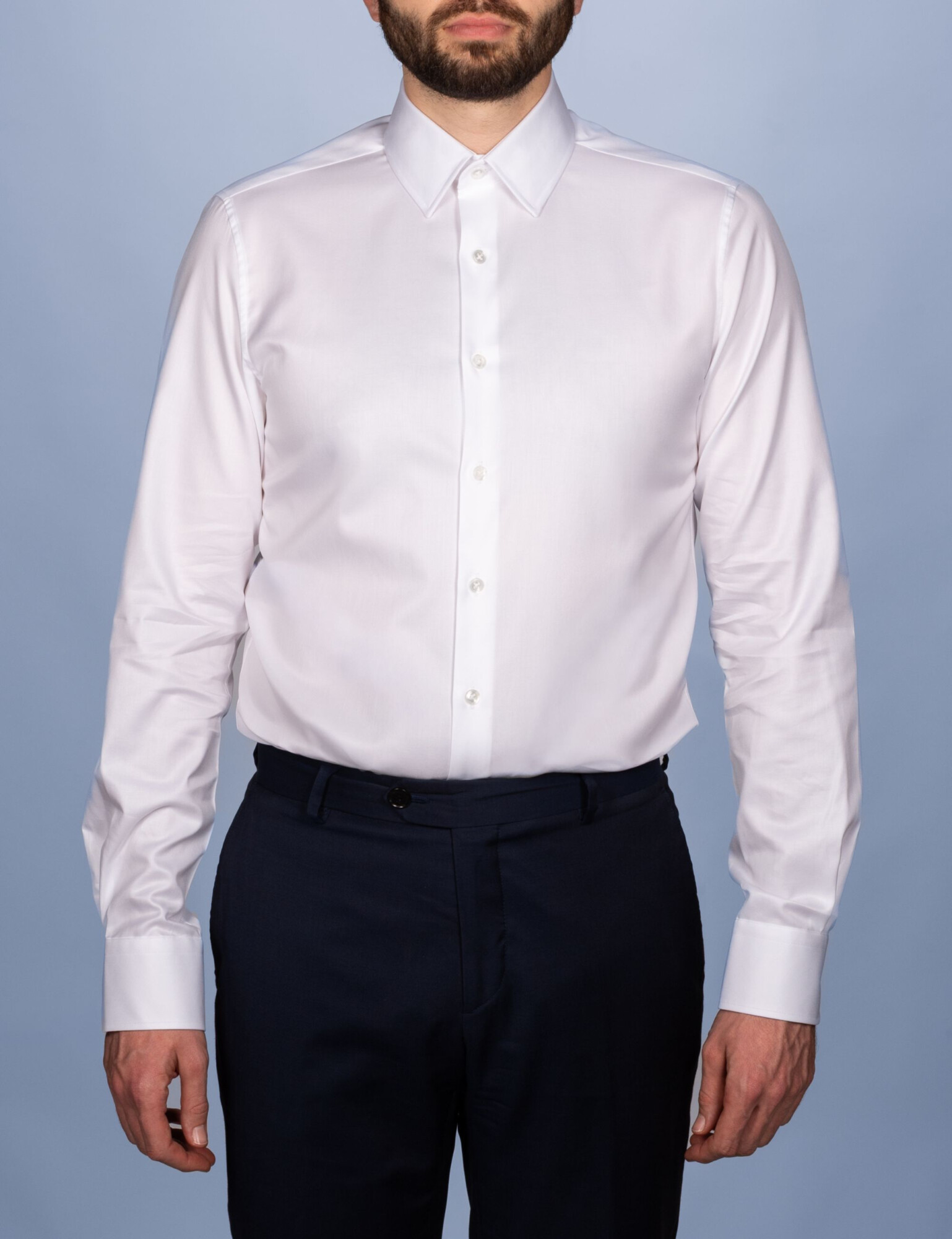 Épure lumineuse du vestiaire, cette chemise en twill fin 100 % coton double retors révèle une diagonale discrète qui apporte douceur, opacité et tombé fluide, tout en limitant le froissage. «Double retors » signifie que deux fils de coton sont d’abord torsadés ensemble avant d’être tissés : on obtient ainsi un fil plus régulier, plus résistant et plus stable dans le temps. Son petit col français, aux pointes plus courtes, signe une allure contemporaine inspirée des 60s : précis sous une veste aux revers fins, il se porte aussi impeccablement ouvert, sans cravate.Les coutures anglaises rabattues (7 points/cm) et les boutons en nacre naturelle signent des finitions haut de gamme. Confectionnée en France, à Chalon-sur-Saône en Bourgogne, par nos Artisanes-Couturières. Choix de la coupe :Coupe Cintrée : silhouettes finesCoupe Ajustée : silhouettes intermédiairesCoupe Droite : silhouettes avec de l’embonpoint Le mannequin mesure 1m88 et porte une taille 40, coupe cintrée.Supplément de 20 euros à partir de la taille 47.