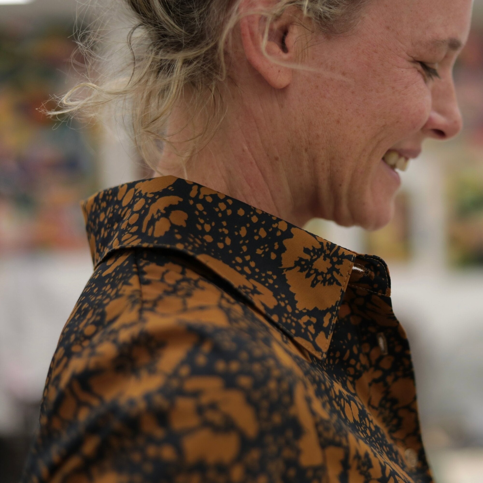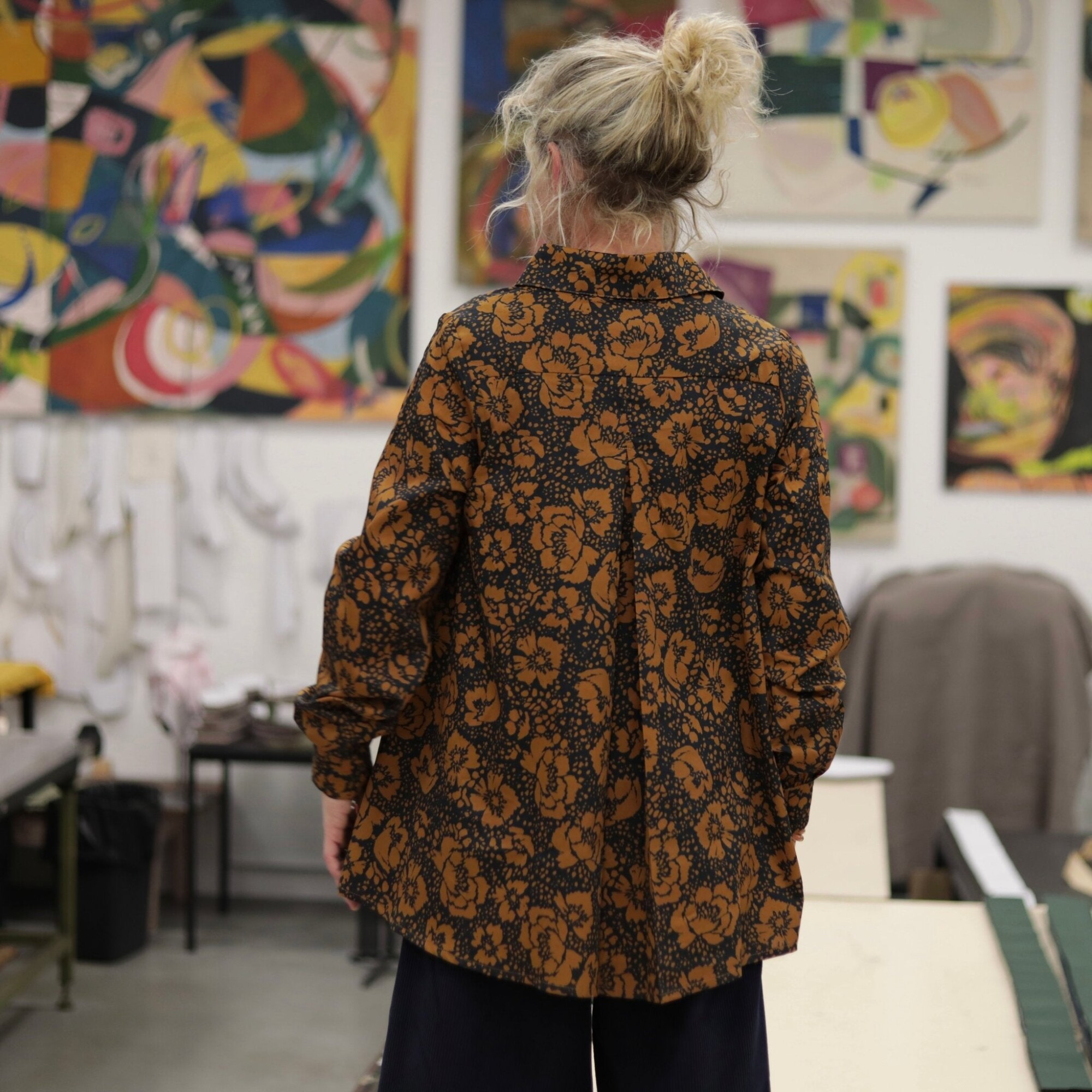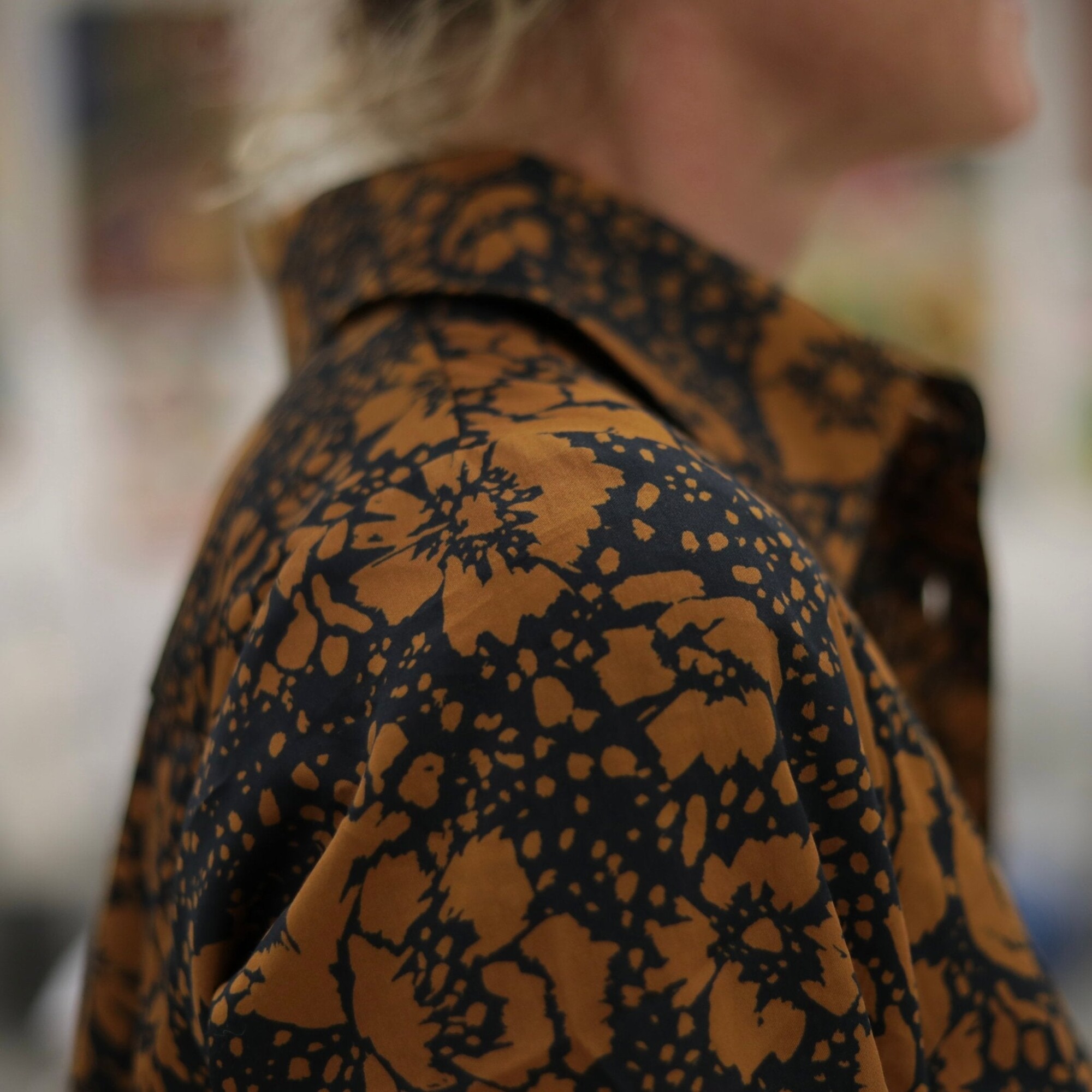 La chemise Caroline s’habille ici d’un somptueux satin de coton Fleurs de Curcuma, un imprimé chaleureux mêlant jaune épicé, ocre et touches sombres pour une allure vibrante et élégante. Sa texture lisse et satinée offre un confort exceptionnel et une luminosité subtile.
