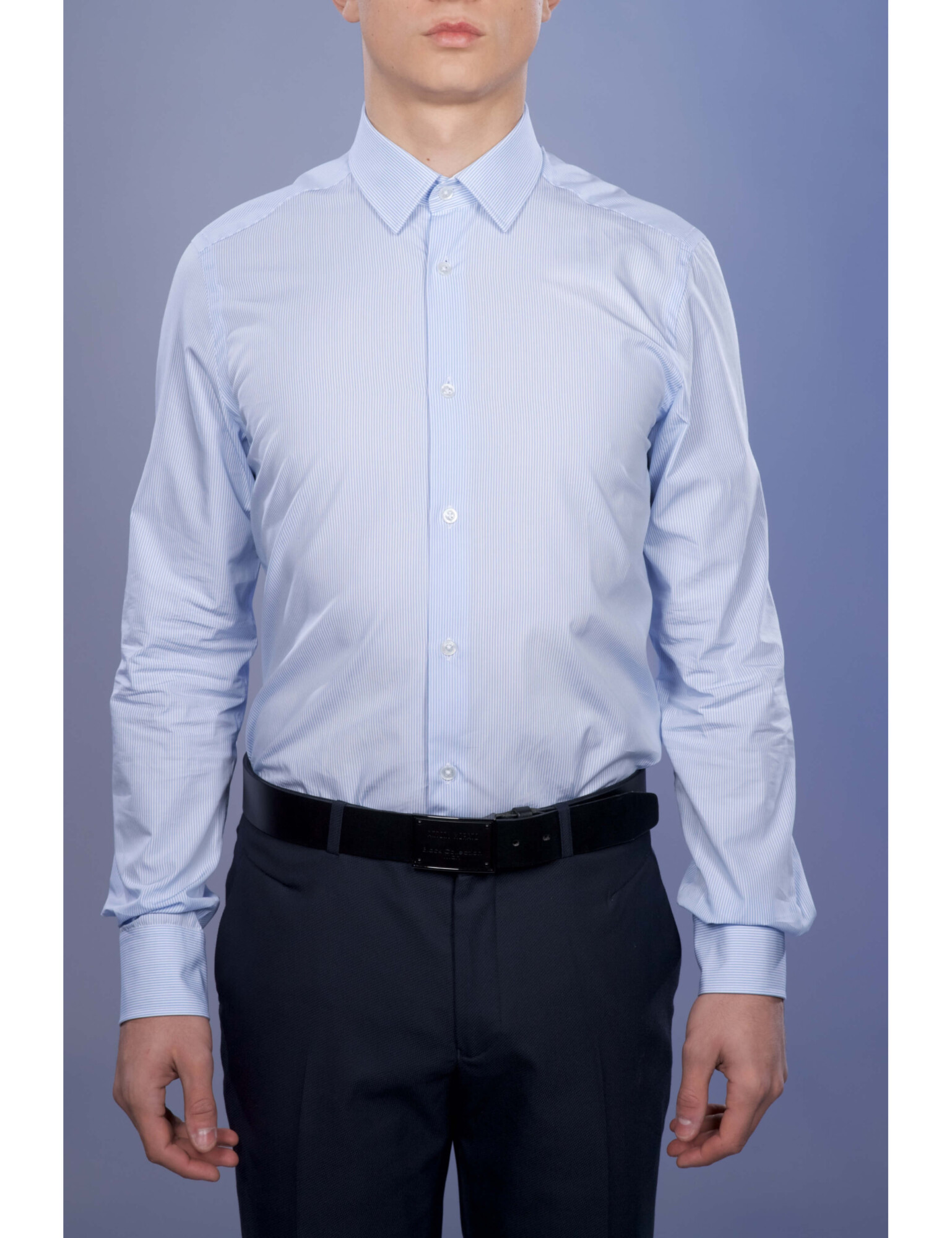 Chemise Rayure Bâton Bleu 2mm - Petit Col Français - Coupe Ajustée