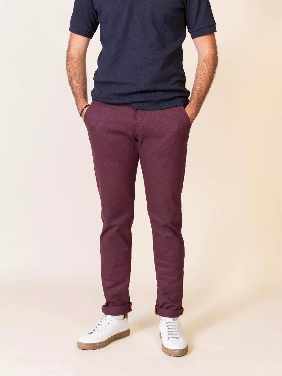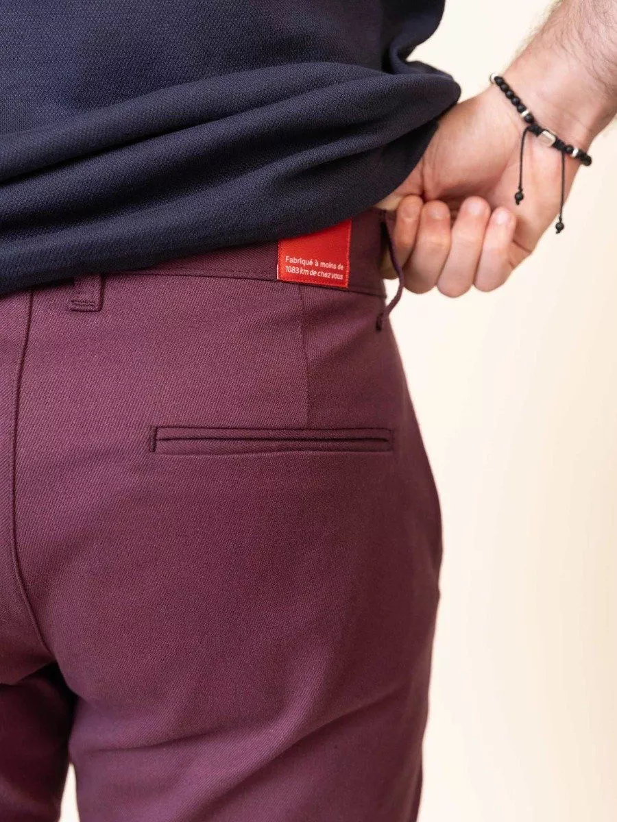 LE PANTALON CHINO PRUNE Le pantalon chino prune, un intemporel à porter en toute saison et toutes occasions. Sa coupe ajustée va à tout le monde, son coton est 100 % bio, son bouton est en bois du Jura… c’est le chino 1083 ! Ce modèle 163N est fabriqué en France dans nos ateliers à moins de 1083 km de chez vous.