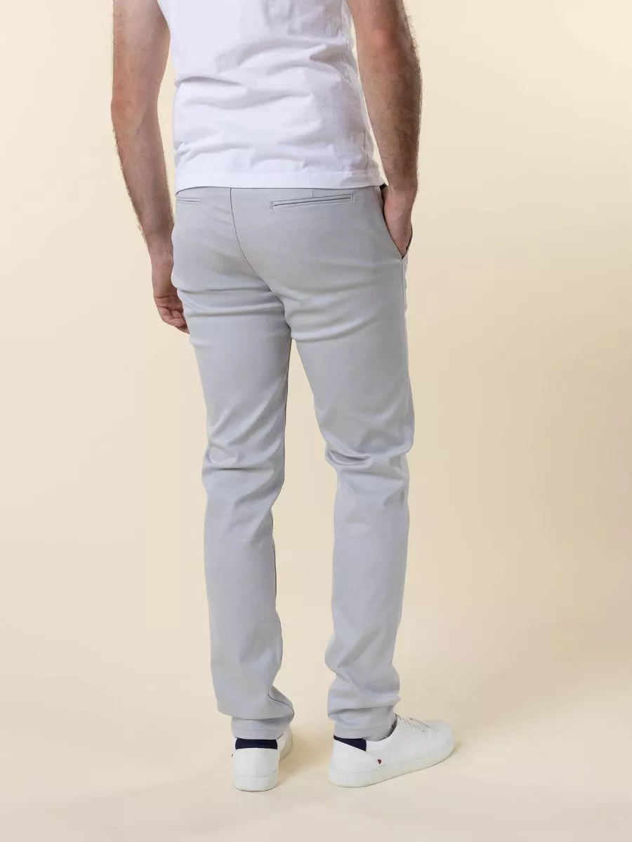 CHINO BLEU GLACIER HOMME : FRAÎS ET ÉLÉGANT Un intemporel de la collection 1083 décliné en un coloris apaisant et lumineux: le chino bleu glacier pour homme ! Sa coupe ajustée, entre le slim et le droit s'accorde avec toutes vos tenues et son denim en coton bio vous offre un confort inégalé pour un chino. Facile à associer, ce bleu très clair tire subtilement vers le gris ou le bleu ciel selon la lumière, pour un rendu moderne, raffiné et intemporel.