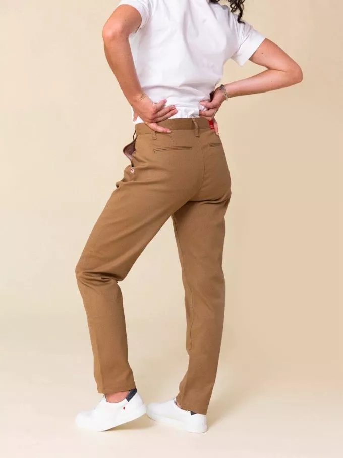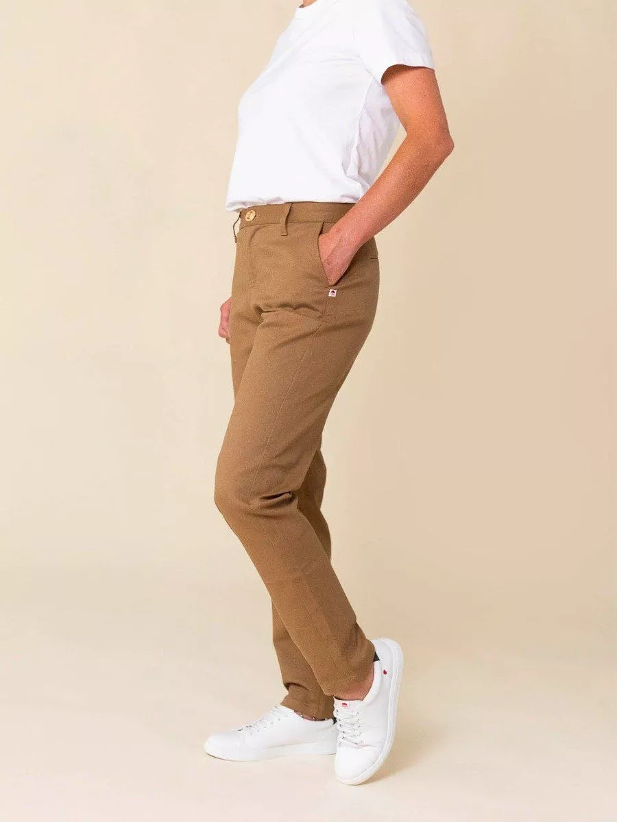 LE PANTALON CHINO MARRON FEMME L'indémodable chino marron pour femme, vous l'attendiez avec impatience, on l'a fait ! C'est le coloris parfait pour être porté durant la saison automnale. Grâce à sa fabrication française, de la filature dans les Vosges à la confection à Marseille, son impact CO2 est réduit.