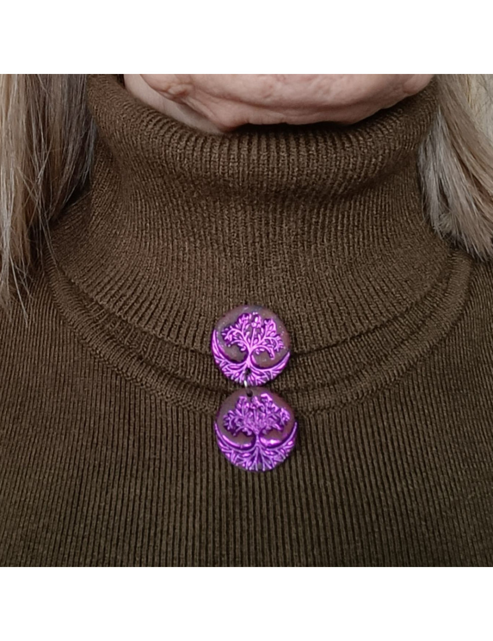 Sublimez instantanément votre pull à col roulé ou col montant avec ce magnifique clip décoratif arbre de vie violet irisé !Entièrement réalisé à la main en pâte polymère, ce bijou de col léger et résistant apporte une touche bohème, ésotérique et élégante à vos tenues d'hiver. Clip décoratif pour col roulé en pâte polymère – Motif Arbre de Vie violet irisé. Accessoire fait main original pour customiser et sublimer un pull à col montant ou un sweat. Pièce unique artisanale, légère et facile à fixer. Caractéristiques :Motif : Arbre de Vie finement sculptéCouleur : Violet profond avec reflets irisés (change selon la lumière)Diamètre de chaque pastille : environ 2,5 cmSystème de fixation : clip métallique discret et solide (s'accroche facilement sur maille fine ou épaisse)Poids : très léger, ne tire pas sur le tissuPièce 100 % artisanale et uniquePas laisser à la portée des enfants Vernis résine UV