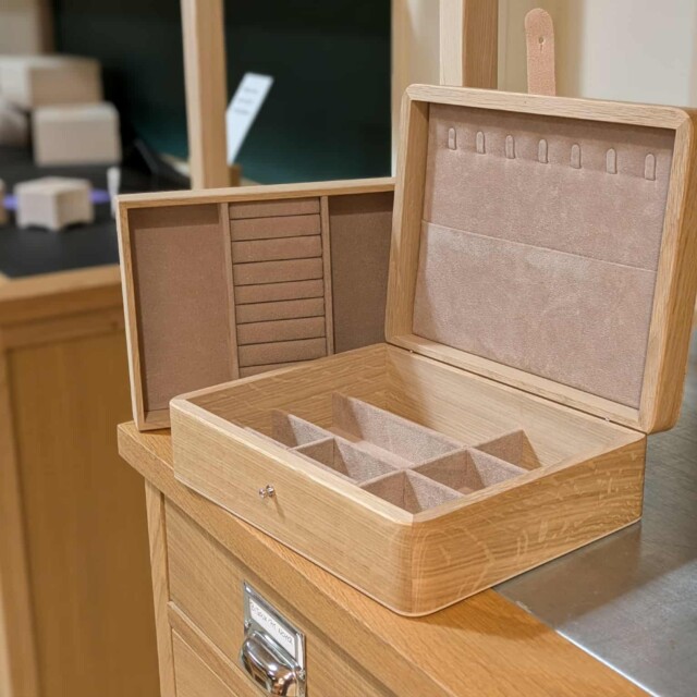 Ce grand coffret casier à bijoux en chêne incarne à merveille l’alliance entre élégance intemporelle et savoir-faire artisanal. Fabriqué dans le Jura, à partir de bois massif de chêne, soigneusement sélectionné pour ses nuances profondes et chaleureuses, il témoigne de notre passion pour les matériaux durables et authentiques.