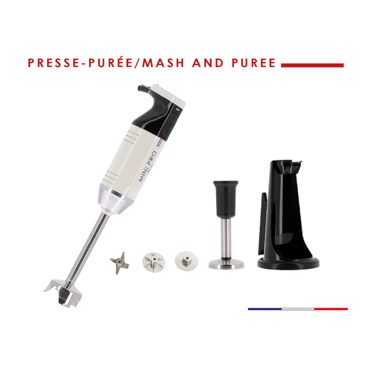 Ce coffret contient : un mixeur plongeant MINIPRO 700W (2 vitesses : 8000 et 13 000 tours /minute), un pack de 3 couteaux, un pied presse-purée et un support. Le pied presse-purée est un accessoire simple, facile à utiliser et vous permet de préparer une grande variété de plats, tels que les purées de légumes, les compotes de fruits. Il est facilement nettoyable.
