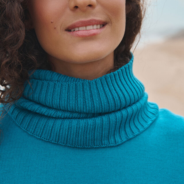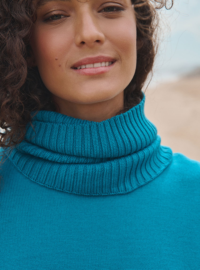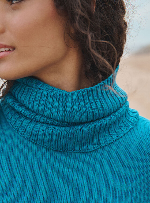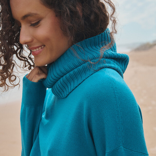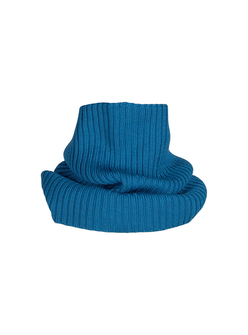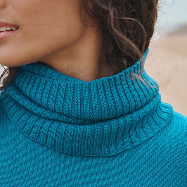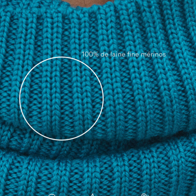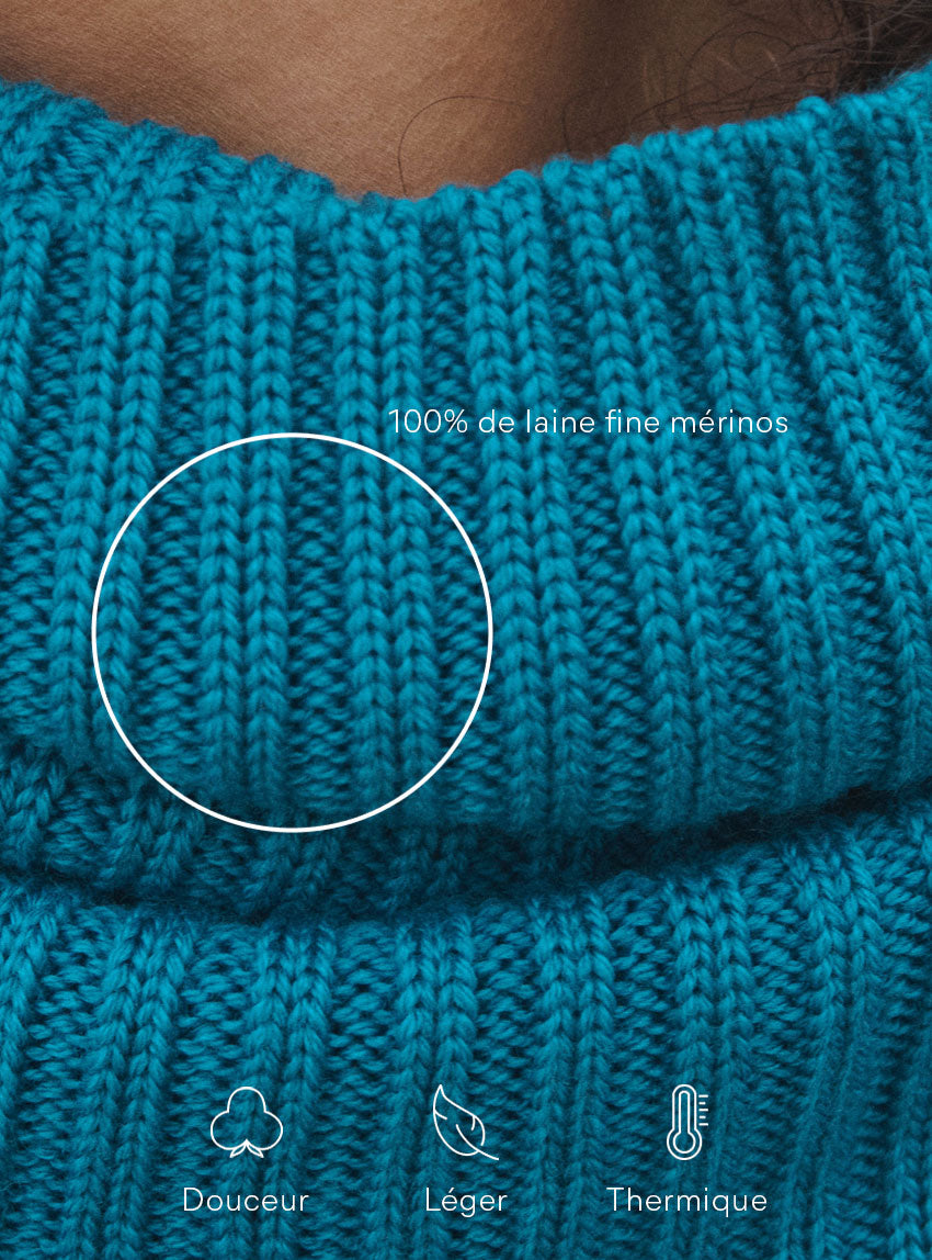 Le col Anaïs en bleu Atlantique allie chaleur et style avec son esprit snood moderne. Confectionné en maille côtelée 100 % laine mérinos, il forme un col tubulaire doux et enveloppant. Parfait avec le pull Agathe, il apporte une touche colorée et élégante à la silhouette. Un accessoire indispensable pour traverser l’hiver avec allure.