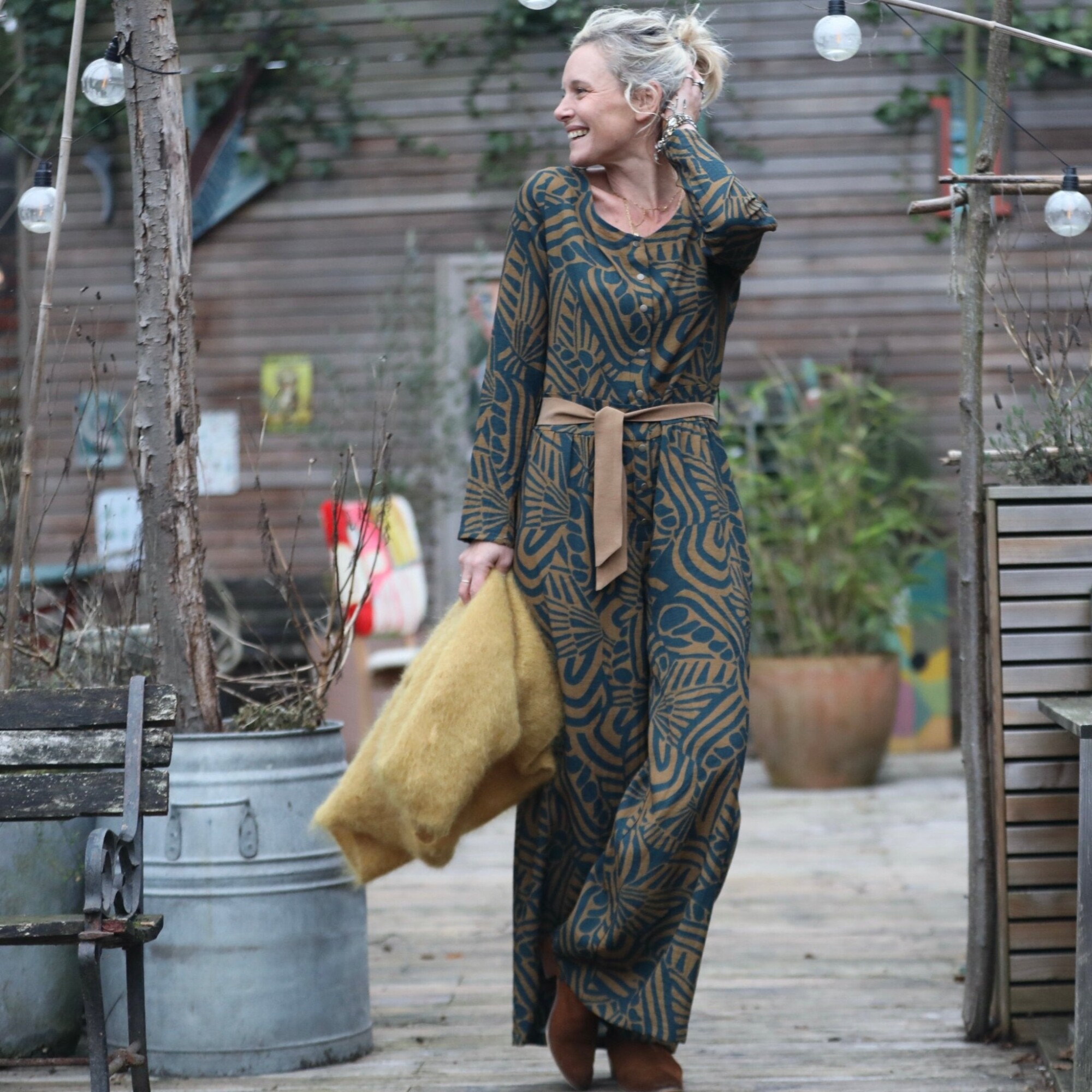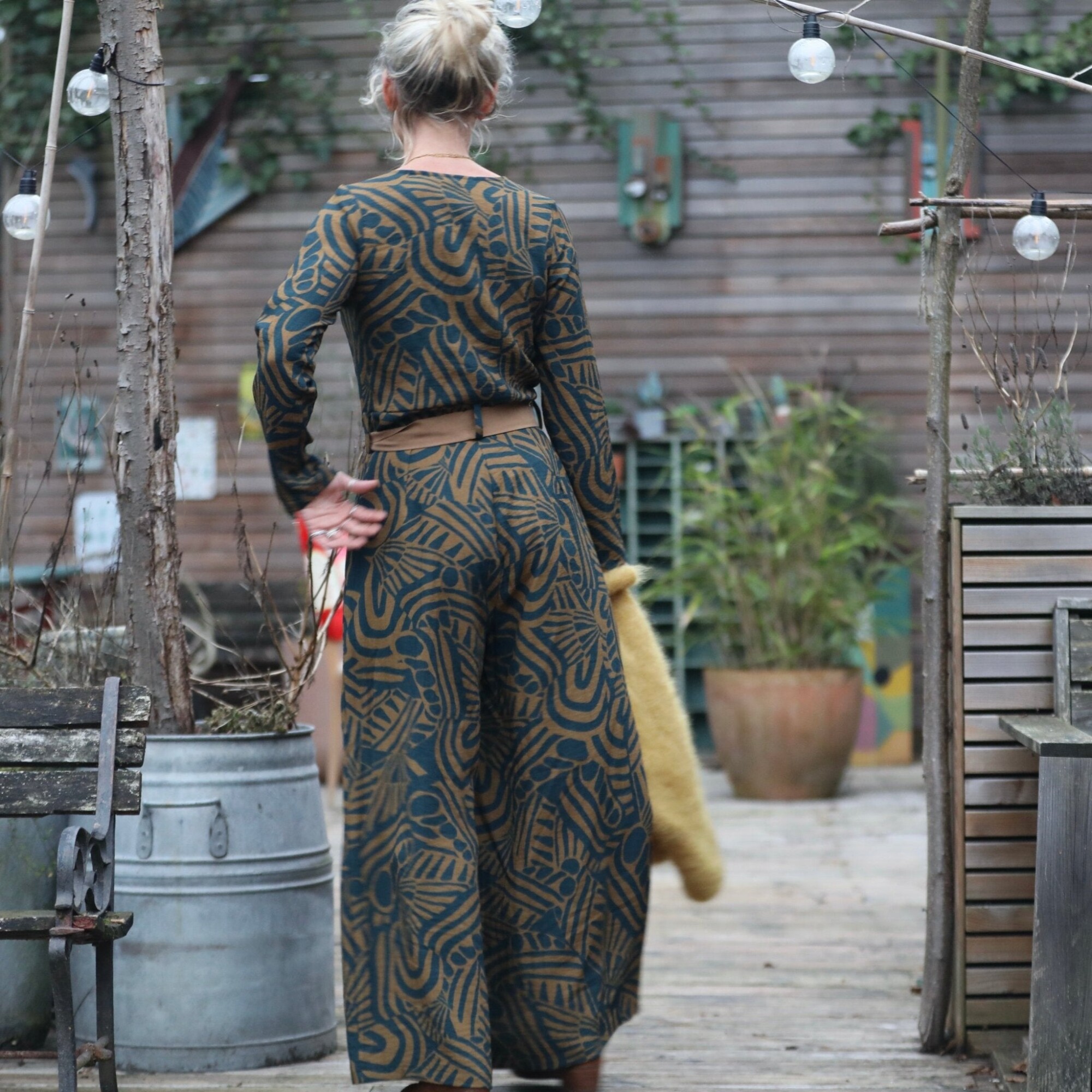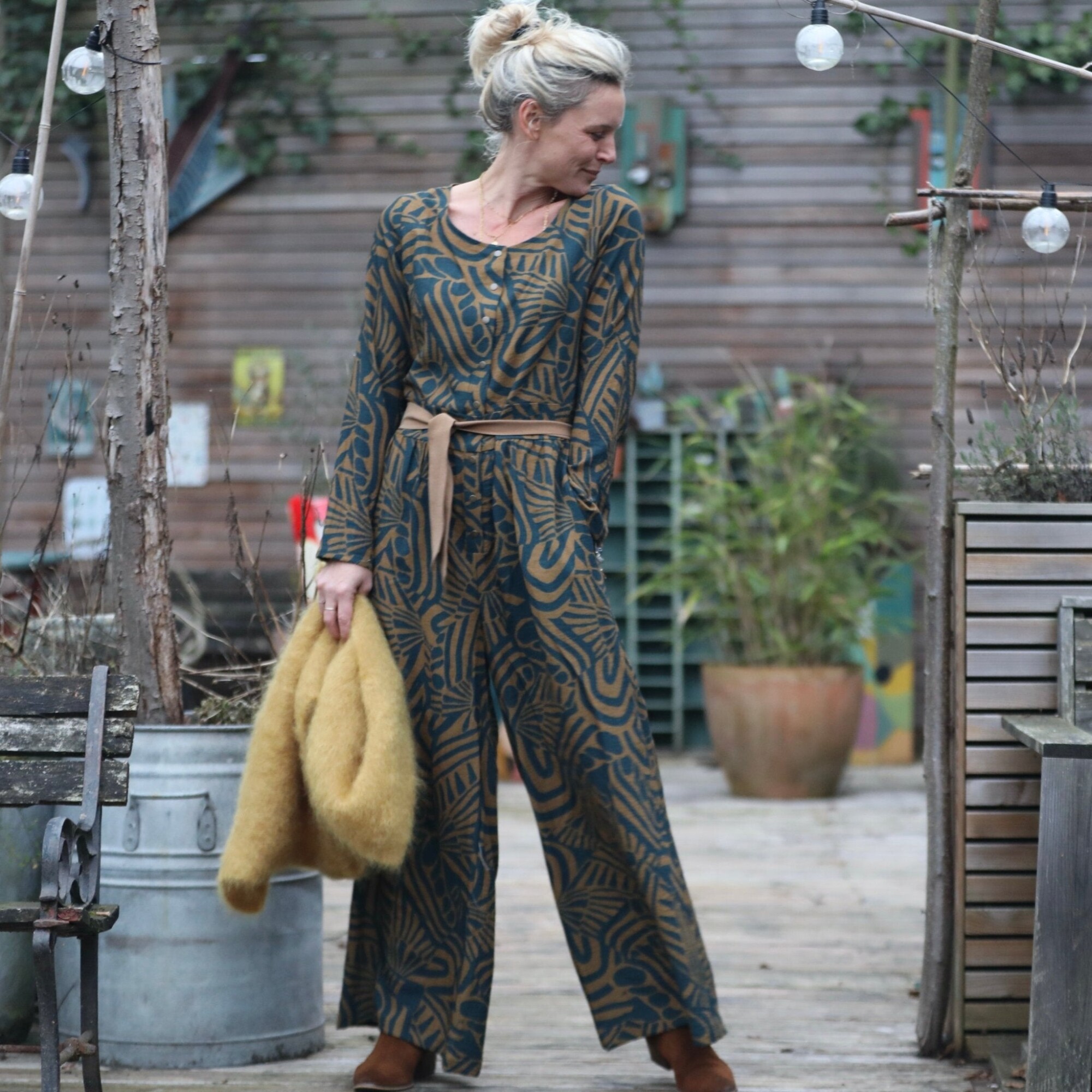 Perla est une combinaison ample, élégante et confortable. Elle est dotée de boutons-pression, de deux poches discrètes sur les côtés, d'une ceinture intégrée à la taille, ainsi que d'une ceinture amovible à passer dans des passants prévus à cet effet.