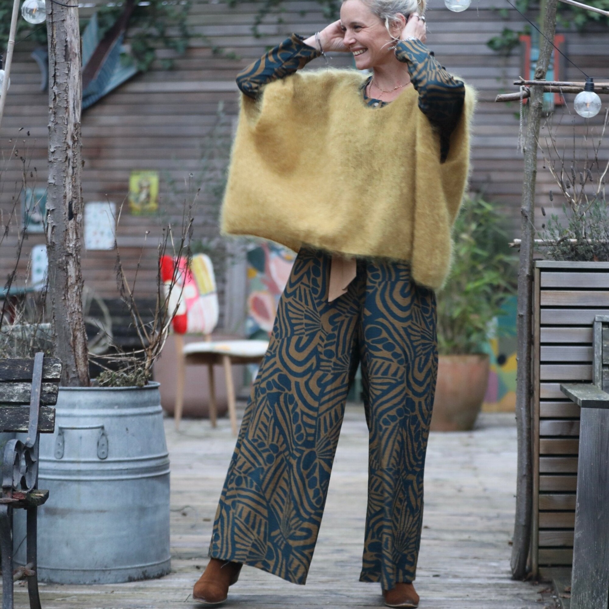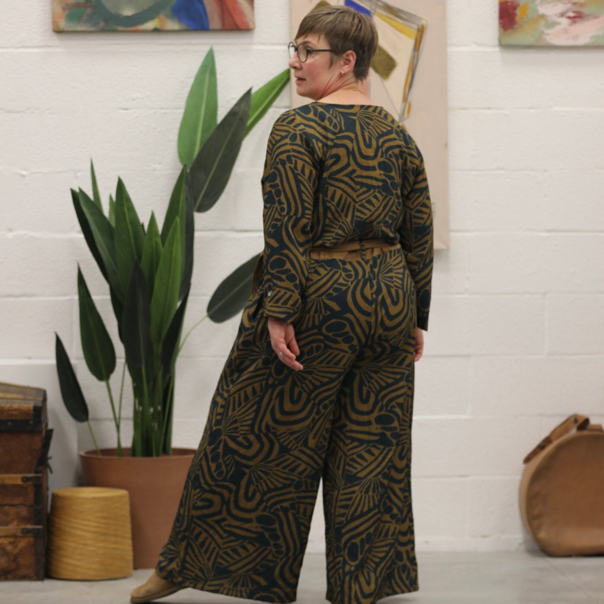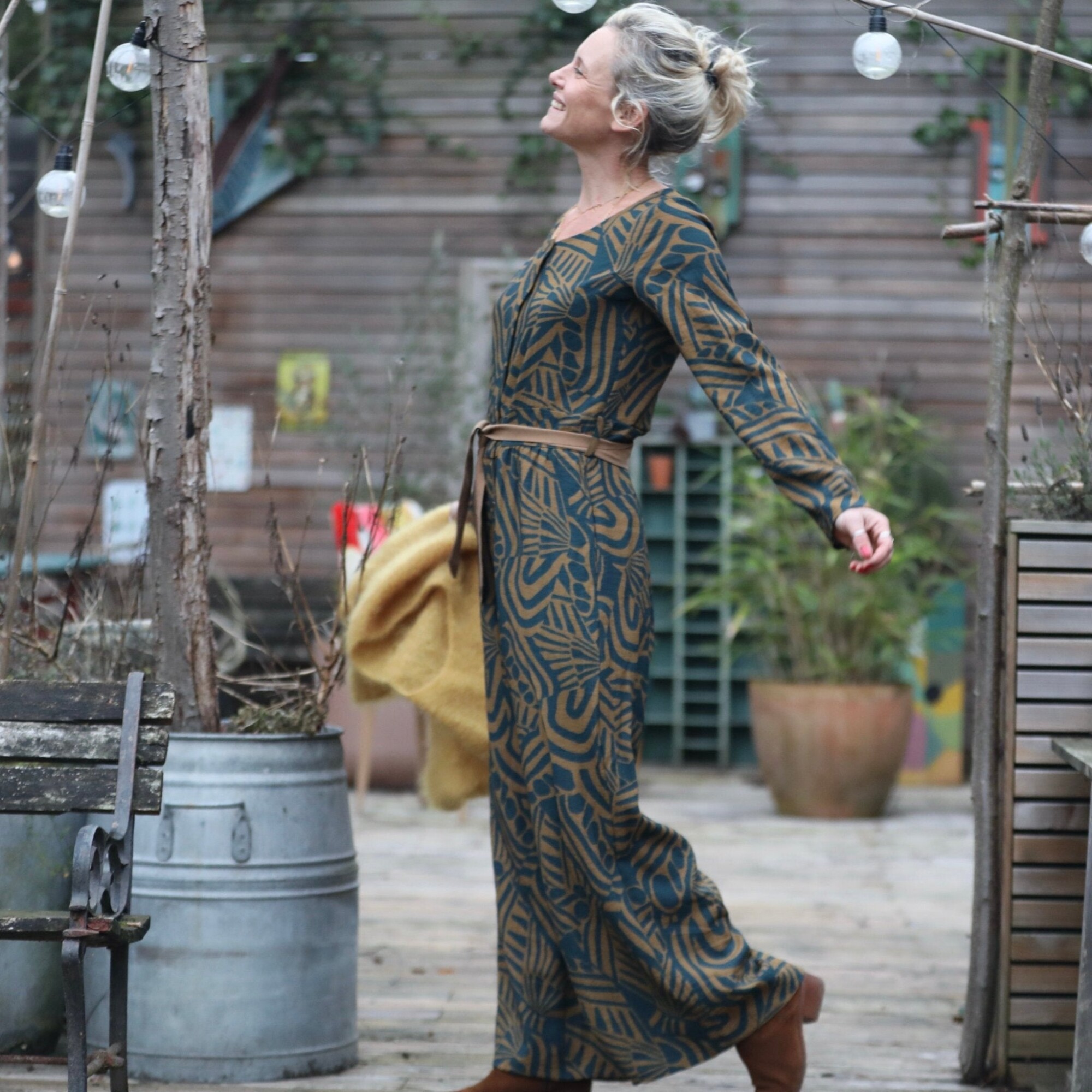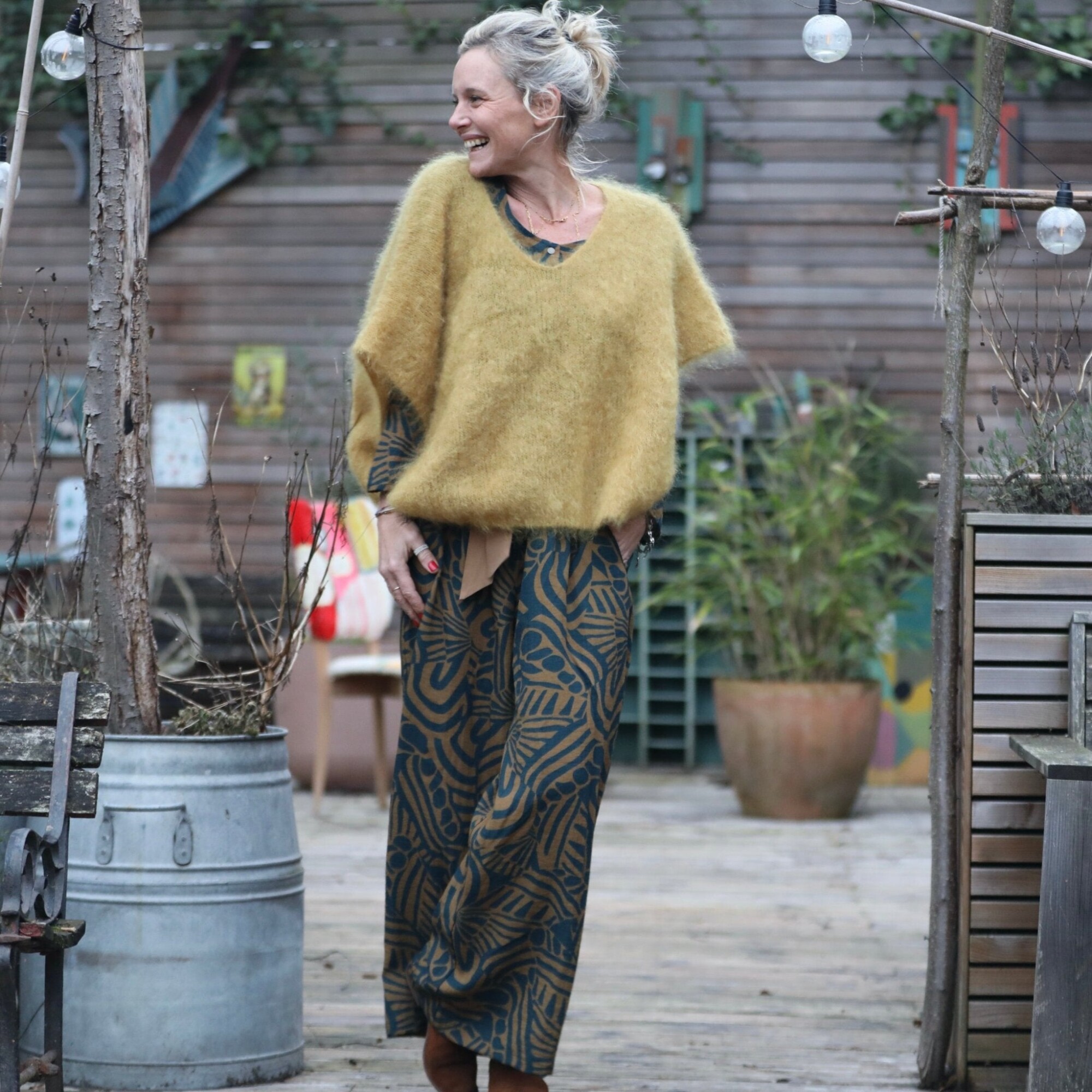 Perla est une combinaison ample, élégante et confortable. Elle est dotée de boutons-pression, de deux poches discrètes sur les côtés, d'une ceinture intégrée à la taille, ainsi que d'une ceinture amovible à passer dans des passants prévus à cet effet.