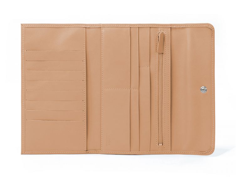 Combiné compact à 2 volets.Ouverture par un rabat et un bouton à pression.3 emplacements pour vos billets, vos notes de frais, votre chéquier et vos papiers d'identité.12 encoches de carte de crédit et une encoche pour les tickets de métro ou une photo.Porte-monnaie avec une fermeture à zip protégée.