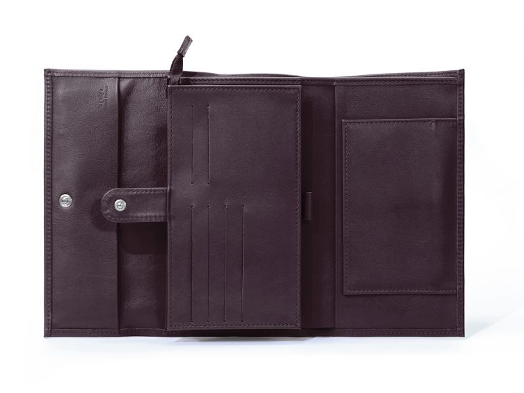 Tout en un, à 3 volets, avec une fermeture à rabat et un bouton pression.4 emplacements, dont un pour les billets et notes de fraisProtection transparente de la carte nationale d'identité.Une anse à stylo, 5 encoches de cartes de crédit et un porte-chéquier.Un porte-monnaie à soufflet avec une fermeture à zip.Un volet est fermé par une patte arrondie et un bouton à pression.