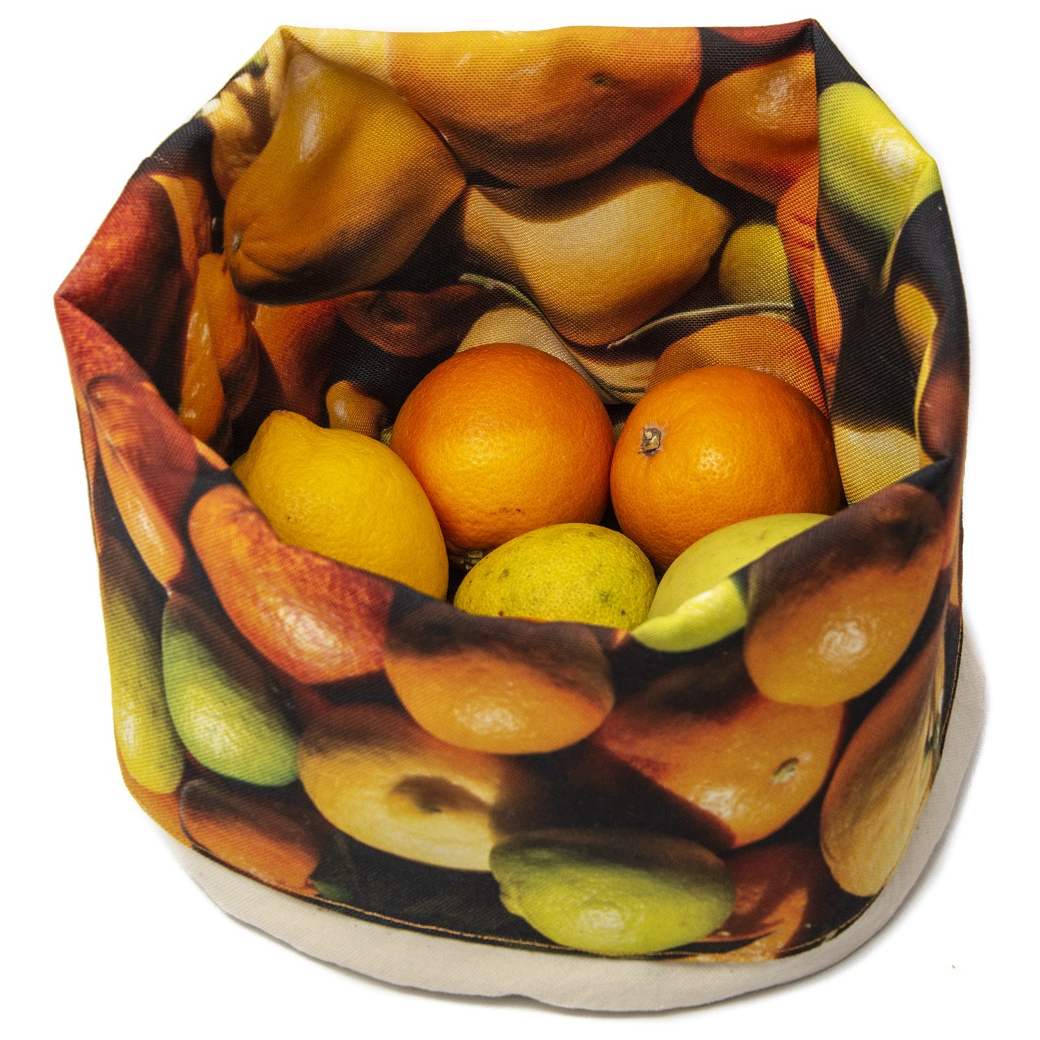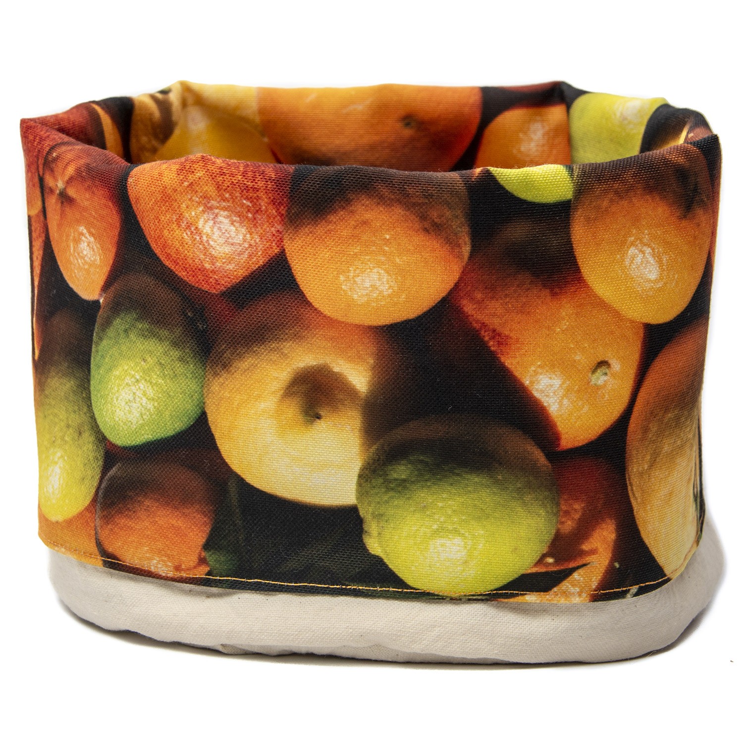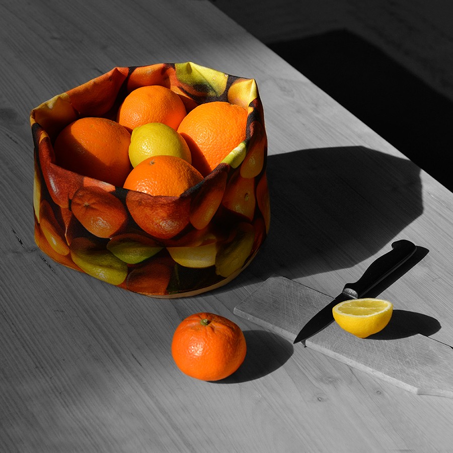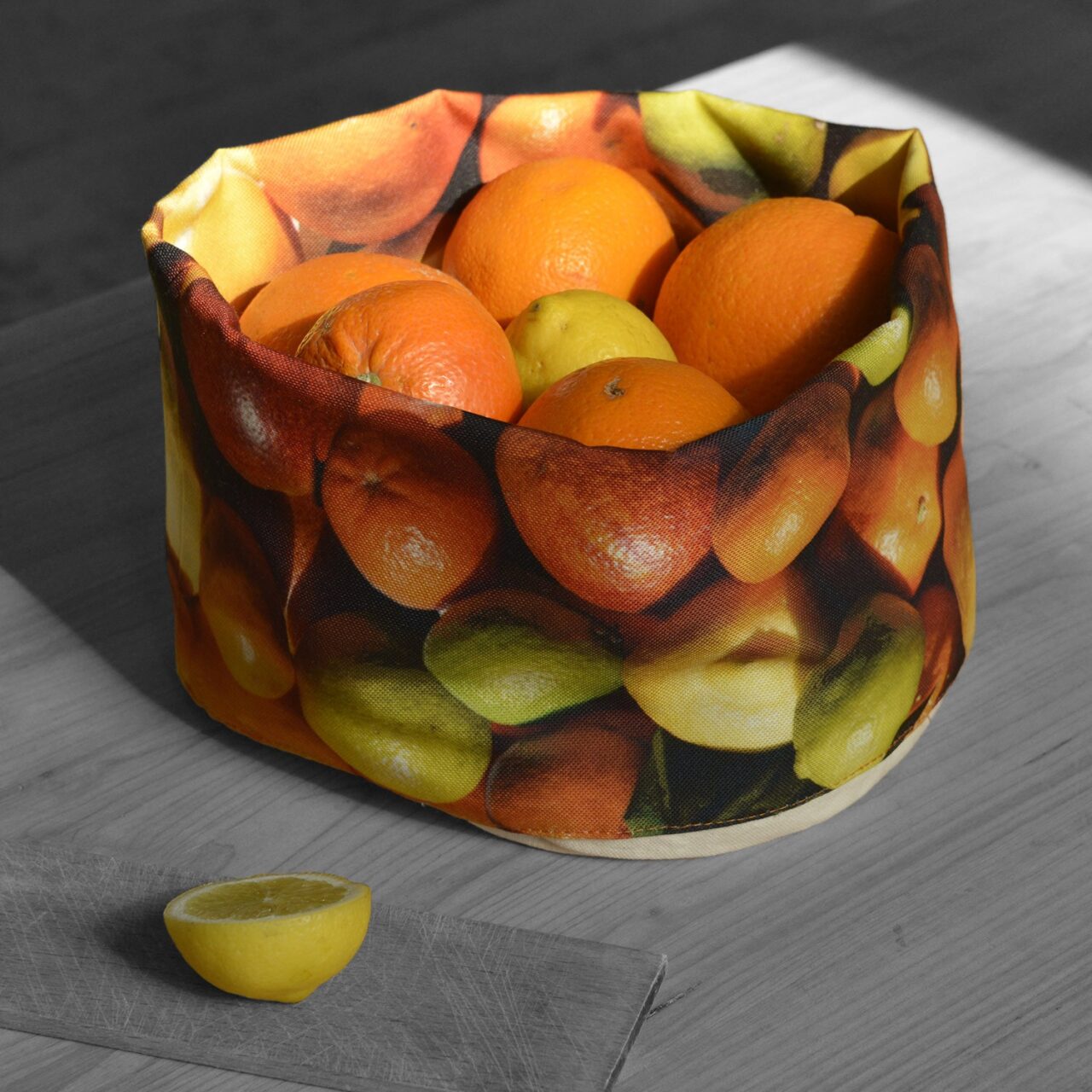 Offrez à votre cuisine une corbeille en tissus imprimée Oranges et citons de la créatrice Maron Bouillie. Écologique, cette corbeille de fruits Agrumes est fabriquée en France.