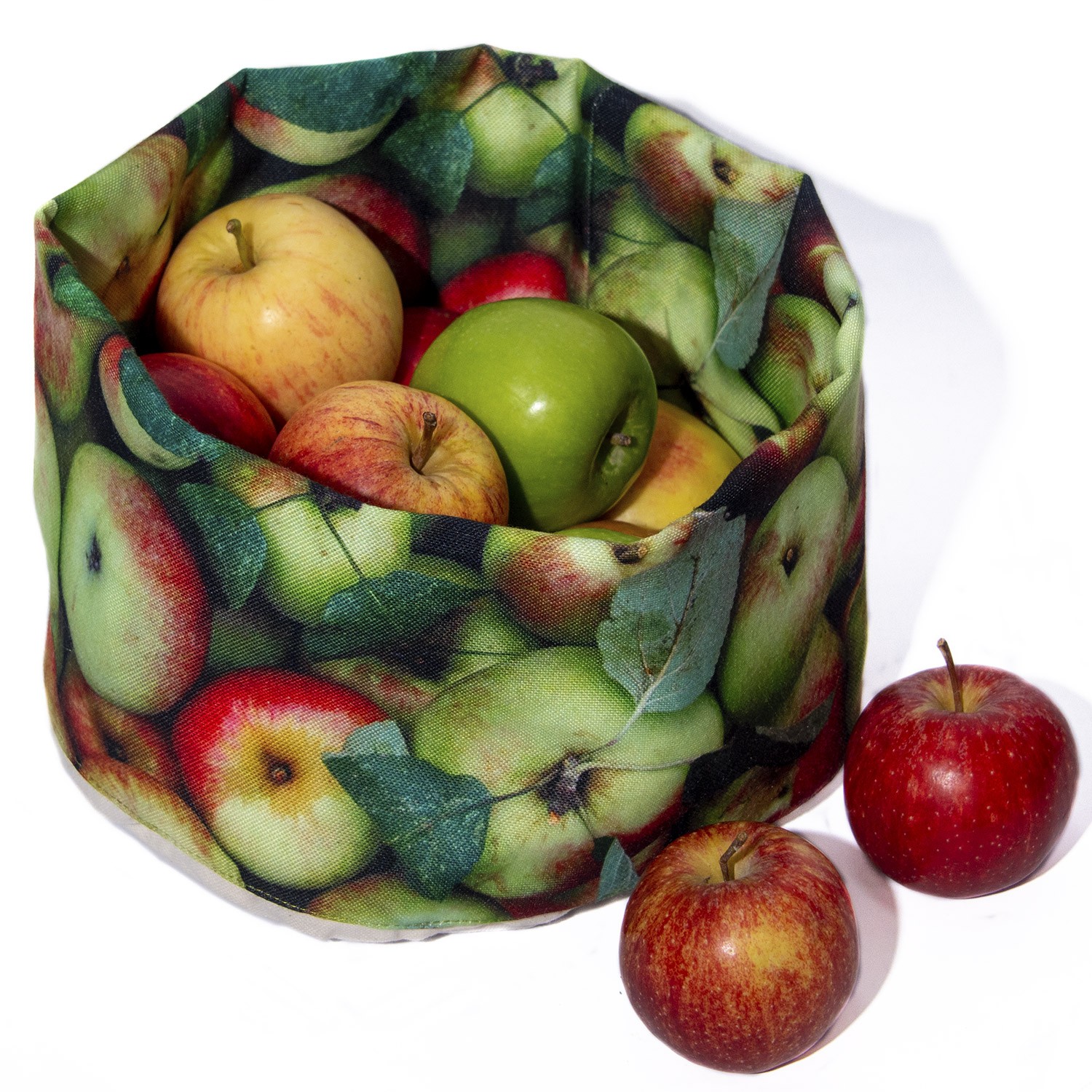 Offrez à votre cuisine une corbeille en tissu écologique imprimée Pommes de la créatrice Maron Bouillie. Cette corbeille de fruits est made in France.