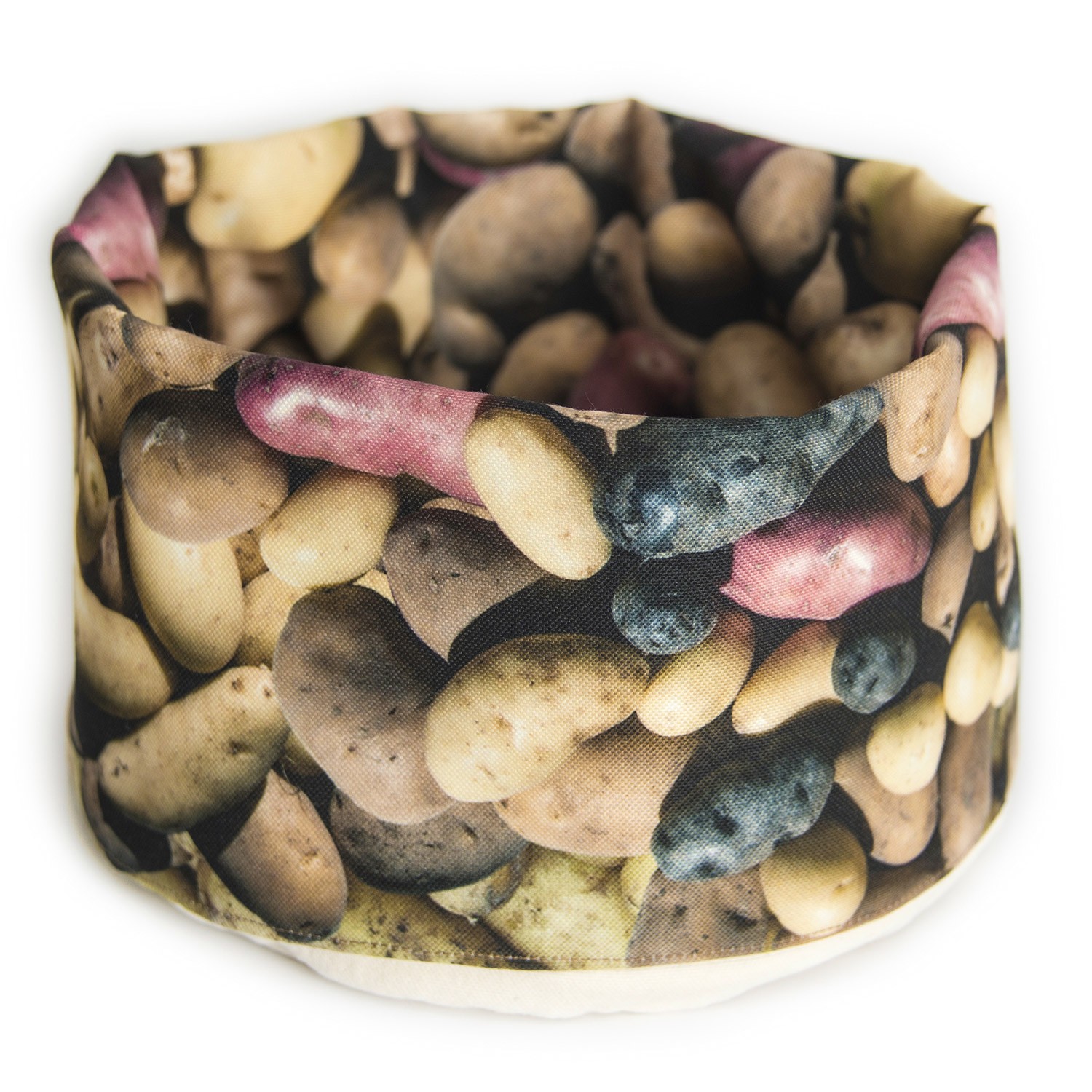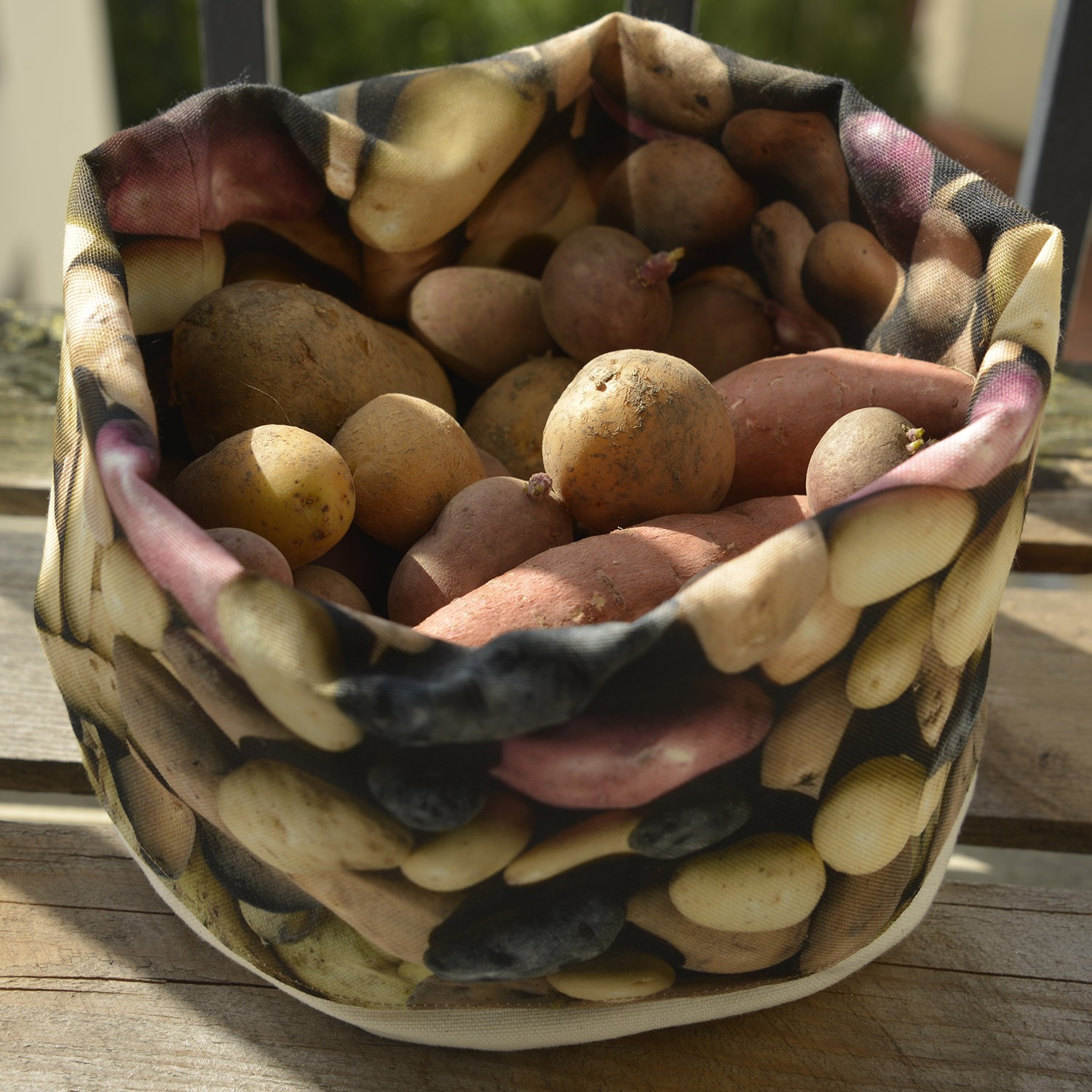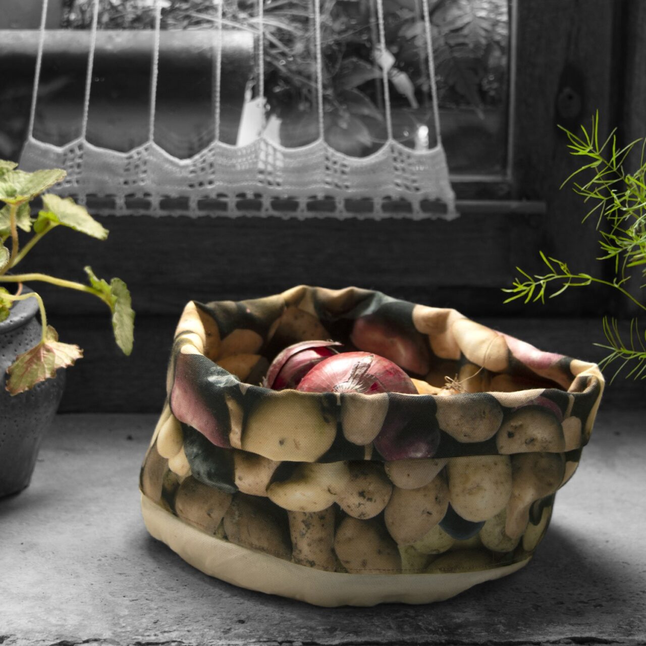 Offrez à votre cuisine une corbeille en tissu écologique imprimée légumes Pomme de terre de la créatrice Maron Bouillie. Cette corbeille déco est made in France.