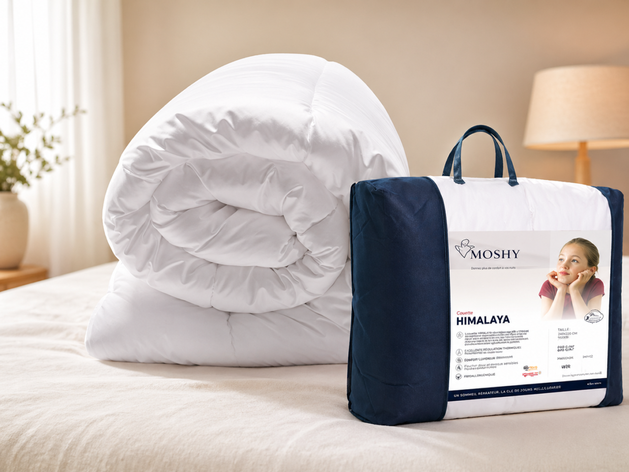 Si vous recherchez une couette synthétique plus légère, idéale pour les nuits chaudes, avec un toucher doux et une bonne respirabilité, la MOSHY HIMALAYA 250gr/m2 version été constitue une option cohérente pour un confort frais et agréable au quotidien.