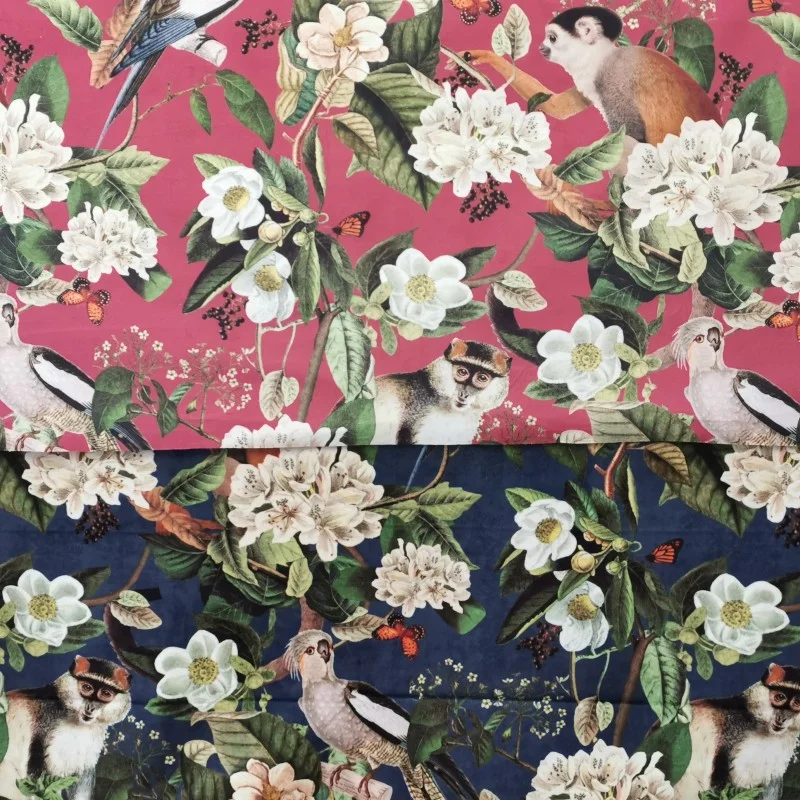 Coussin en velours très doux à motif Singe et Perroquets, de couleur rouge.Ce coussin décoratif vous fera voyager direction l'Amazonie : Un coussin bleu canard avec des singes, des perroquets, des plantesIl peut être utilisé comme coussin canapé ou encore coussin lit pour venir subtilement décorer votre intérieur.La housse de coussin seule est disponible en 40x60cm.La housse et le coussin de garnissage sont également disponibles dans cette même dimension.