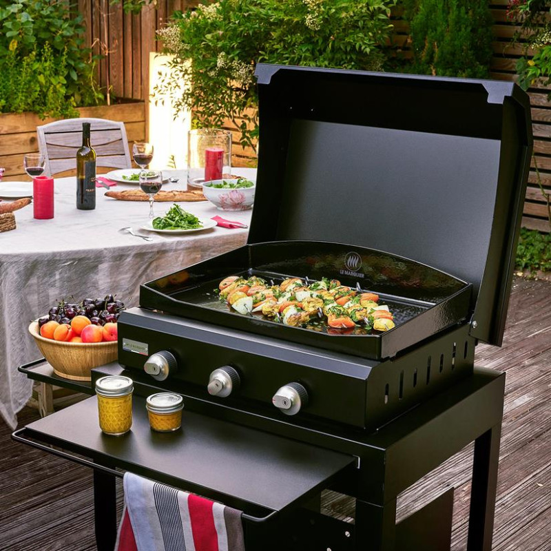 Desserte Exclusive INGENIEUSE fabriquée en France par LE MARQUIER. En acier de coloris noir. Il est terminé le temps où vous alliez mobiliser les bras forts pour changer votre plancha de place : avec cette desserte, vous allez pouvoir y poser votre plancha et la déplacer au gré de vos envies.