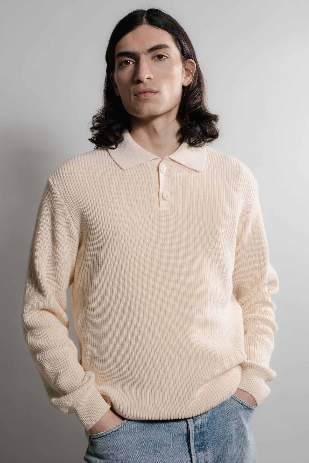 Le polo Djivan se distingue par sa maille perlée, offrant un relief et une texture uniques. Tricoté en jauge 7, il présente une maille dense et ronde qui assure un tombé élégant et confortable. Le col en maille pleine offre une structure nette, tandis que les manches longues tombantes lui donnent un style moderne et décontracté. La patte de boutonnage comporte deux boutons en corozo — matériau naturel provenant de la noix d’un palmier, fabriqués et teints en France, dans la baie de Somme. Matière : 100% coton peigné, labelissé OEKO-TEX standard 100 Tricotage : maille perlée serrée pour une bonne tenue Bords-côtes resserrés aux poignets et bas de pièce Toucher : doux et confortable Poids : 800 grammes en taille L