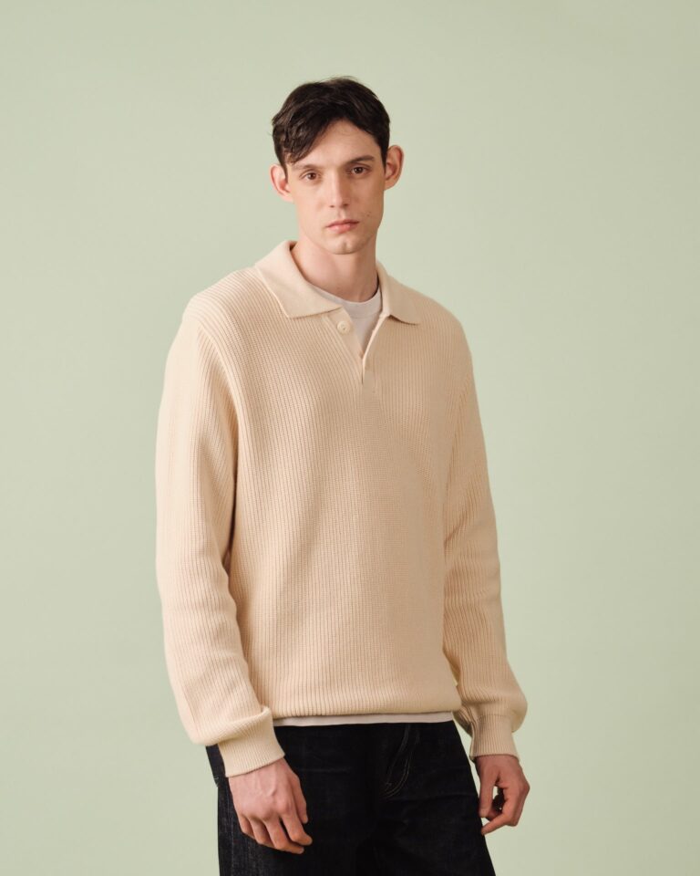 Entièrement fabriqué en France, dans notre atelier, le polo Djivan se distingue par son tricotage en maille perlée, qui lui apporte du relief et une texture visuelle unique. Tricoté en jauge 7, il possède une maille dense et relativement lourde, offrant une belle tenue et un tombé élégant.