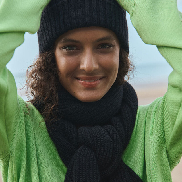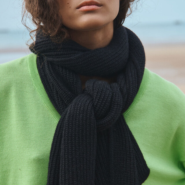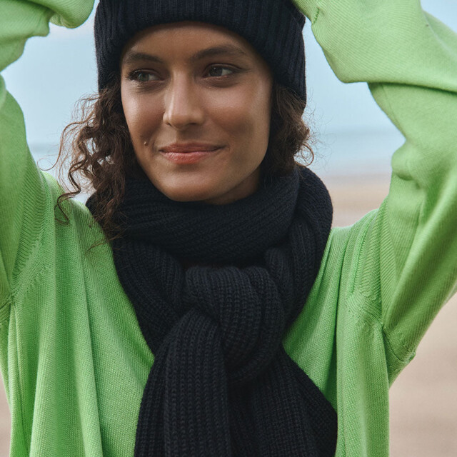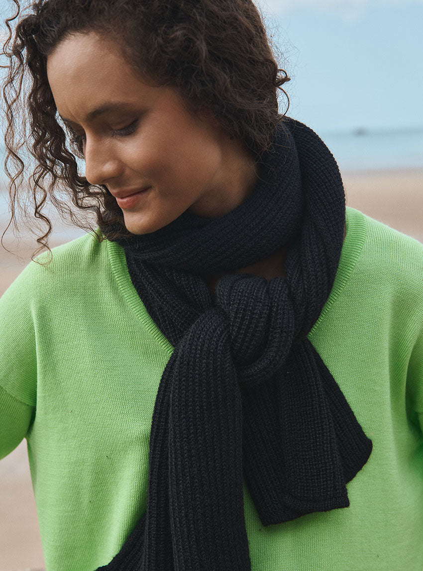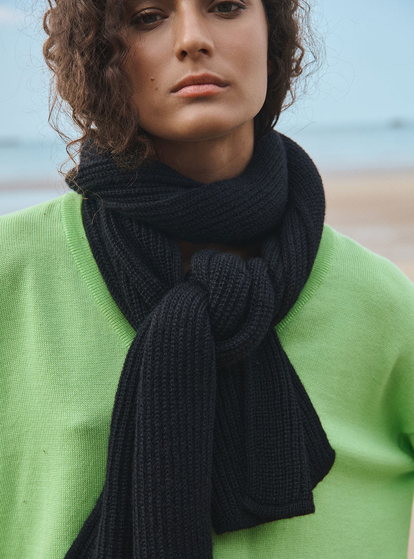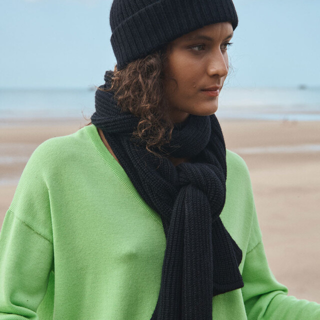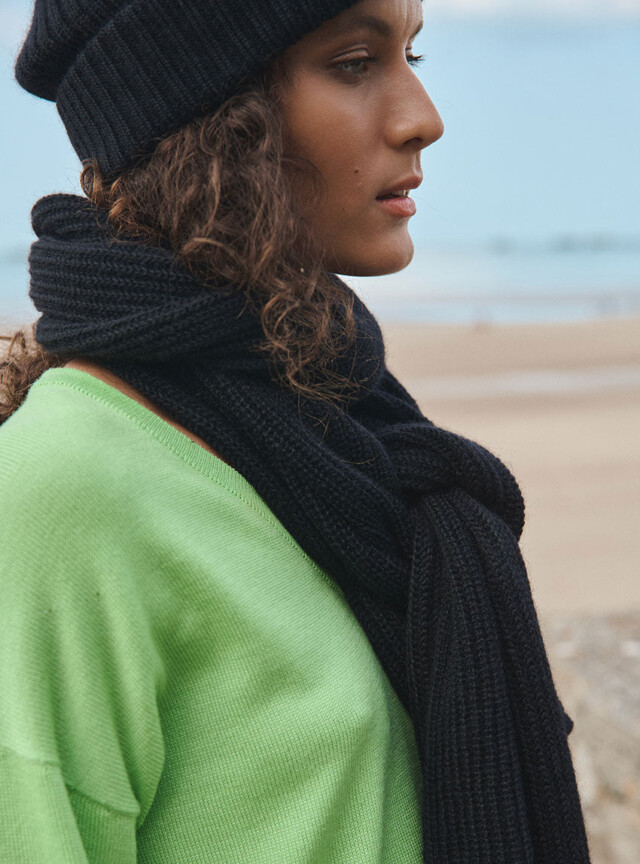 L’écharpe longue Alix en noir est un indispensable du dressing hivernal. Tricotée en maille côtelée à base de mohair, elle offre une chaleur enveloppante tout en restant souple et agréable à porter. Portée avec le bonnet Ambre coordonné, elle compose un duo sobre et élégant. Un accessoire intemporel qui s’adapte à tous les looks.