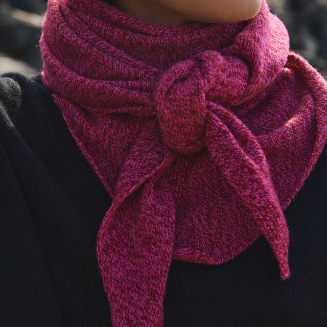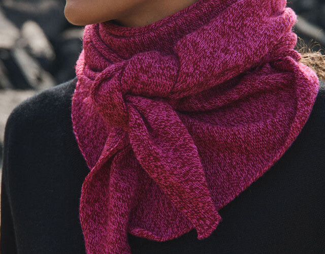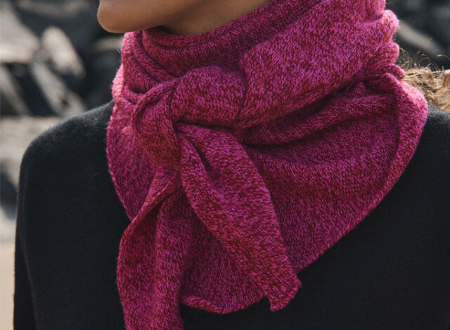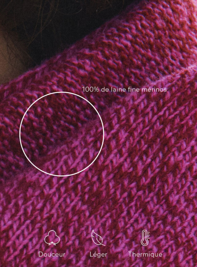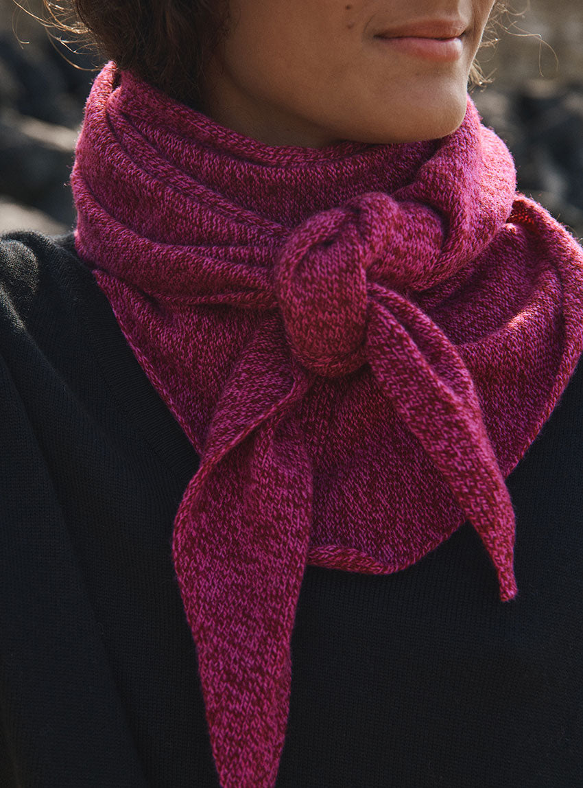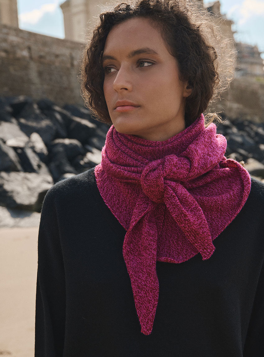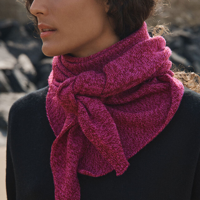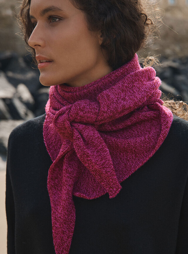 Évane est une écharpe en pointe tricotée en 100 % laine mérinos, douce, légère et naturellement chaude. Son coloris rose mouliné apporte une touche lumineuse et féminine à tous vos looks d’hiver.