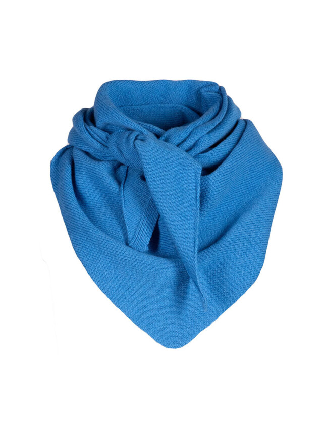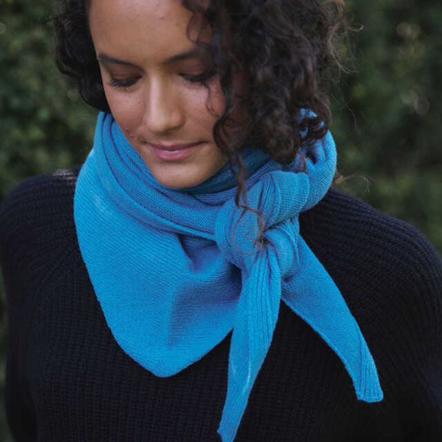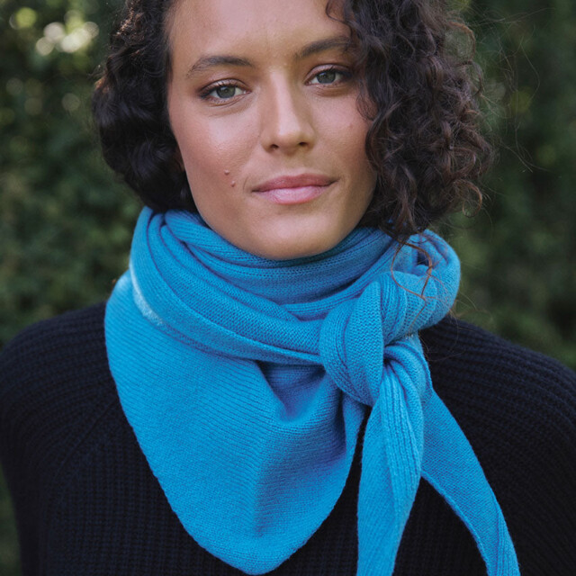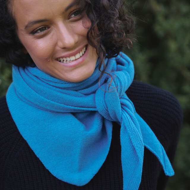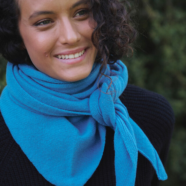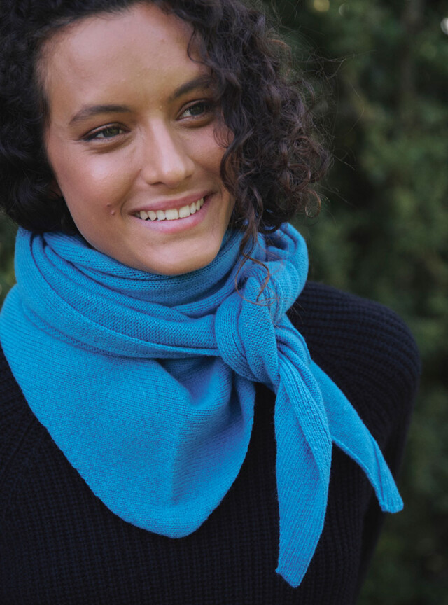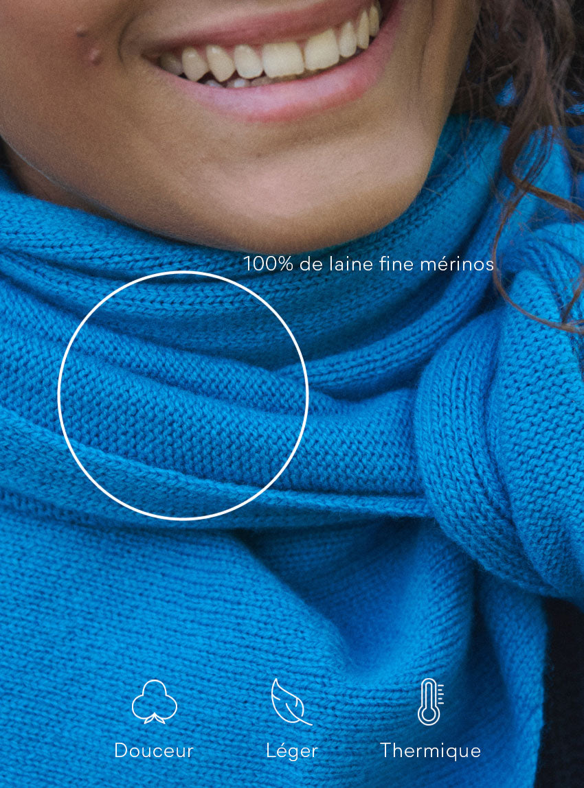 Évane est une écharpe en pointe en 100 % laine mérinos, tricotée en France dans une maille douce, chaude et respirante. En bleu céramique, elle illumine vos tenues avec fraîcheur et élégance.